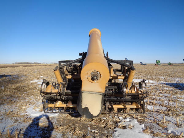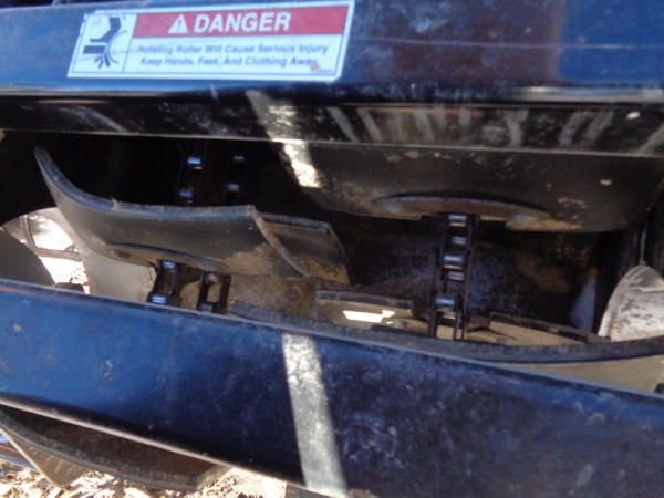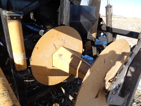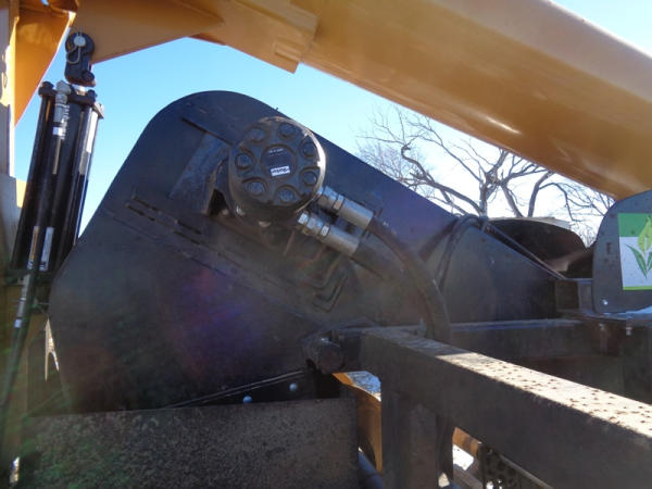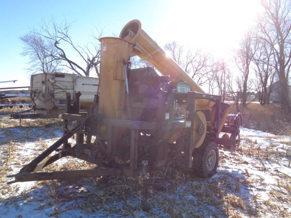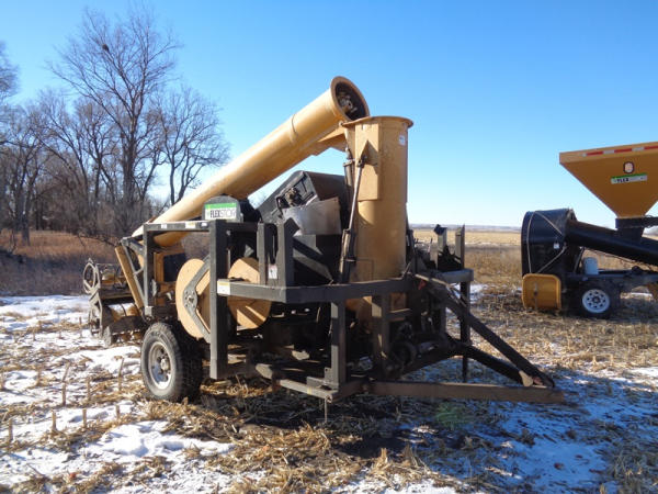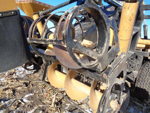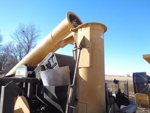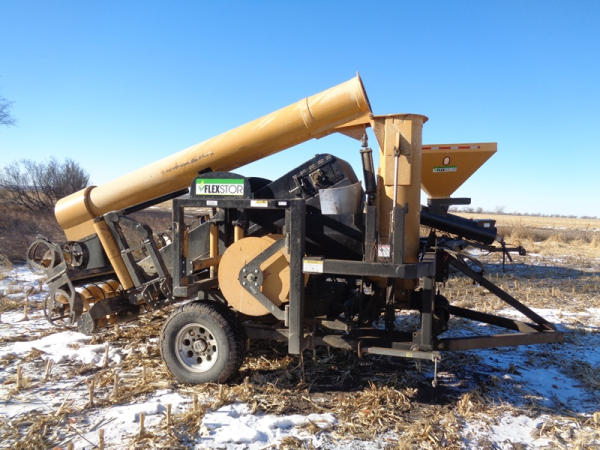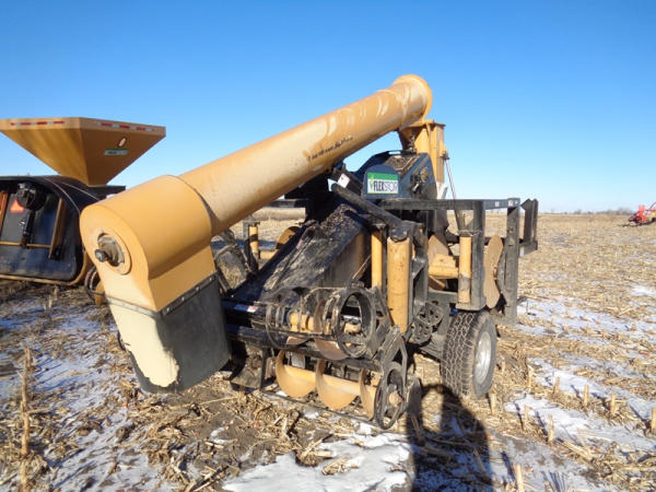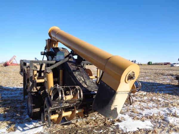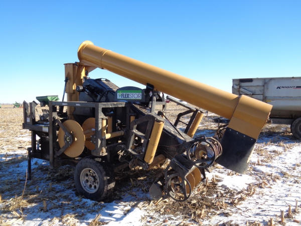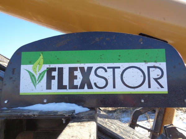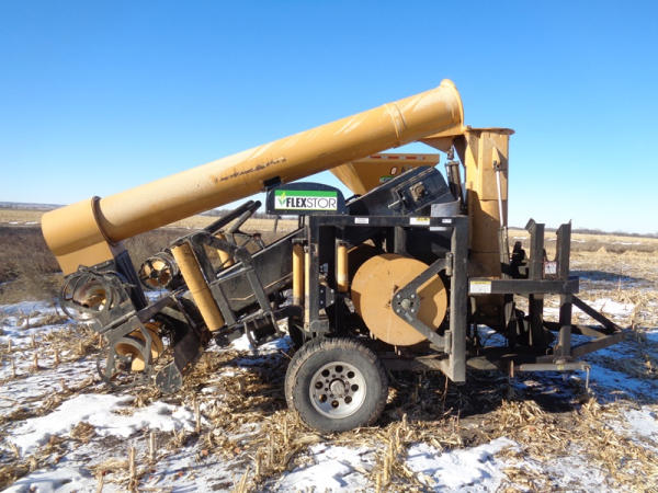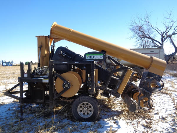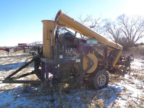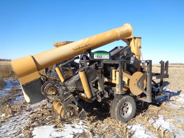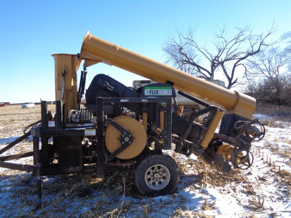 FlexStor Grain Bag Unloader (PZ8210), FlexStor grain bag unloading system, hydraulic auger, rubber paddle conveyor, PTO, bag wheels, controls.