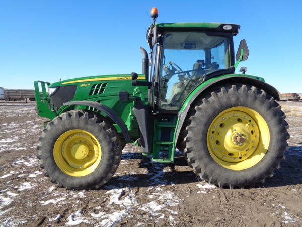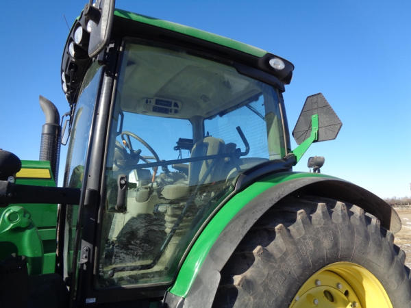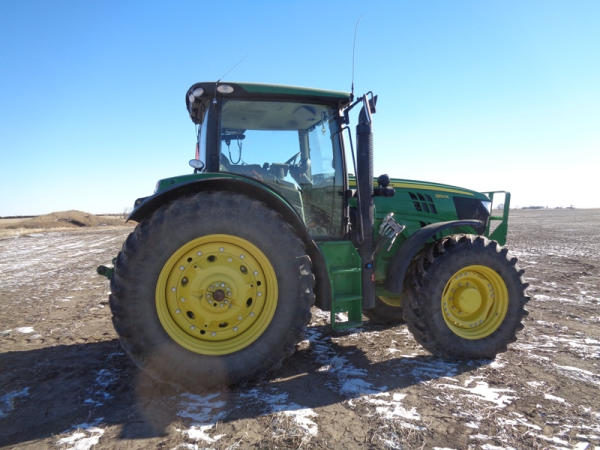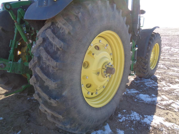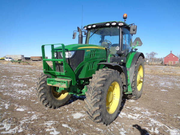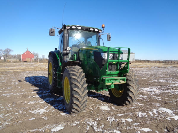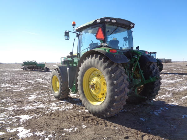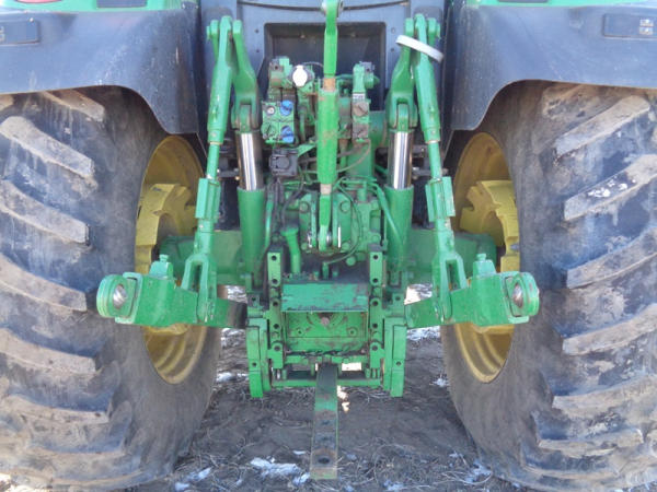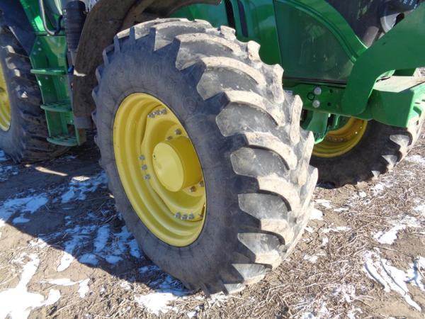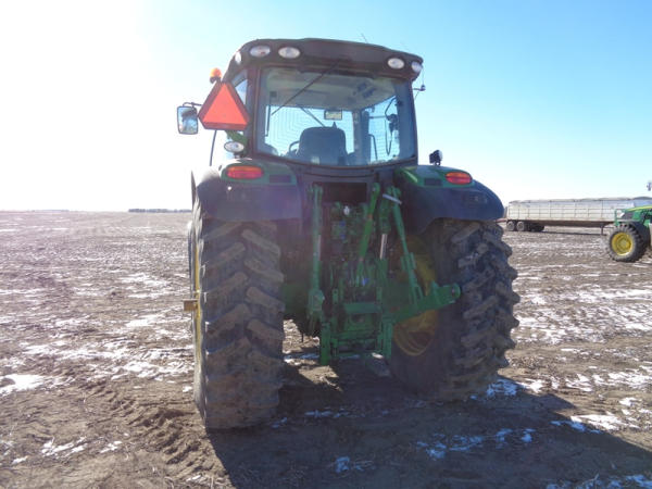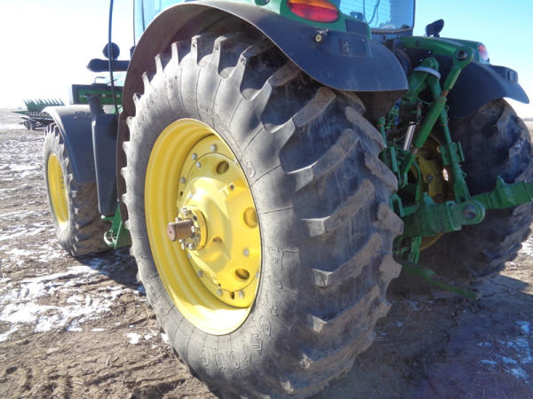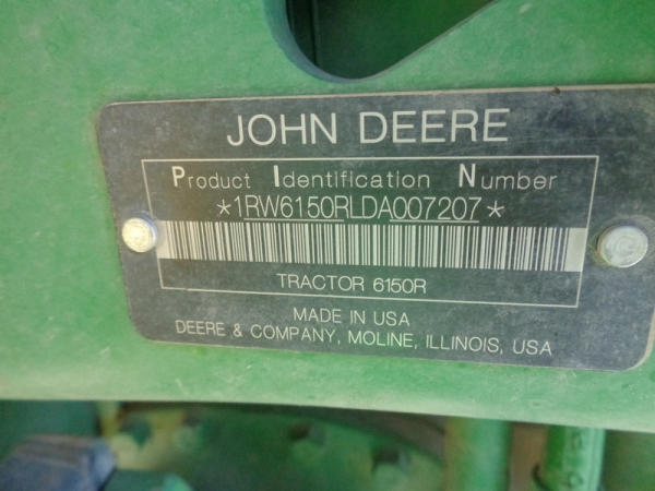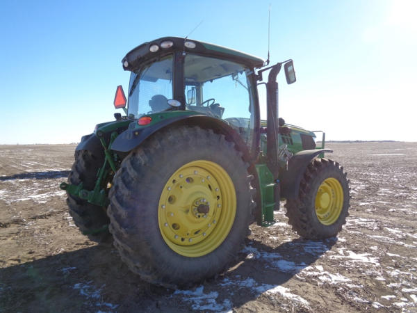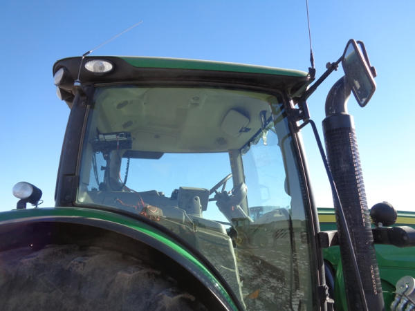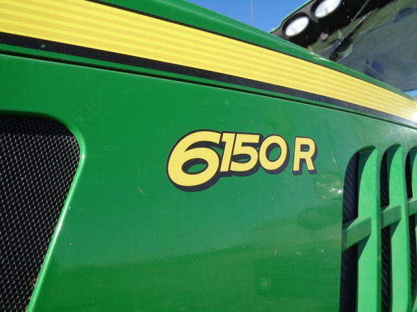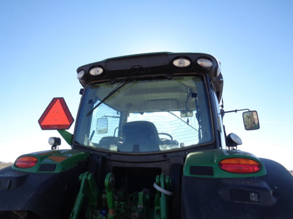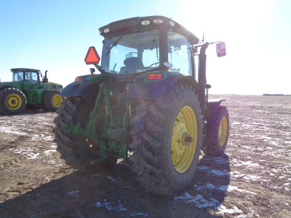 2013 John Deere 6150R MFWD Tractor (PZ8241), John Deere diesel engine, air conditioning, heat, Am/Fm CD stereo, Beacon light, buddy seat, 3 port hydraulics, PTO, 3-point, Firestone Radial All Traction FWD 16.9R30 front tires, Firestone 20.8R42 rear tires, rear wheel weights, shows 3273 hours.