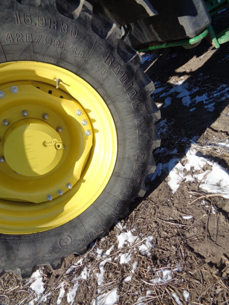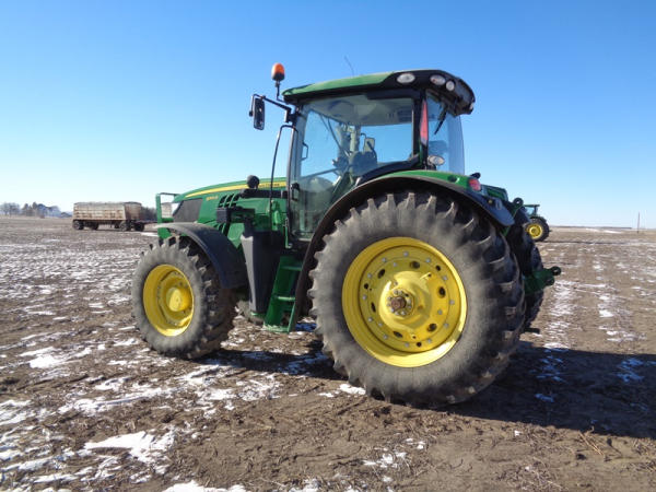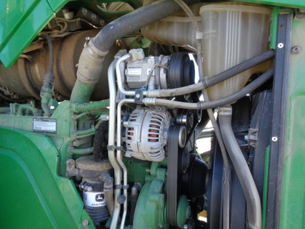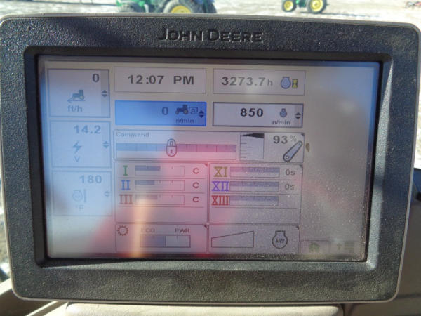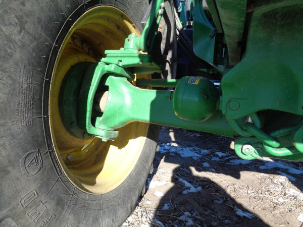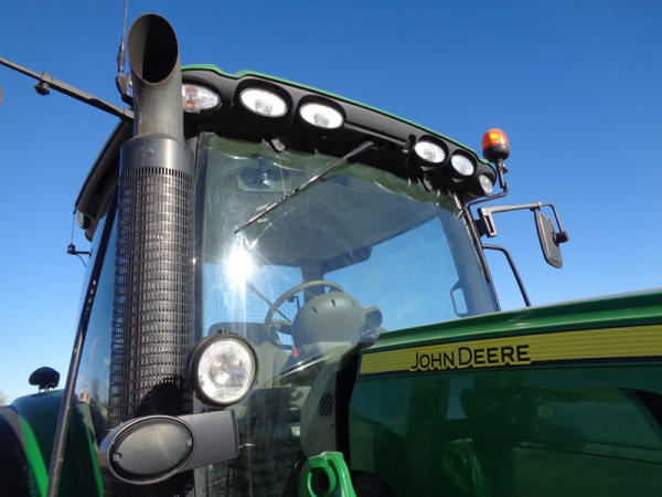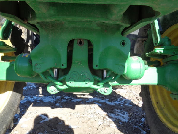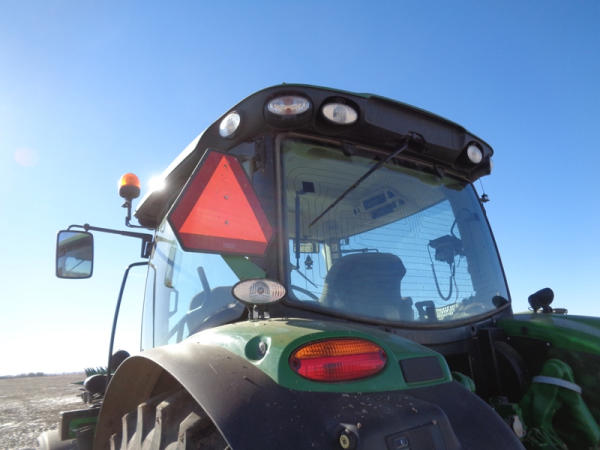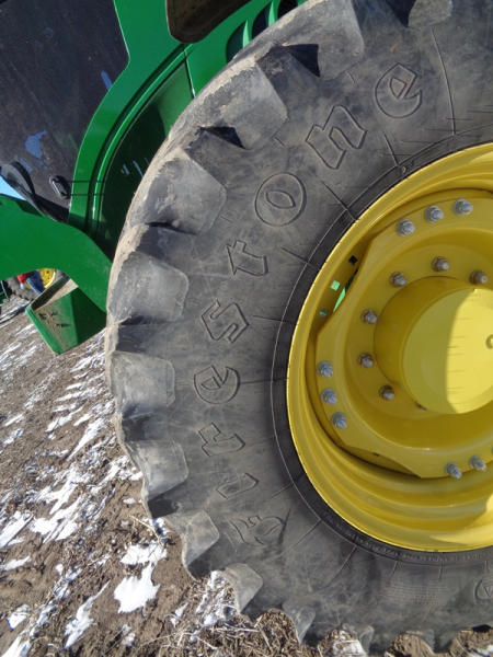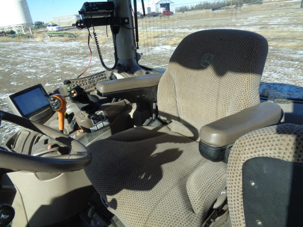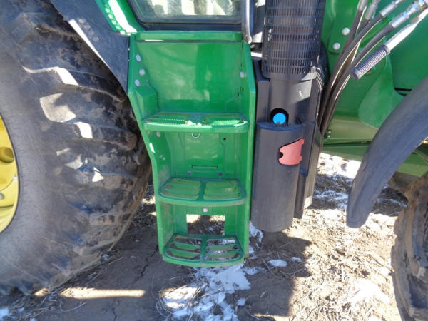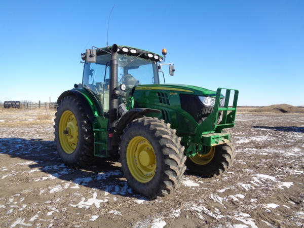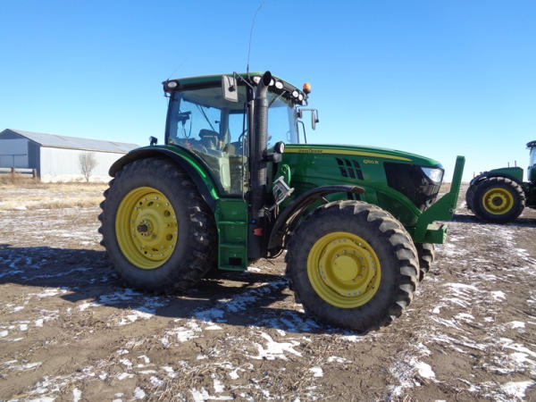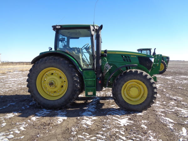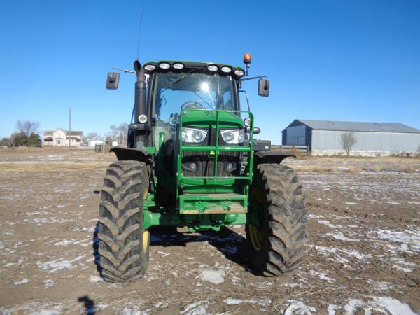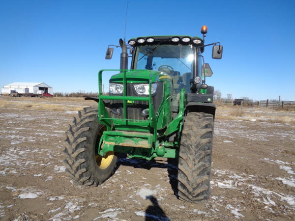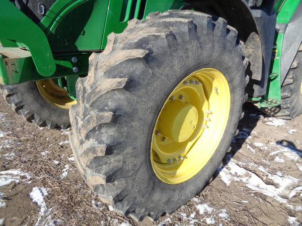 2013 John Deere 6150R MFWD Tractor (PZ8241), John Deere diesel engine, air conditioning, heat, Am/Fm CD stereo, Beacon light, buddy seat, 3 port hydraulics, PTO, 3-point, Firestone Radial All Traction FWD 16.9R30 front tires, Firestone 20.8R42 rear tires, rear wheel weights, shows 3273 hours.