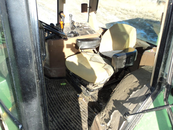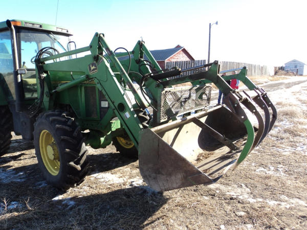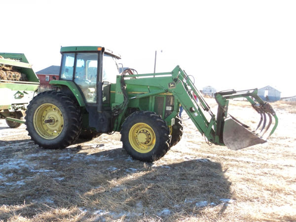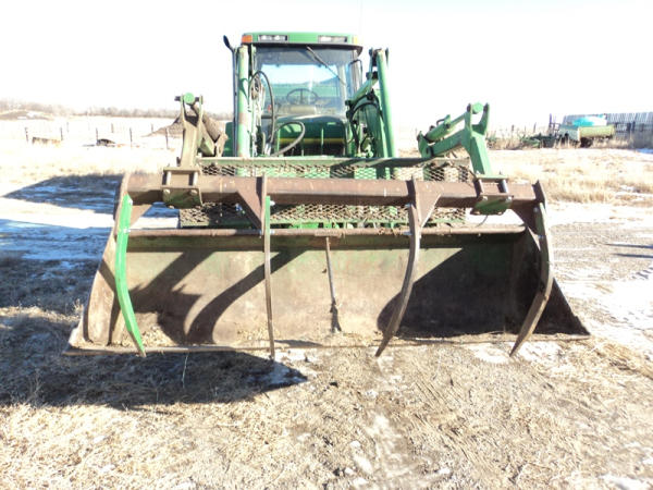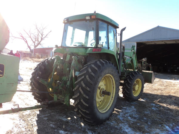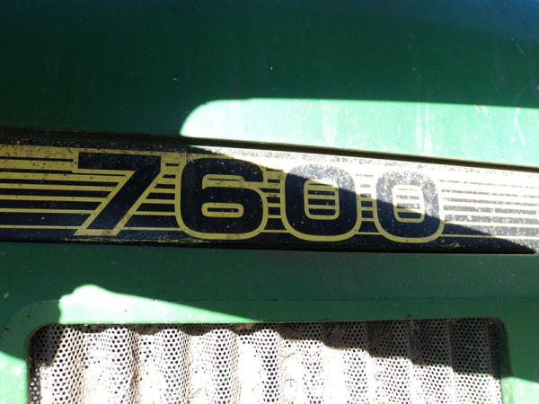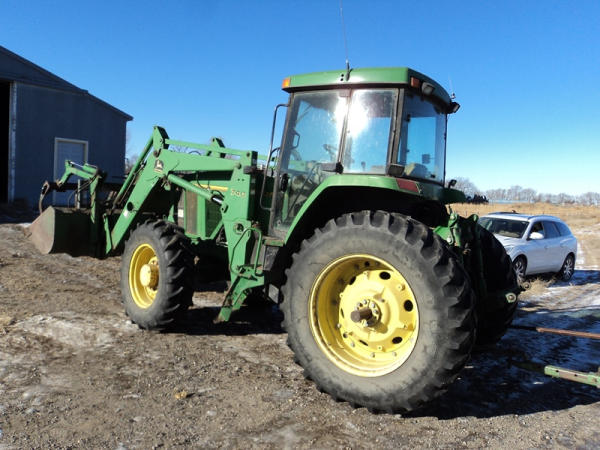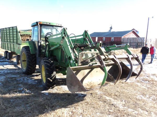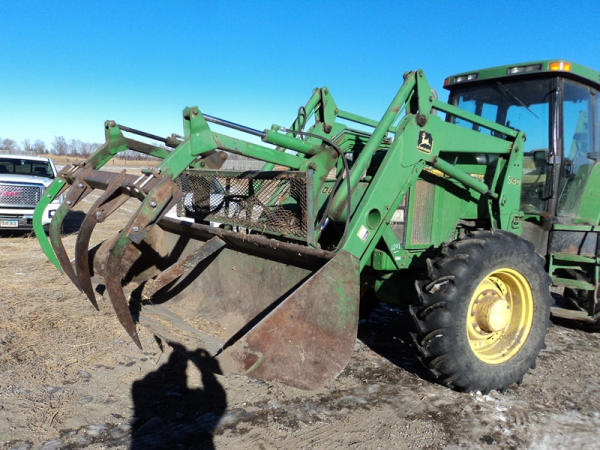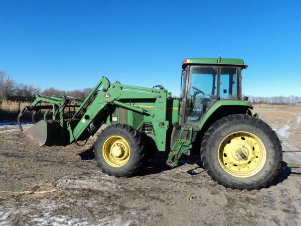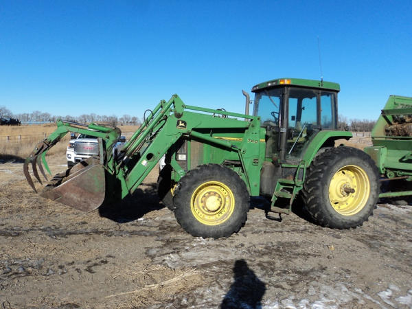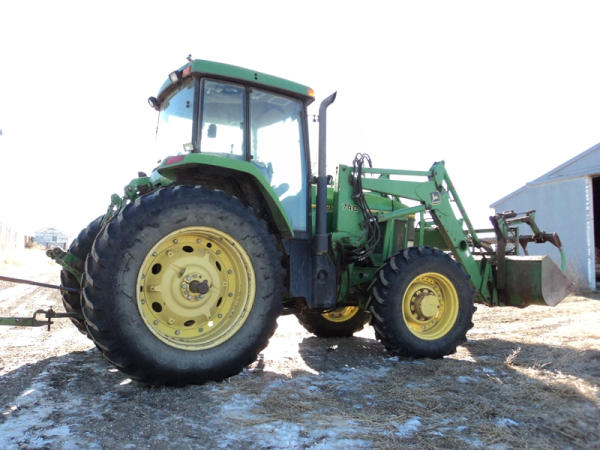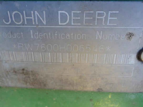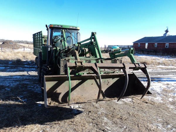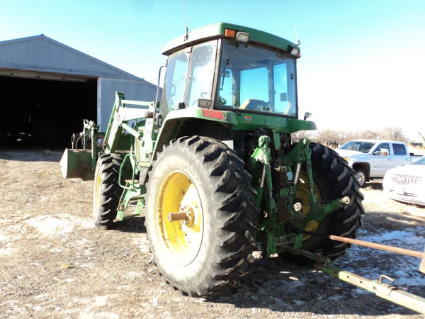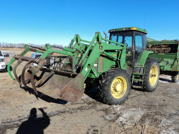 1995 John Deere 7600 MFWD Loader/Tractor (PZ8246), John Deere diesel engine, Powershift transmission, air conditioning, heat, 3 port hydraulics, PTO, John Deere 740 loader 8' bucket/grapple, Alliance 380/85R28 front tires, Good Year 430/80R38 rear tires, shows 11,000 hours.