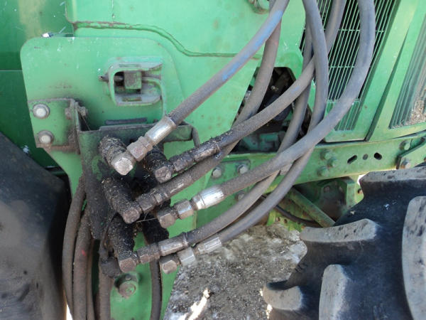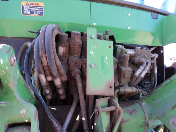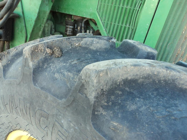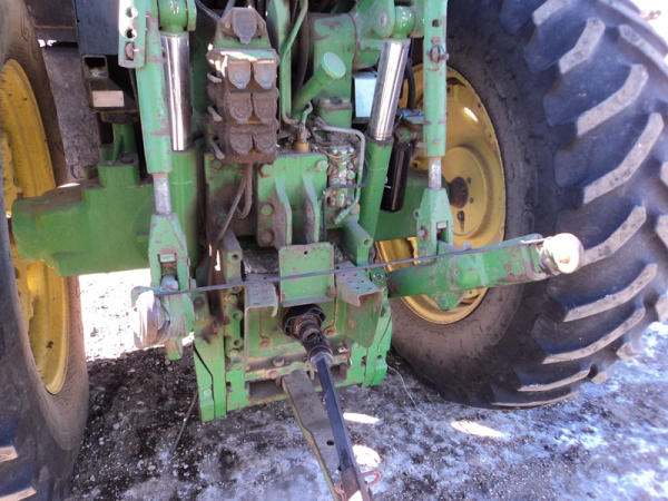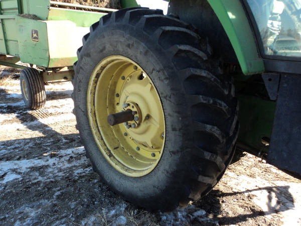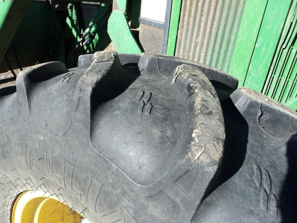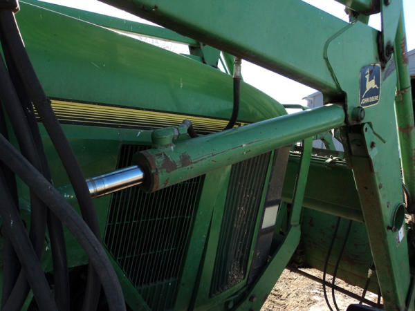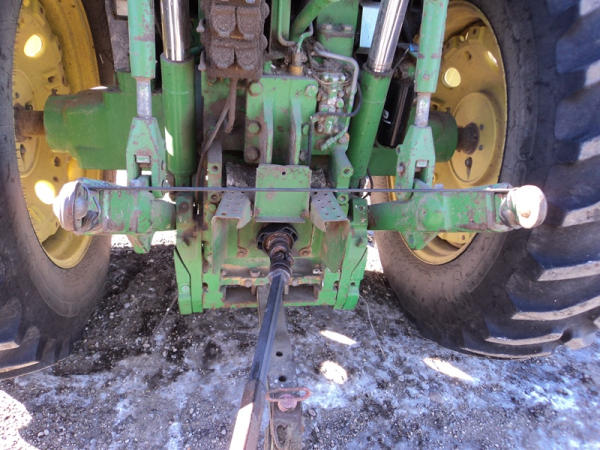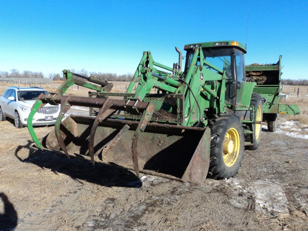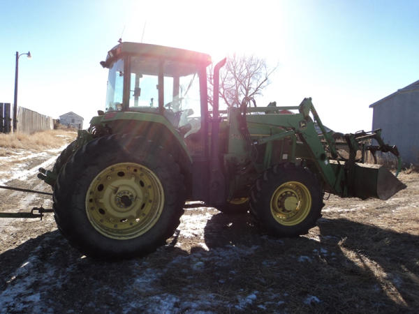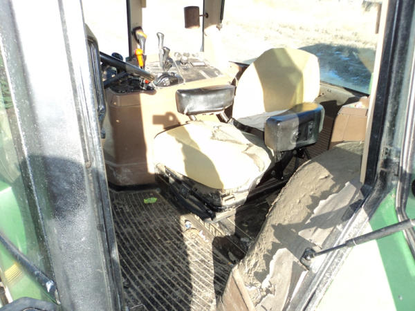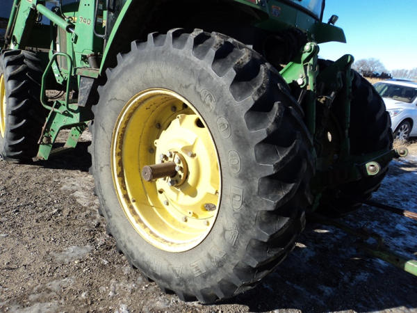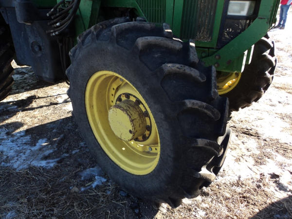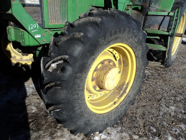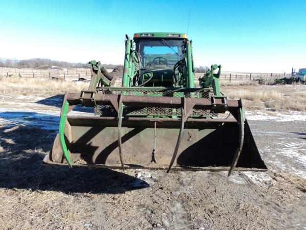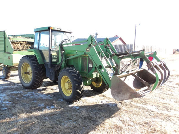 1995 John Deere 7600 MFWD Loader/Tractor (PZ8246), John Deere diesel engine, Powershift transmission, air conditioning, heat, 3 port hydraulics, PTO, John Deere 740 loader 8' bucket/grapple, Alliance 380/85R28 front tires, Good Year 430/80R38 rear tires, shows 11,000 hours.