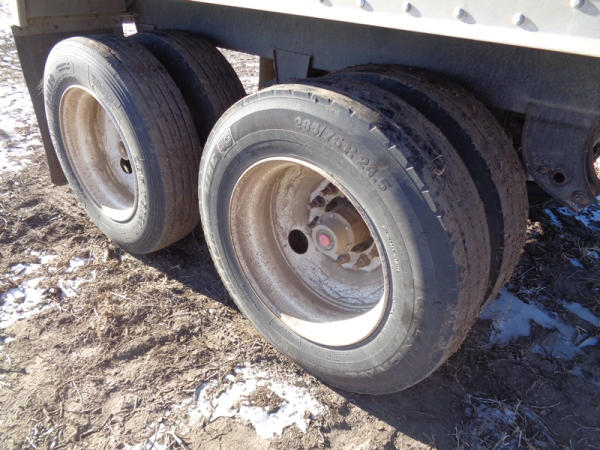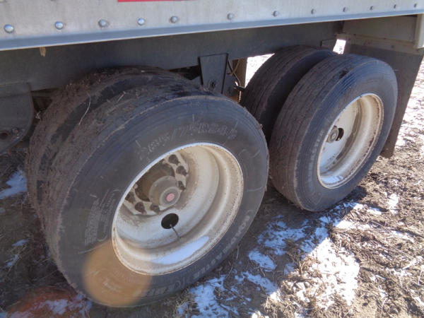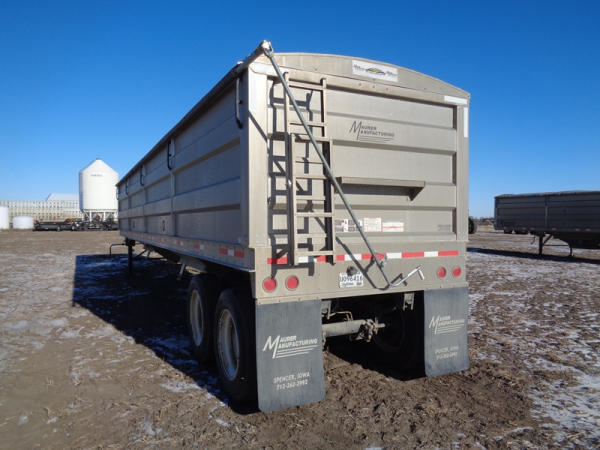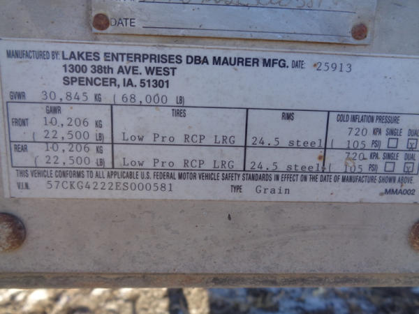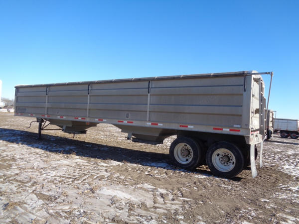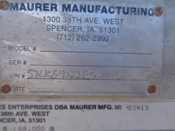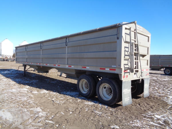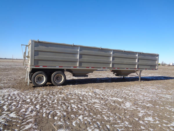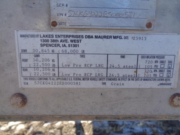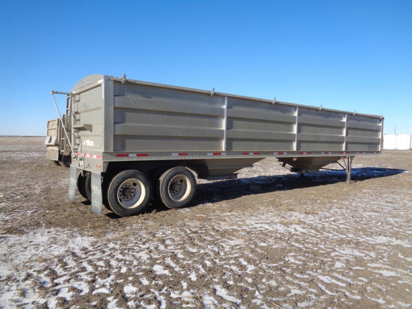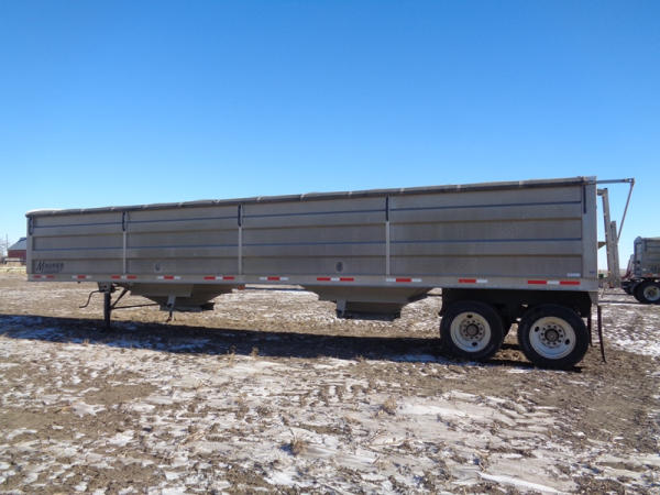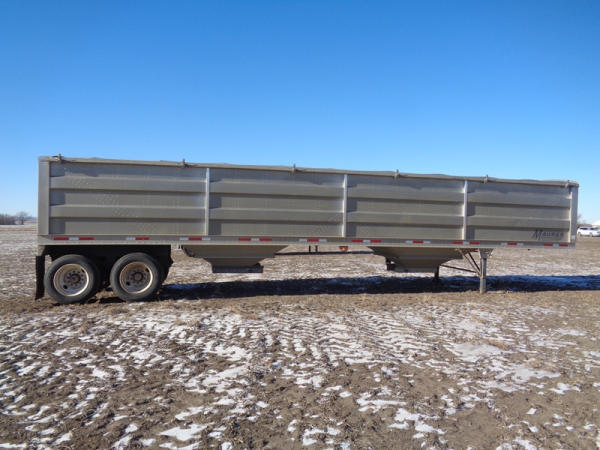 2014 Maurer Grain Trailer (PZ8234), 2014 Maurer aluminum hopper bottom grain trailer, tandem axle, spring suspension, roll over tarp, 285/75R24.5 tires.