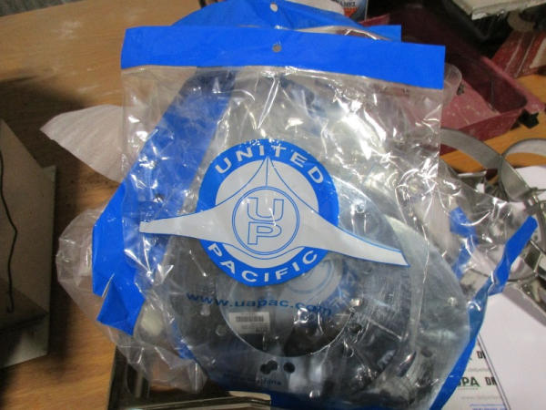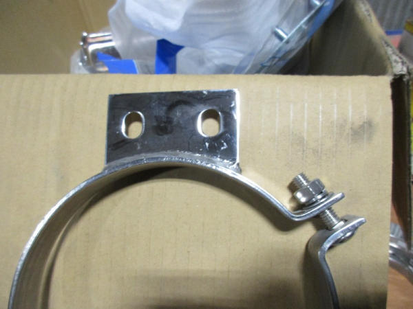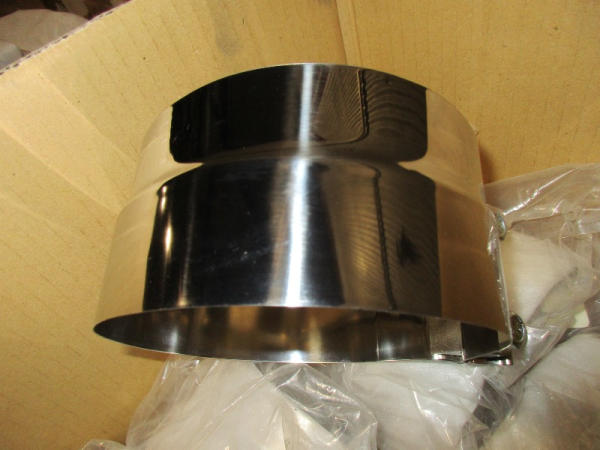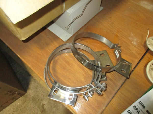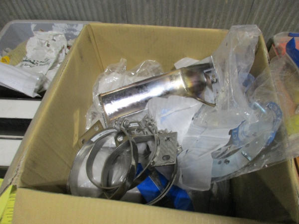NEW Stainless Steel Exhaust (DR8791), (8) 5" stainless steel exhaust clamps, (4) chrome exhaust support brackets, (4) United Pacific trailer hub caps & brackets w/universal mounts.