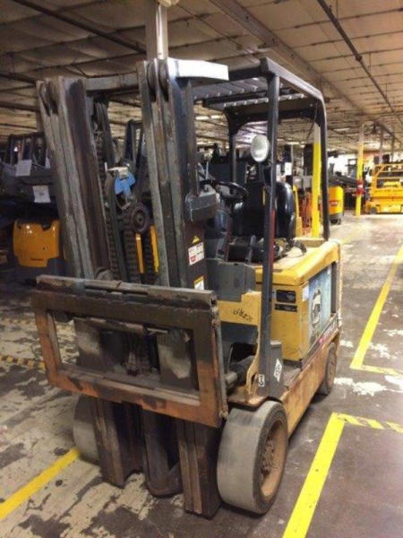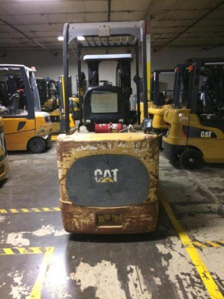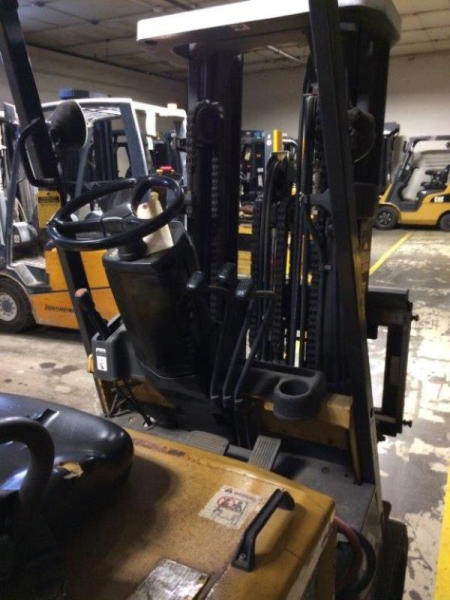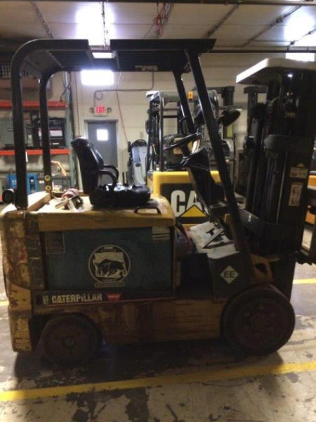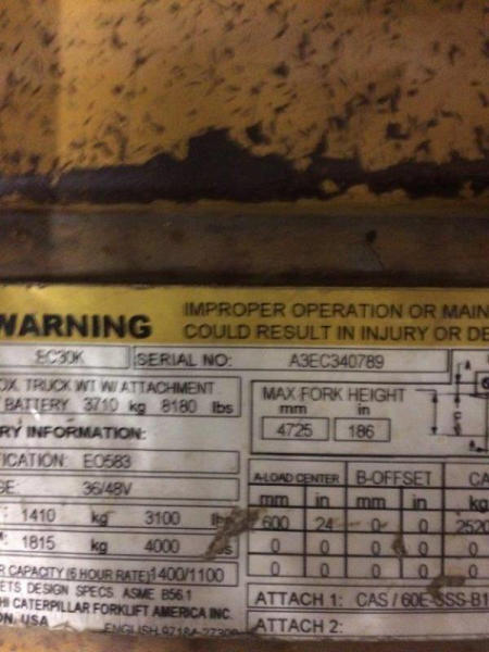 2002 CAT EC30K Forklift (PD760), mast - triple 83'-186", 90% remaining on tires & good condition, normal wear & tear on steer axle, has dent on each side of seat pan but good condition, 36v, weight 12,200lbs, height 88", width 43", length 92", hours on dr motor 4505, hours on hydraulic motor 3189.