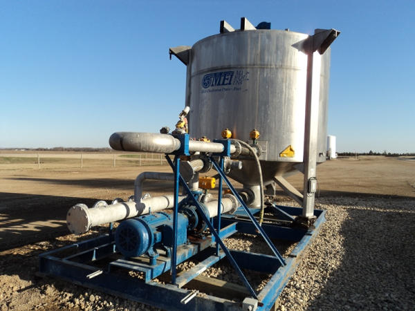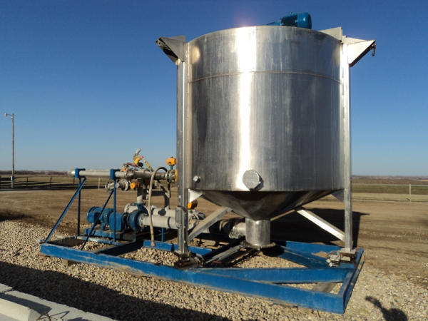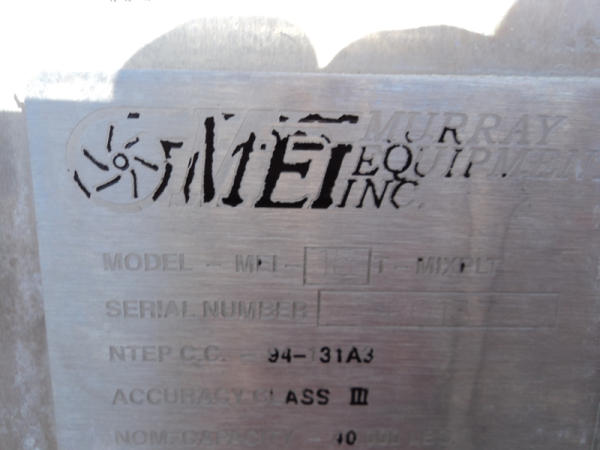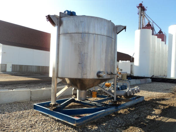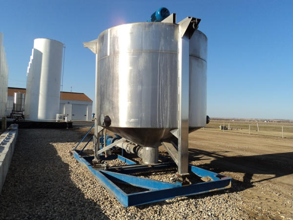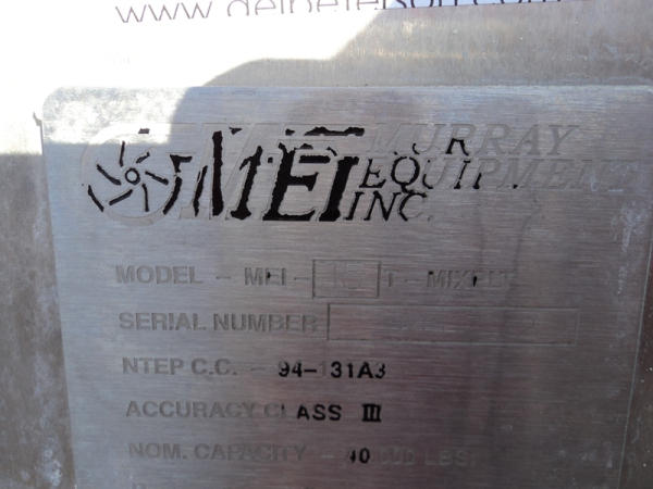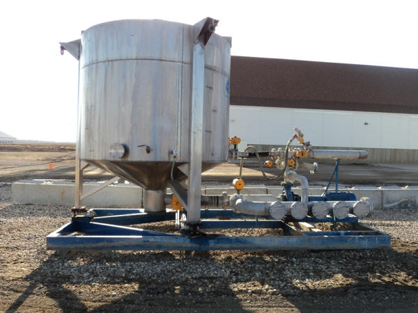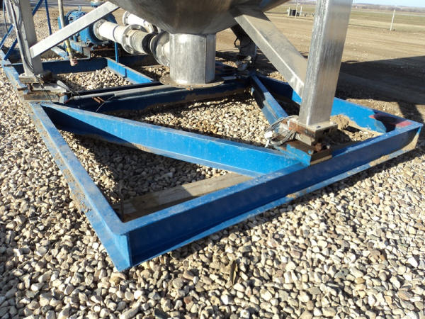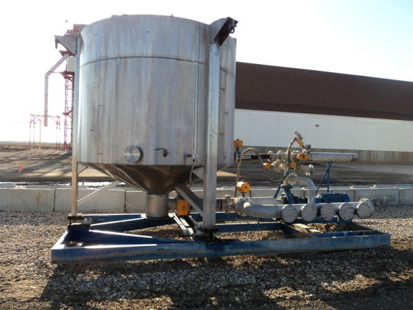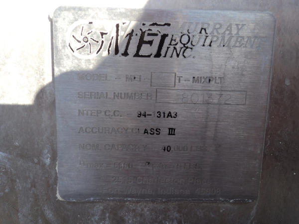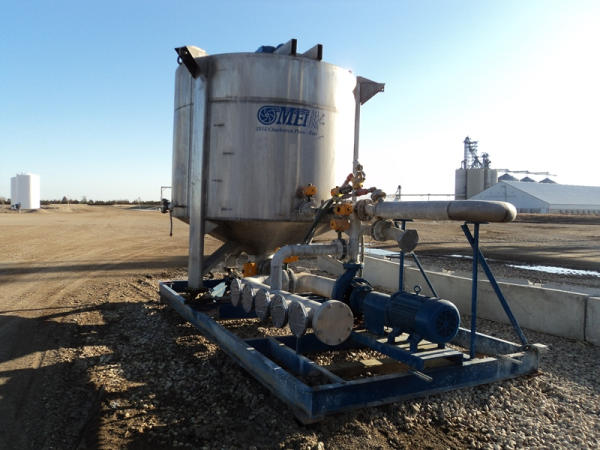 MEI 15 Ton Liquid Blender (PZ9083), MEI model - MEI - 15T - MIXPLT, 15 ton stainless steel liquid mixer, NTEP C.C. - 94-131A3, Accuracy Class III, NOM. Capacity - 40,000 lbs, 5 port manifold system, Baldor 40 hp electric motor, LaBour model A80UVA 6x4 - 13 pump (S/N 691468-1), Mettler Toledo scale sensors, digital readout, skid frame.