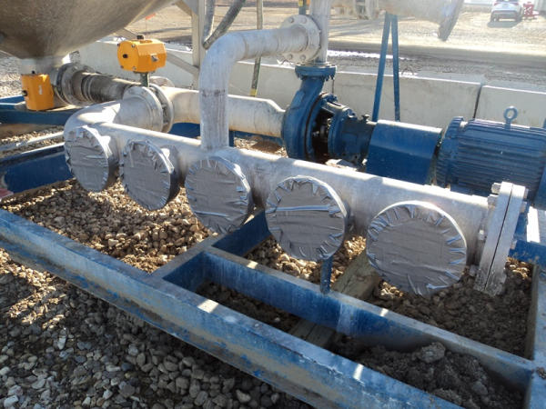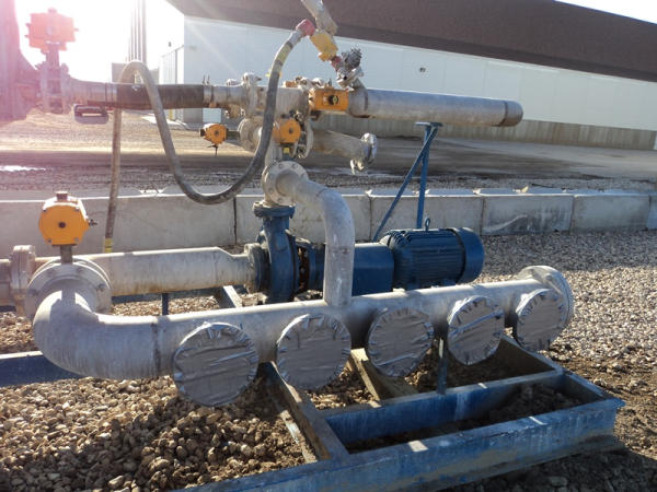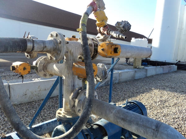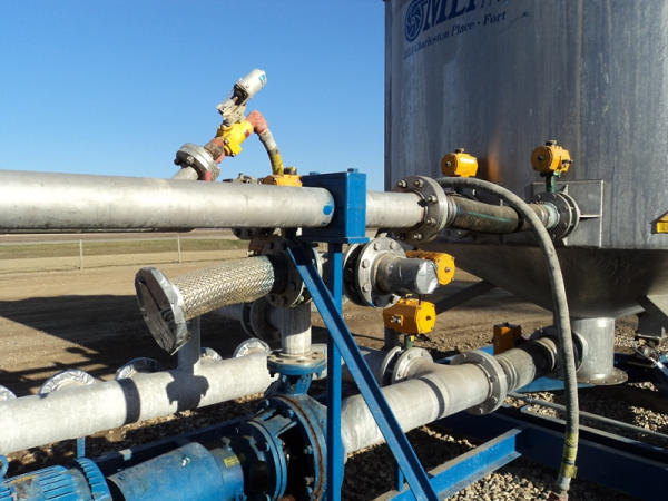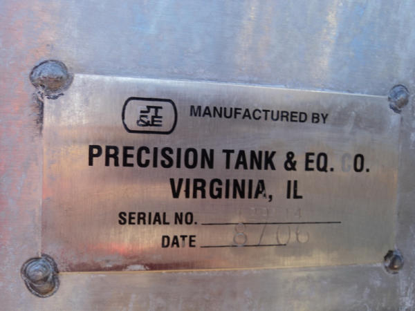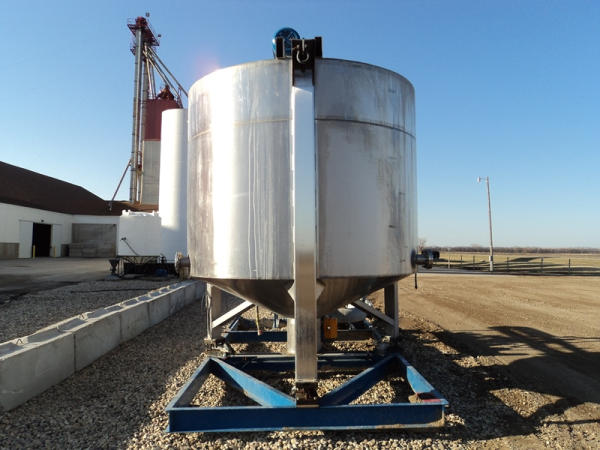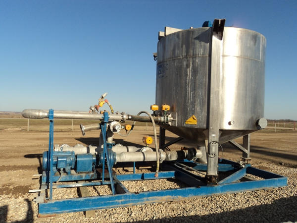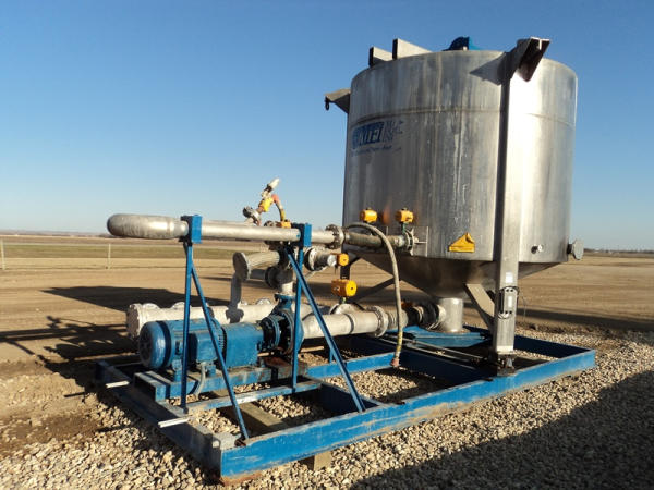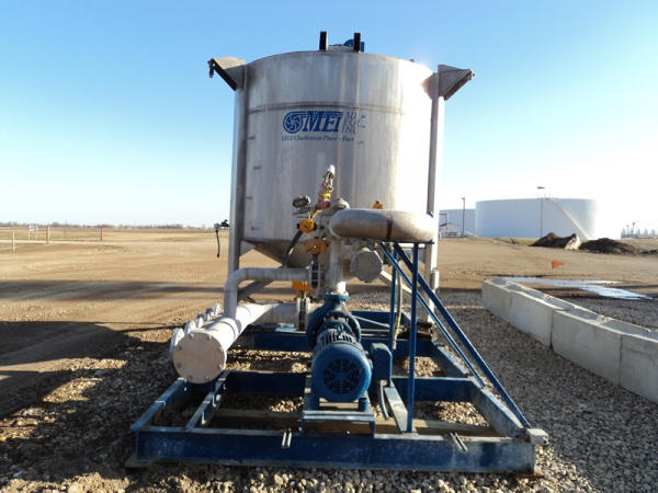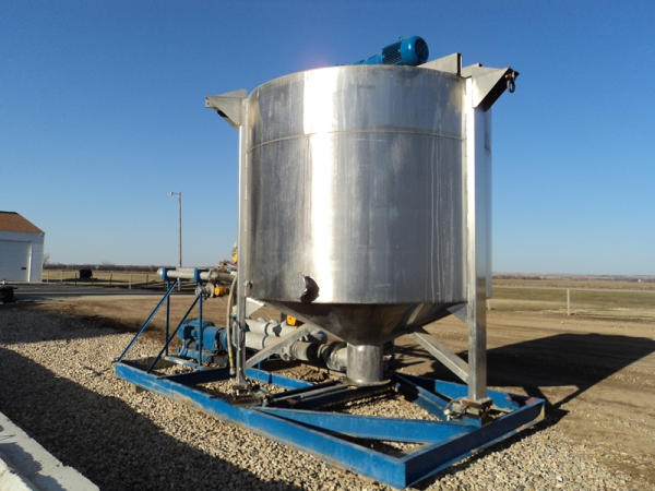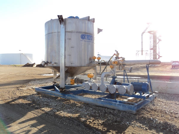 MEI 15 Ton Liquid Blender (PZ9083), MEI model - MEI - 15T - MIXPLT, 15 ton stainless steel liquid mixer, NTEP C.C. - 94-131A3, Accuracy Class III, NOM. Capacity - 40,000 lbs, 5 port manifold system, Baldor 40 hp electric motor, LaBour model A80UVA 6x4 - 13 pump (S/N 691468-1), Mettler Toledo scale sensors, digital readout, skid frame.