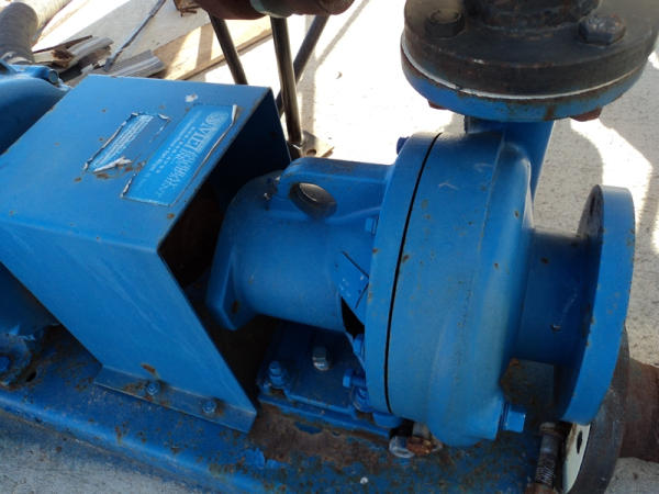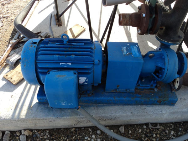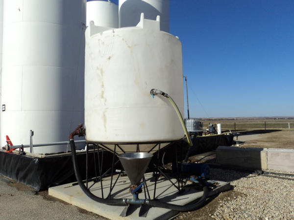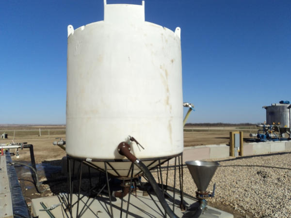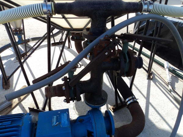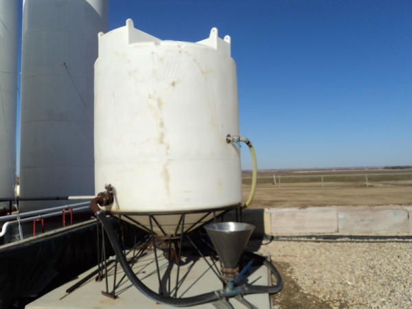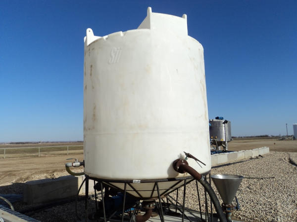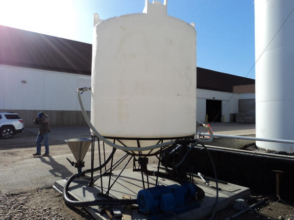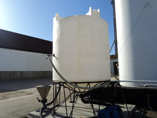 Snyder Poly Tank (PZ9092), Snyder 3000 gallon vertical poly liquid tank, stands, stainless steel chemical inductor, 25 hp electric motor, MP pump.