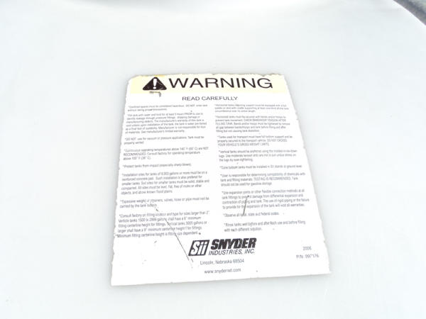 Snyder Liquid Tank (PZ9104), Snyder 2600 gallon poly liquid tank, valve, lid.