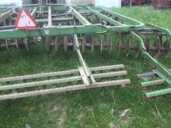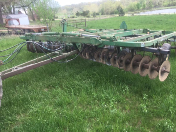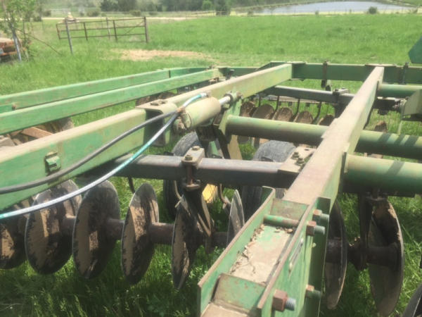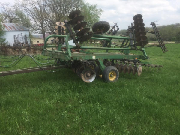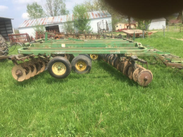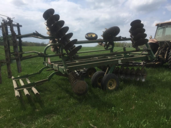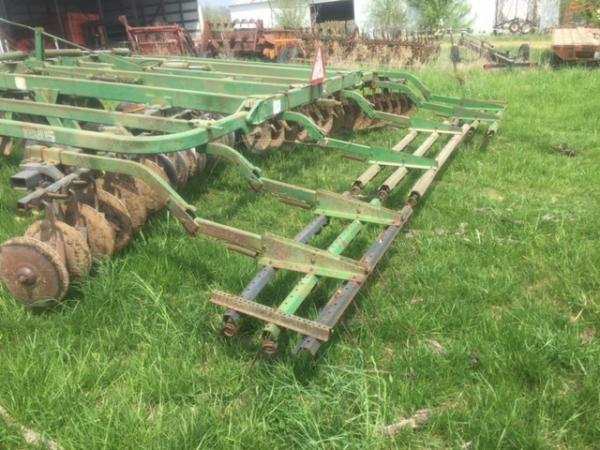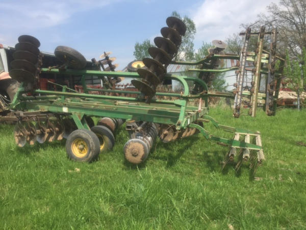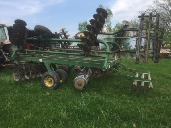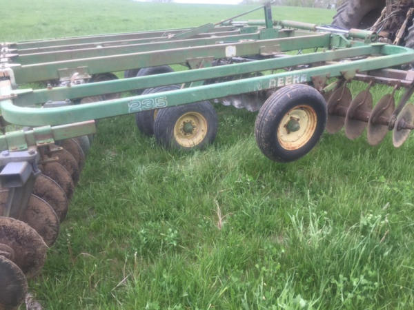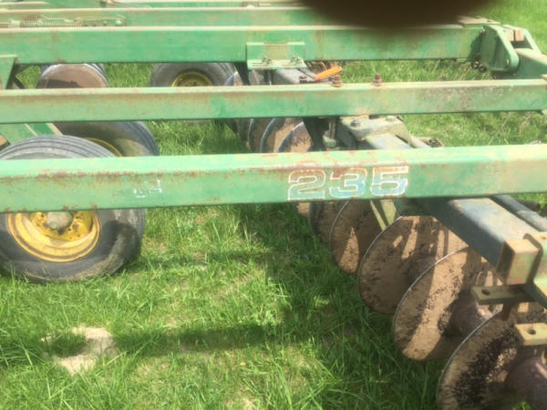 John Deere 235 Disk (NP6614), 24' width, 3 section, hydraulic wings, 19" discs, with harrow, 9.5L-15 tires.