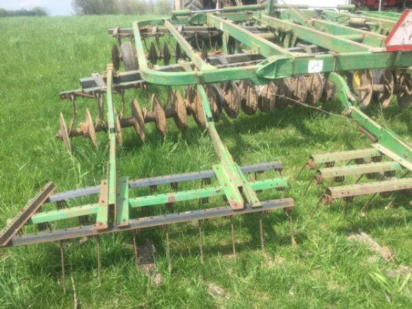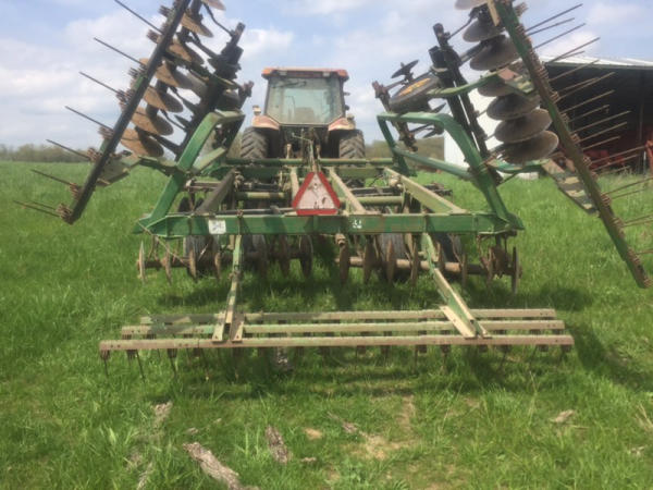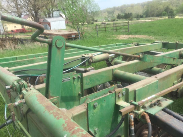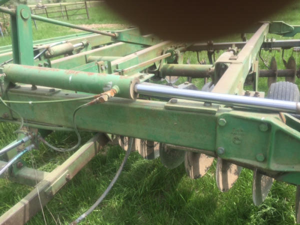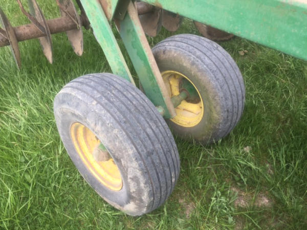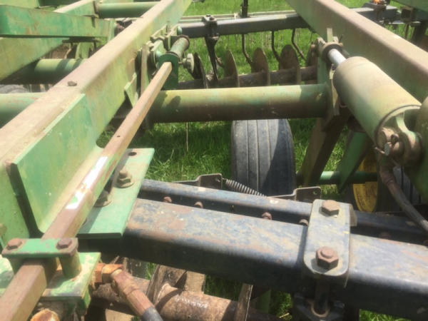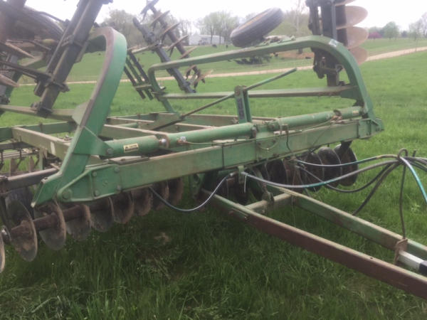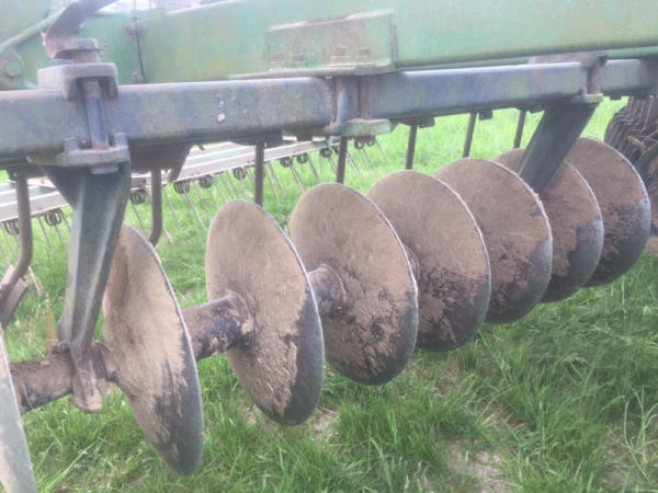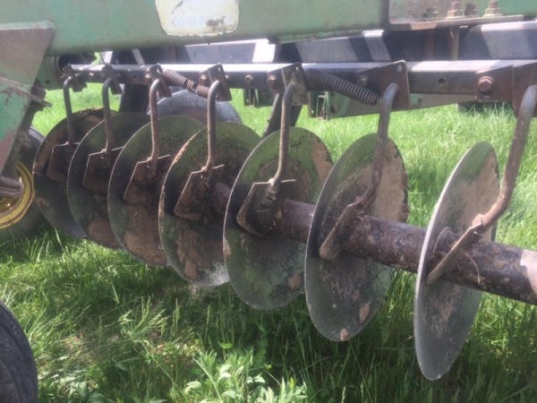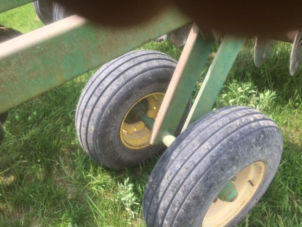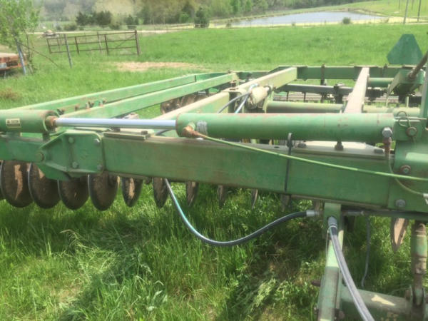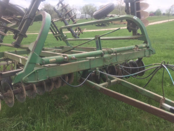John Deere 235 Disk (NP6614), 24' width, 3 section, hydraulic wings, 19" discs, with harrow, 9.5L-15 tires.