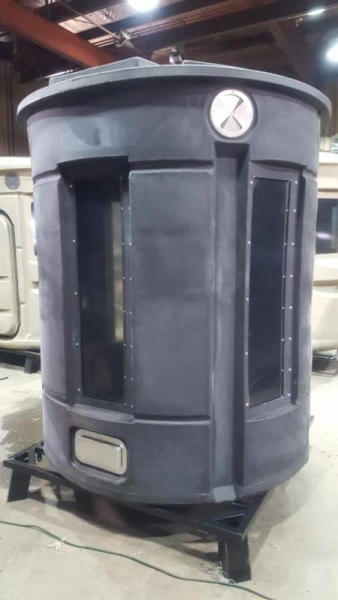 New 2018 Hunting Pods Bow Hunter Stand (KMK530), our bow hunting stands are designed by bow hunters for bow hunters, their sleekly designed to be more functional as well as comfort while shielding you from the harsh elements such as wind, rain, snow and the hot sun, crafted with a high quality plastic in charcoal color comes with a stonewashed finished, this makes each stand unique as no two stonewash is exactly the same finished pattern, this blacked out interior makes it almost impossible for animals to spot movement within the stand, stand, sit or kneel, the vertical Lexan windows are lightly tinted which also make you less visible while inside, our stands are designed to give you virtually 360 degree visibility, our lightly tented Lexan windows are tall enough to give you plenty of room to get to full draw, our design has Lexan tinted windows that open easily with a quiet vertical aluminum hinge, an added feature is our shelving above and below the windows for added storage, bow hunters like not only unlimited shooting advantage but the roomy interiors for pulling back bows, cross bow hunters also appreciate the roominess of our stands with the big openings, our bow hunter stands come 6'7" tall to give you plenty of room and outdoor comfort, our bow hunter stands are 5'4" round, so whether you have 1 or 2 people hunting, both have plenty of elbow room to move around, there is also a special place for your buddy heater to keep you warm on those cold days during hunting season, Buddy heaters burn propane which causes moisture to build up, an option we offer is a wall vent just over the designated heater zone, this feature helps to minimize moisture build-up within the stand, round vents are standard and placed high in the stand to help with ventilation and moisture build up, all measurements are approximate, our doors include 2 lockable T-handles to ensure your valuables stay safe when you are away, but makes it easy to open your stand, an additional hasp also included for added security.