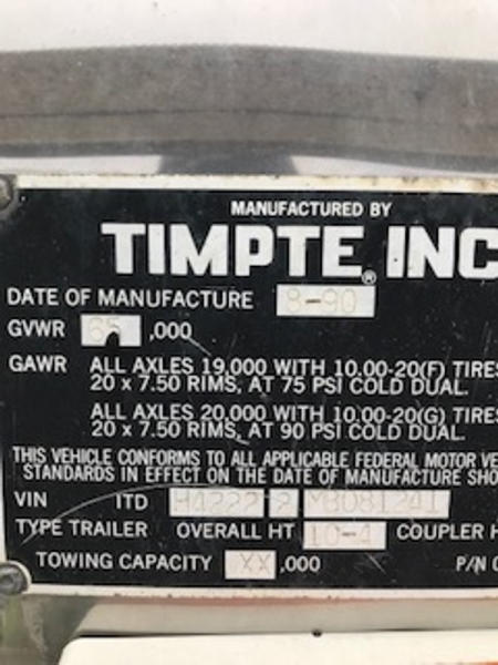 1991 Timpte Hopper Trailer (PD764), 42', tandem axle, spring ride suspension, 75% virgin 22.5 tires, outer aluminum wheels, Unit # H12, good tarp, recent trap gear boxes, rear beams, landing gear, brakes and drums 90%, recent slacks and cams.