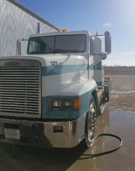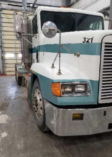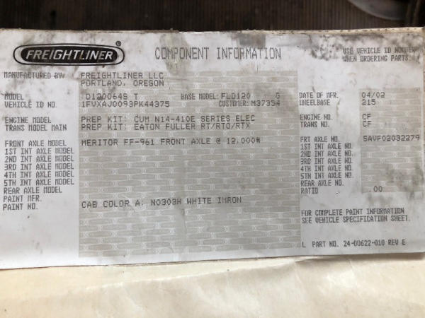 2003 Freightliner FLD 120 (KMK522), Cummins N14 Red Top, 400 hp., Eaton Fuller 10 speed transmission, cruise control, AM/FM/cassette radio, heat and air conditioning, 5th wheel slide, 215 wheel base, 11 R 24.5 tires, shows 921,051 miles.