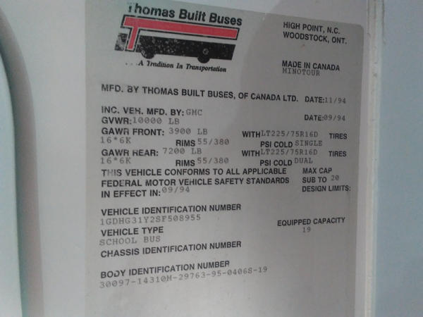 1995 GMC Cutaway Van G3500 (DL255), converted to party bus, 6.5 diesel engine, automatic transmission, tape player, heat & A/C, LT225/75R16 tires, 800 watt power source for additional audio/visual hookups, shows 126,671 miles.