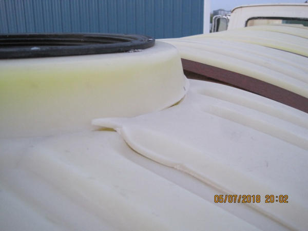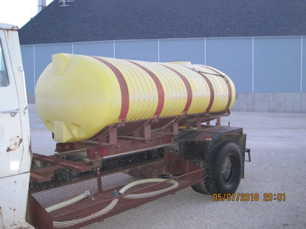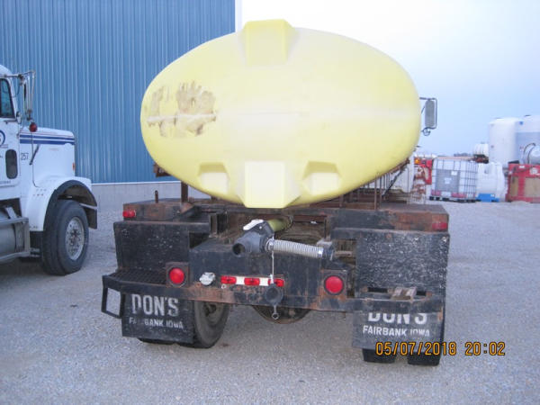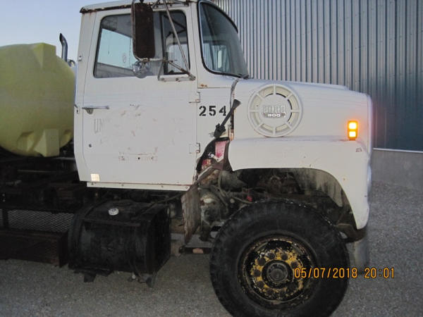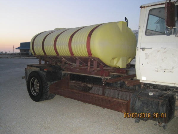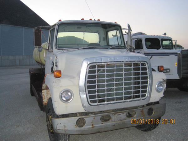 1978 Ford 800 Liquid Truck (PZ9154, Unit 254), gas engine, 5 speed transmission, heat, single axle, 1600 gallon poly tank, crack by lid opening, shows 35,507 miles.