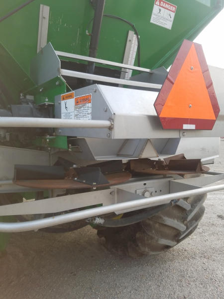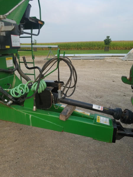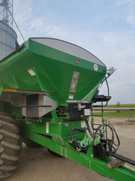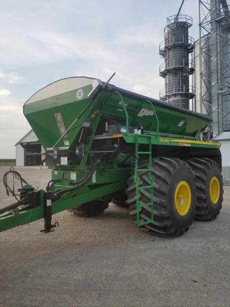 2012 John Deere DN345 Dry Spreader (PZ0872), John Deere model DN345 L3220 G4 - 16 single bin dry spreader box, twin spinner, all hydraulic, large PTO, electric roll over tarp, 9000 tractor drawbar, 88mm, has smaller pin hitch.