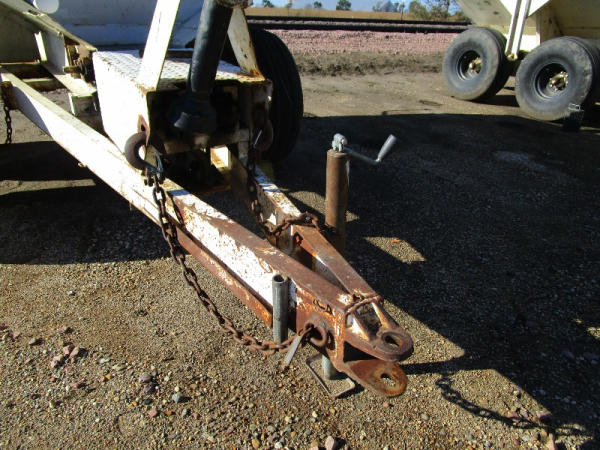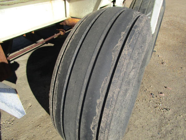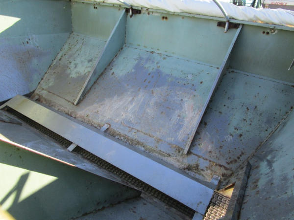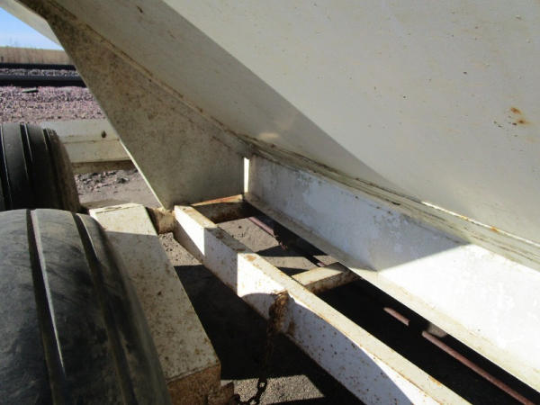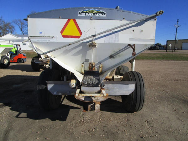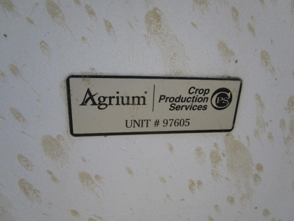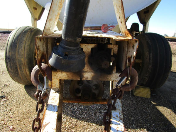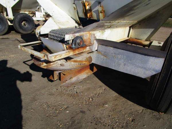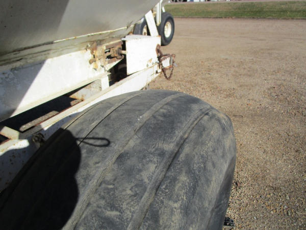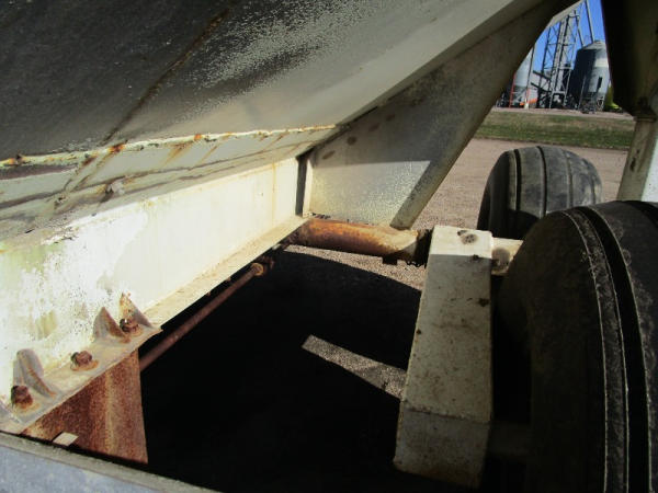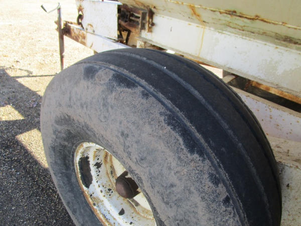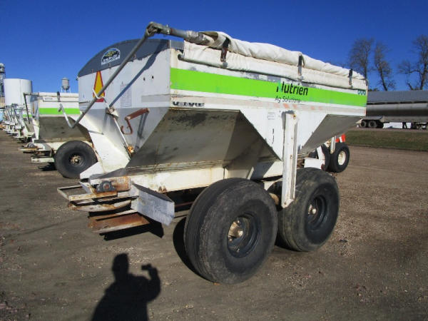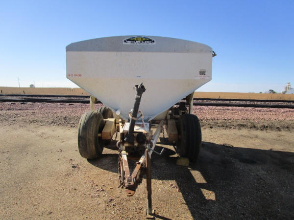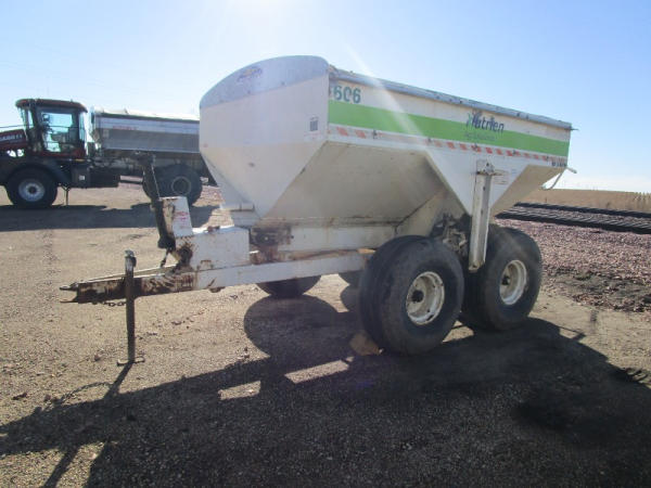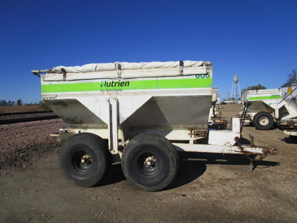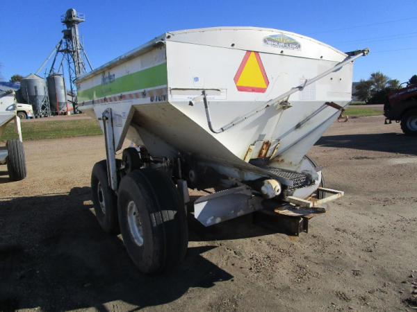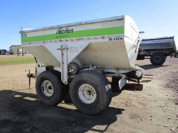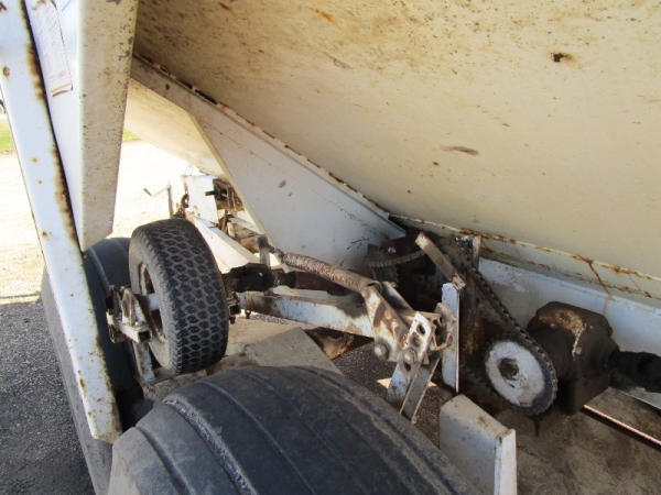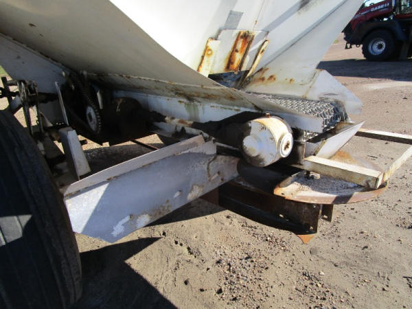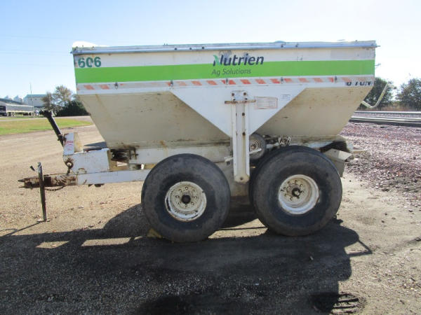 Simonsen Dry Spreader (DR0447 Unit 97605), 6 ton stainless steel dry buggy, ground drive web chain, PTO drive rear spinner, set up for 540 or 1000 PTO, roll tarp, tandem axle gear, 16.5L-16.1 tires.