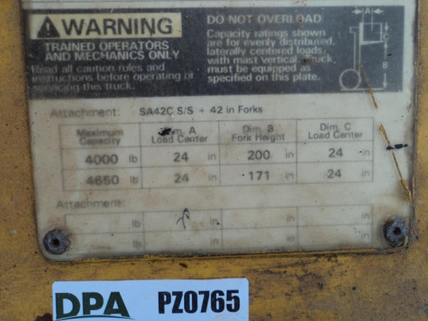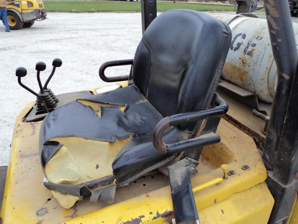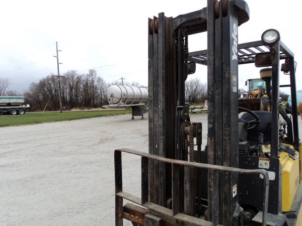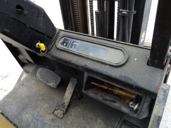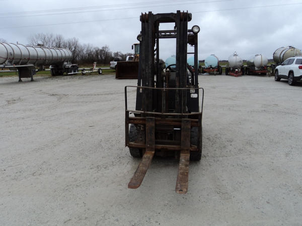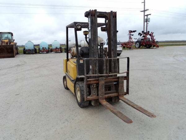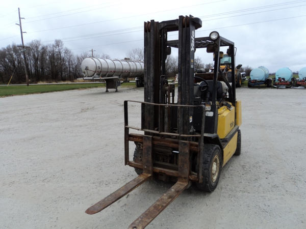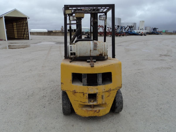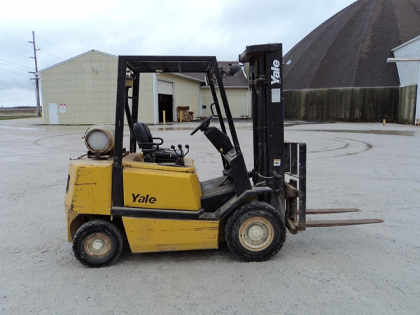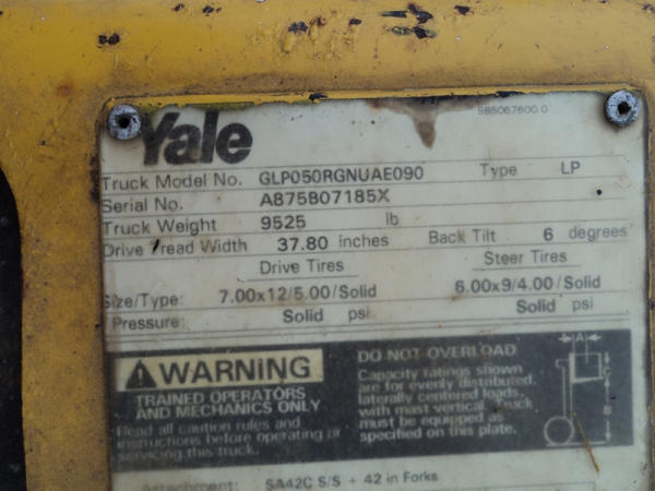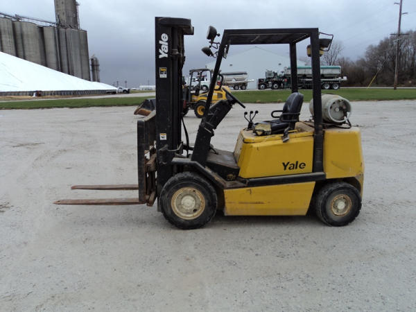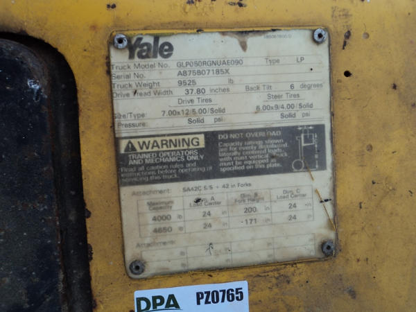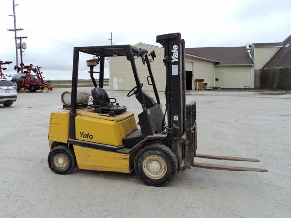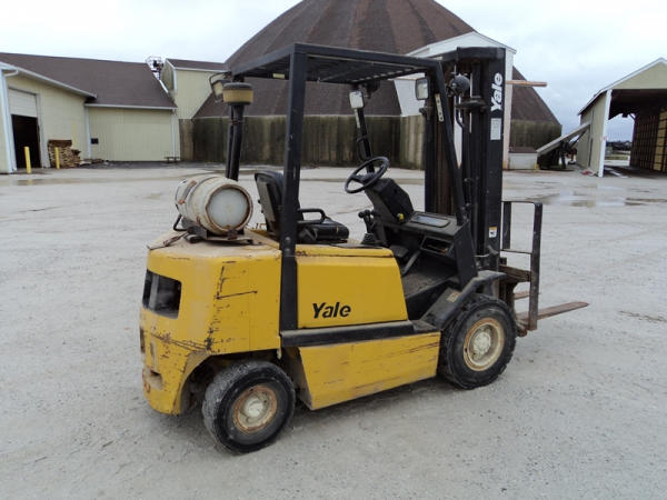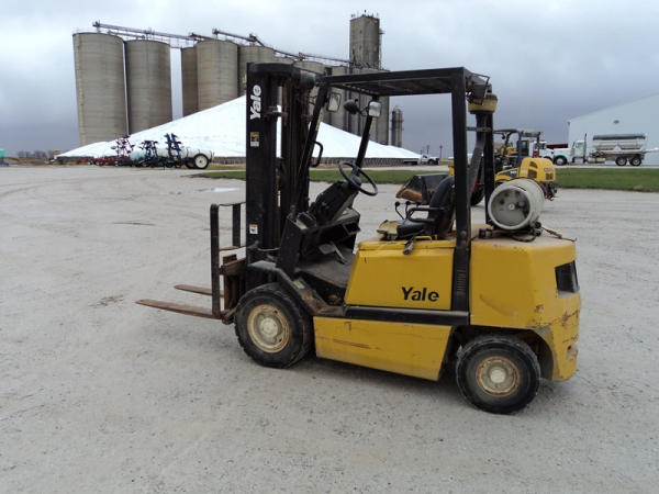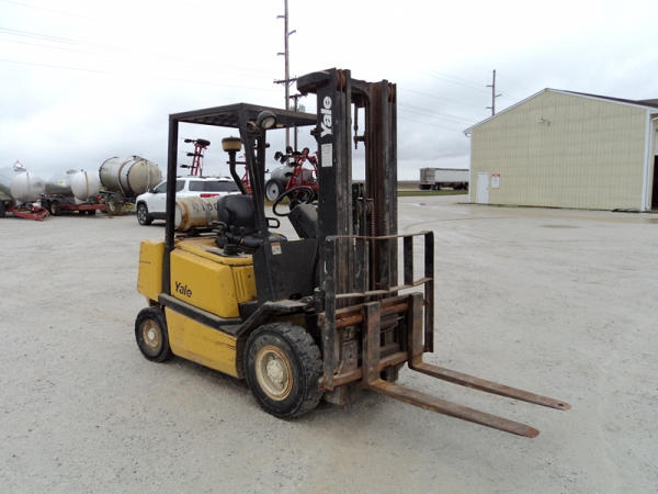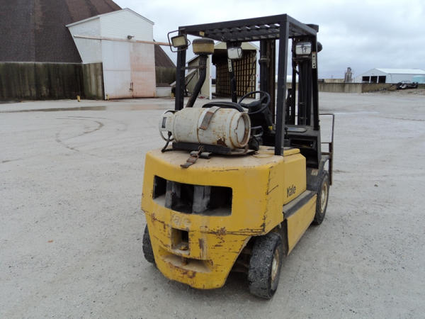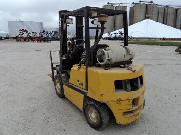 Yale model GLP50 Forklift (PZ0765), LP gas engine, shuttle shift transmission, canopy, lights, side shift, 7.00-12 front tires, 6.00-9 rear tires, shows 7232 hours.
