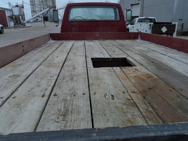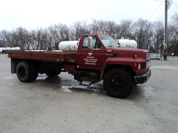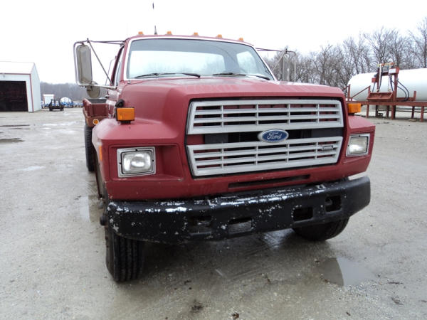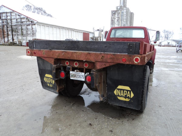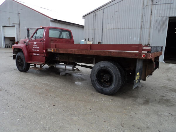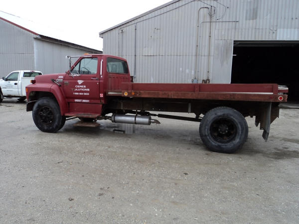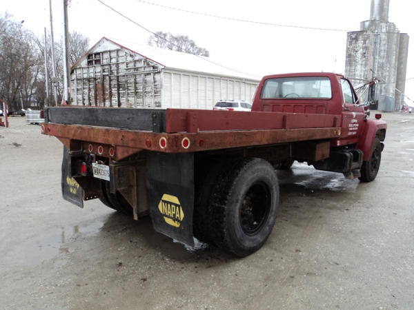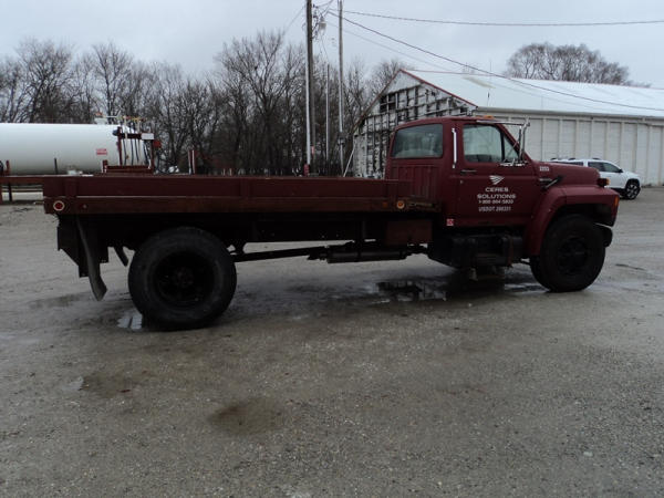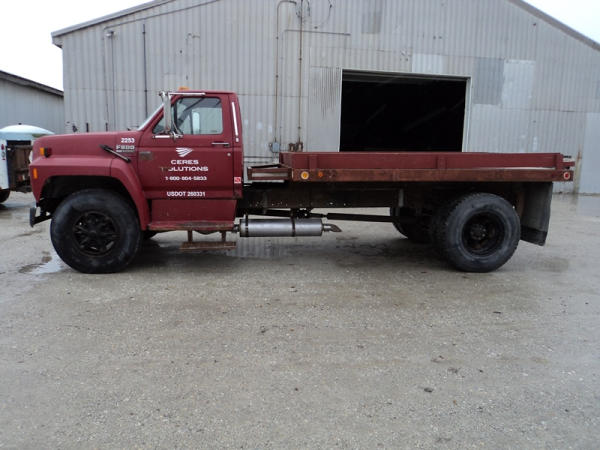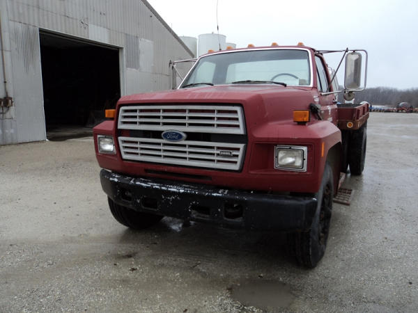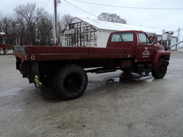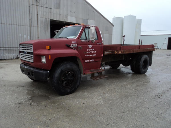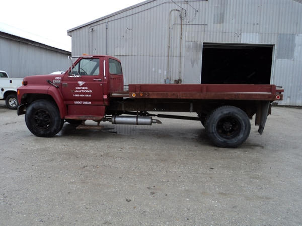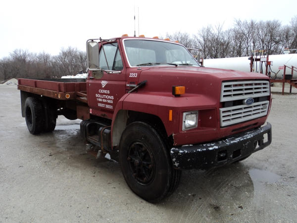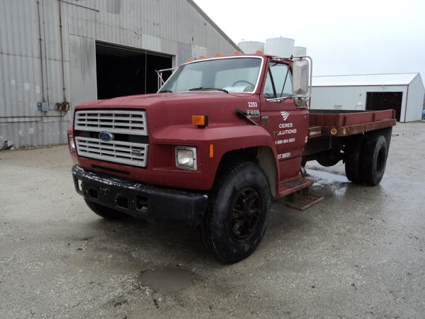 1989 Ford F800 Flatbed Truck (PZ0758, Unit 2253), 7.8L diesel engine, 5 speed transmission, 2 speed rear end, heat, Am/Fm cassette radio, single axle, 12' flatbed, wood floor, 5th wheel ball, 10.00R20 tires, shows 296,451 miles.