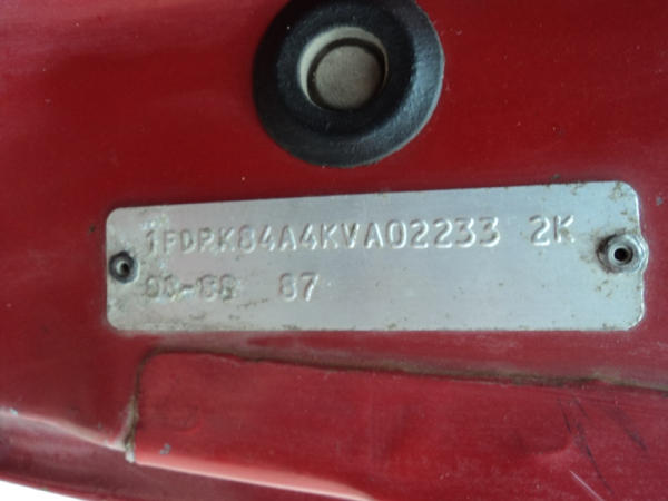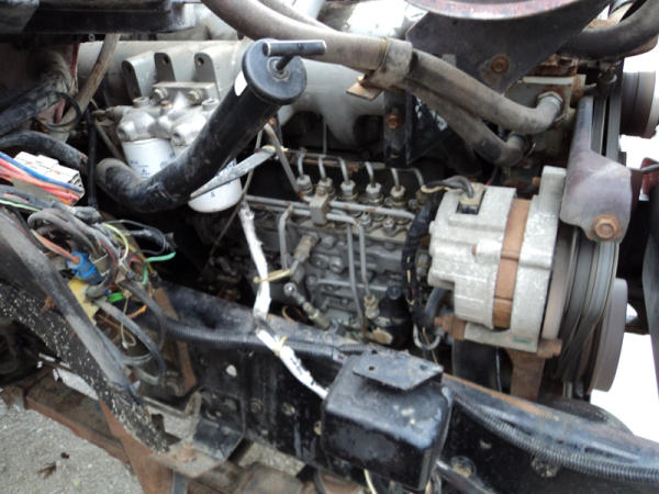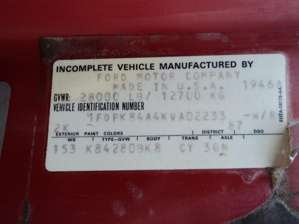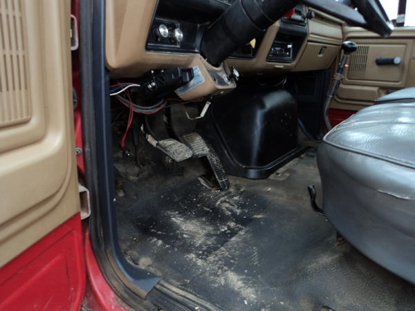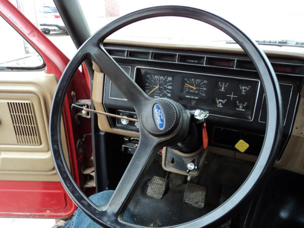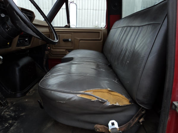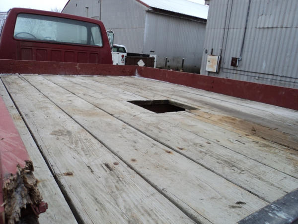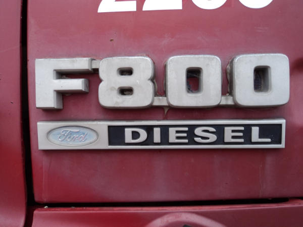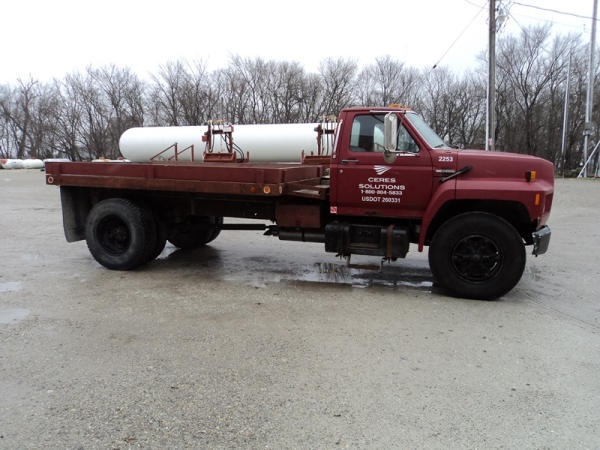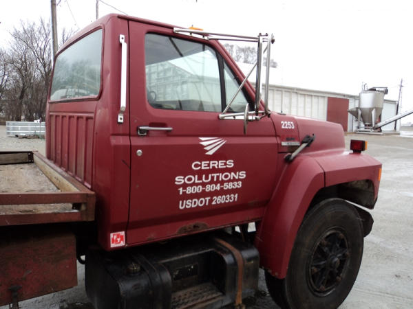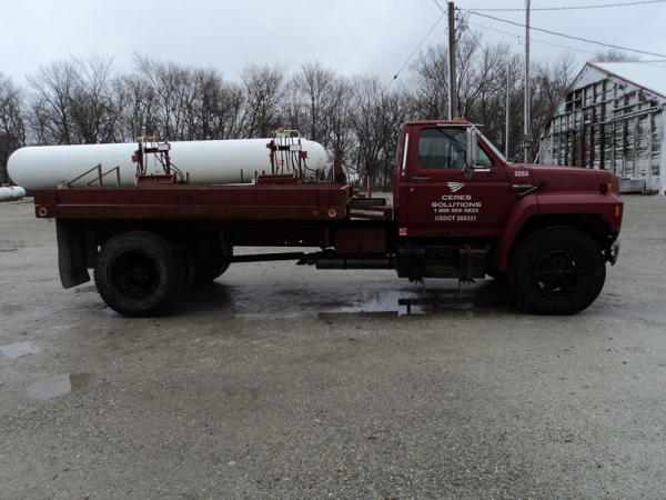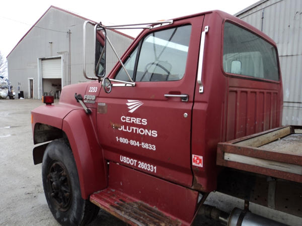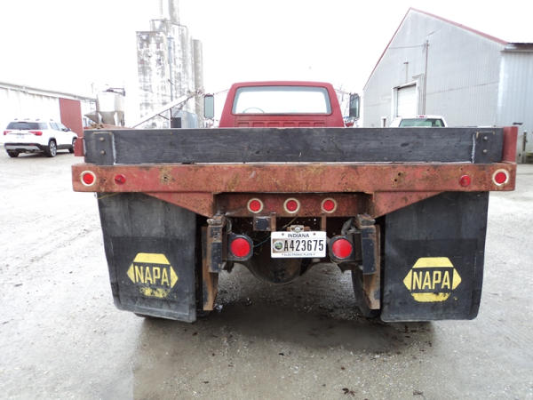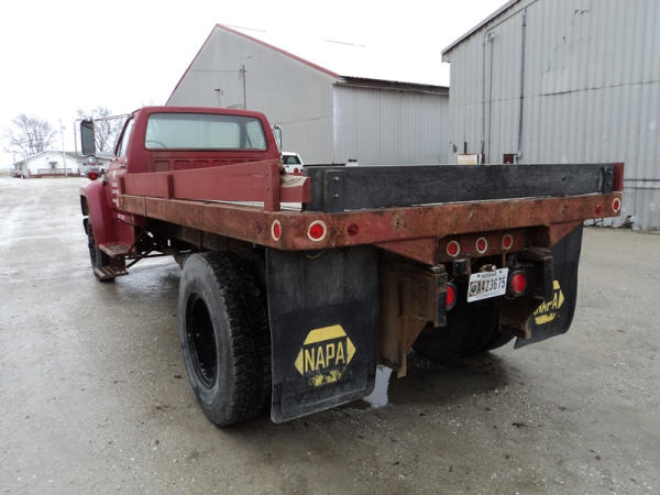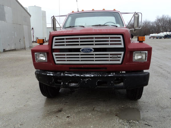 1989 Ford F800 Flatbed Truck (PZ0758, Unit 2253), 7.8L diesel engine, 5 speed transmission, 2 speed rear end, heat, Am/Fm cassette radio, single axle, 12' flatbed, wood floor, 5th wheel ball, 10.00R20 tires, shows 296,451 miles.
