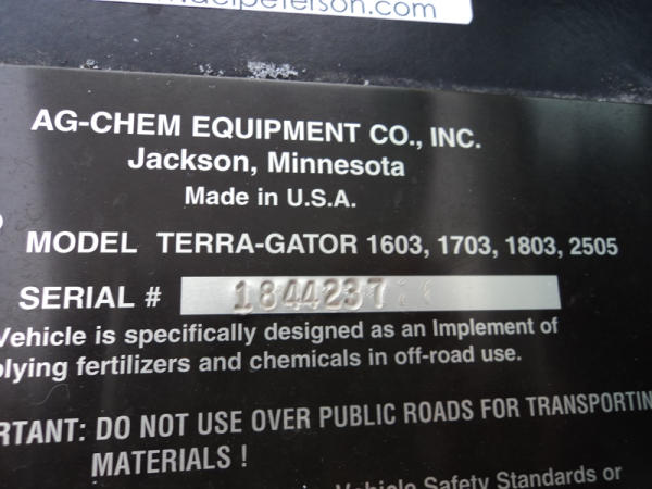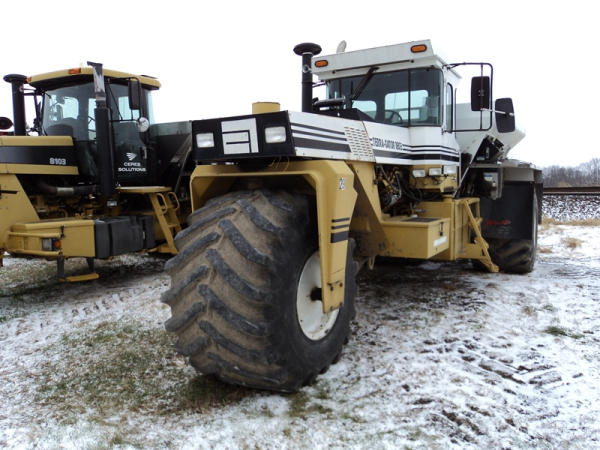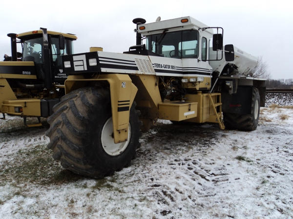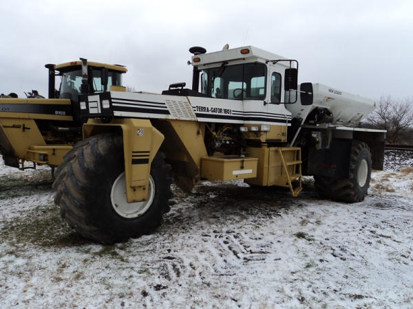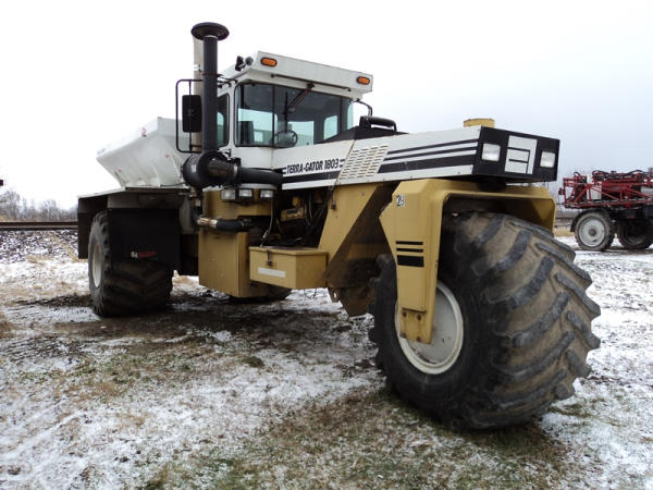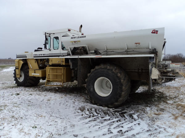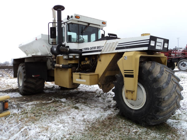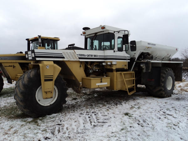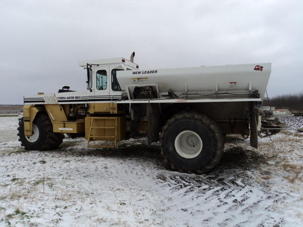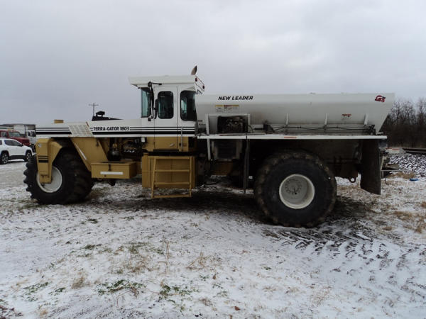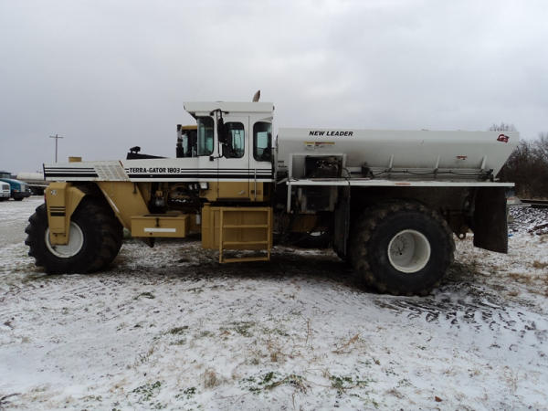 1997 Terra Gator 1803 Dry Floater (PZ0797, Unit 29), Cat diesel engine, 18 speed torque boost transmission, air conditioning, heat, Am/Fm radio, New Leader L4000 G4 - 13 stainless steel dry spreader box (S/N 127513), twin spinner, all hydraulic, PrimeX & Firestone 66x43.00-25 tires, Raven monitor, shows 3932 hours, 38,834 miles.
