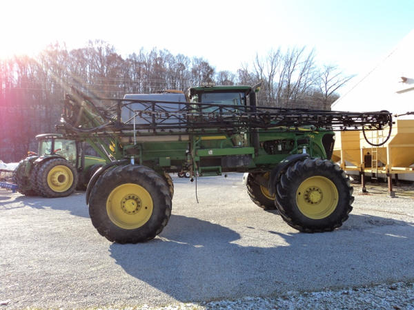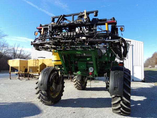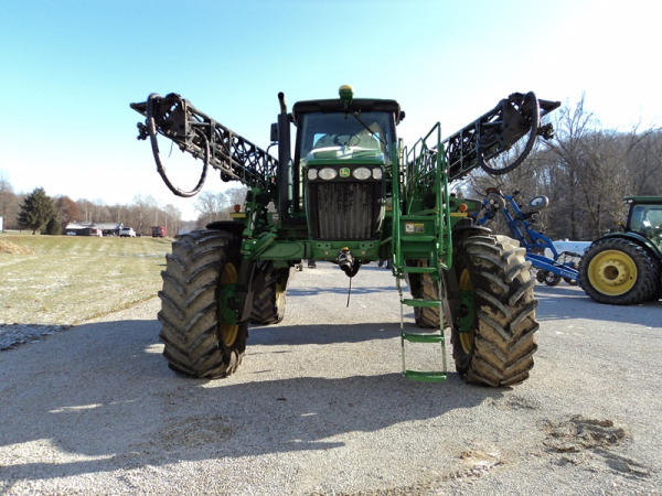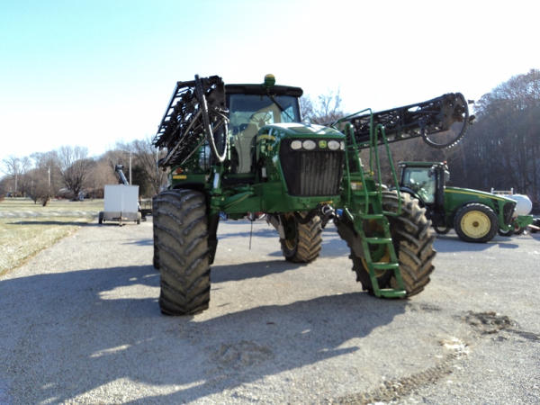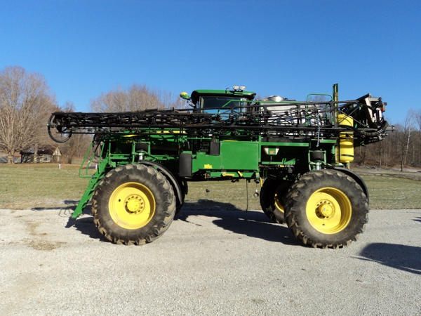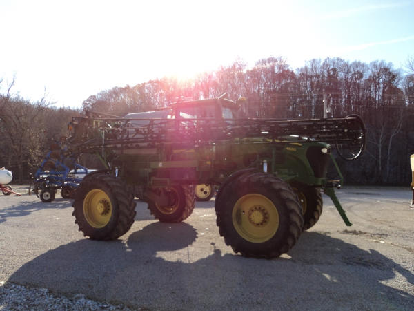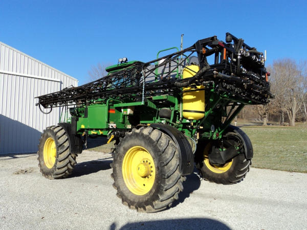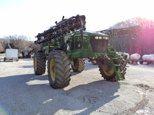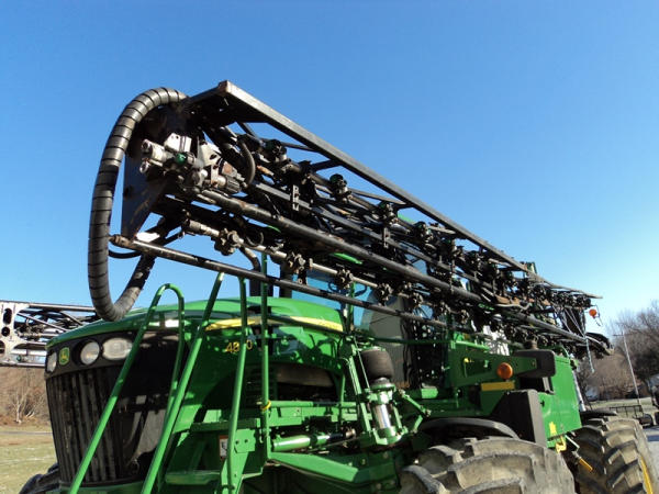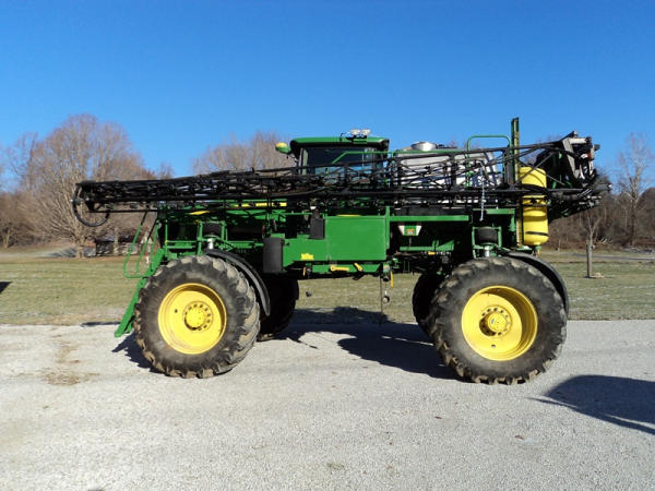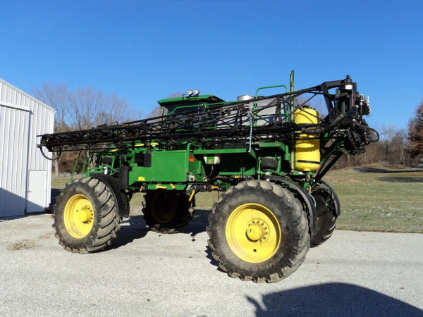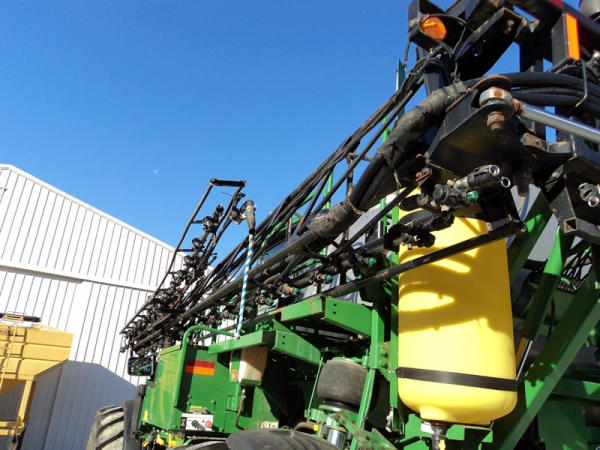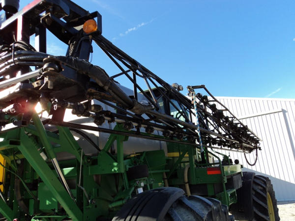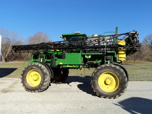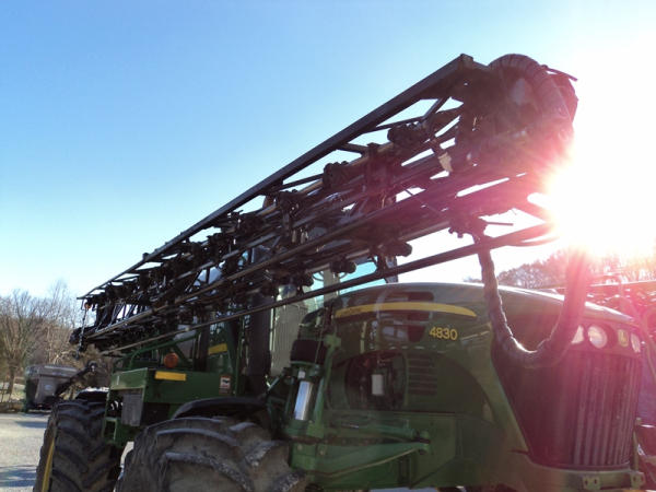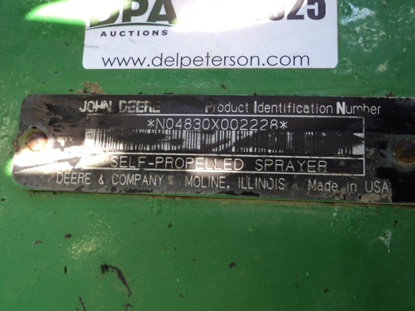 2007 John Deere 4830 Sprayer (PZ0825, Unit 6348), John Deere diesel engine, hydrostatic transmission, air conditioning, heat, Am/Fm CD stereo, 1025 gallon stainless steel liquid system, 100' boom, foam marker, poly foam marker tank, front fill, Trelleborg TM800 650/65R38 flotation tires, Good Year Ultra Sprayer 380/90R46 tires, StarFire iTC globe, John Deere monitor, shows 4530 hours.