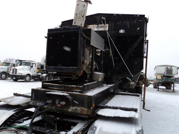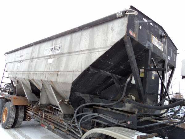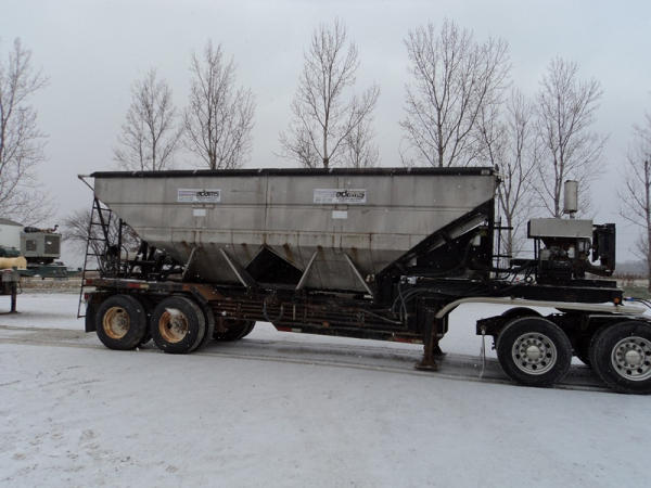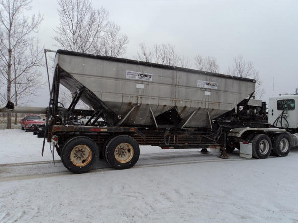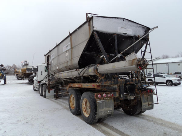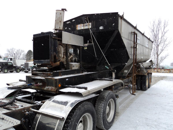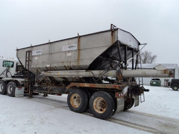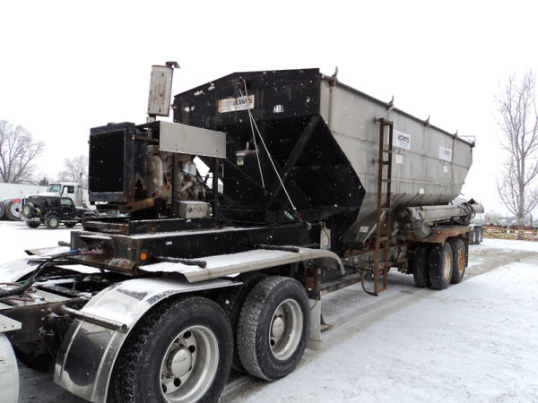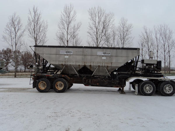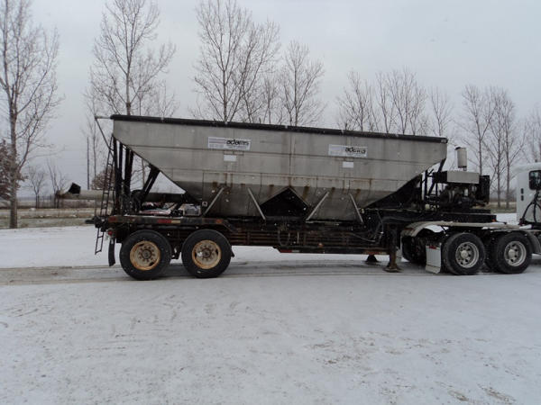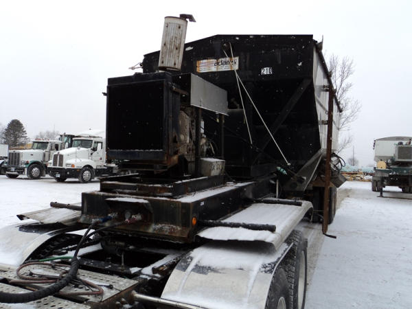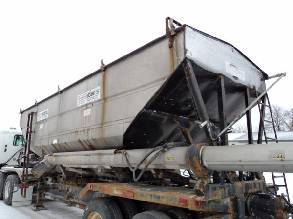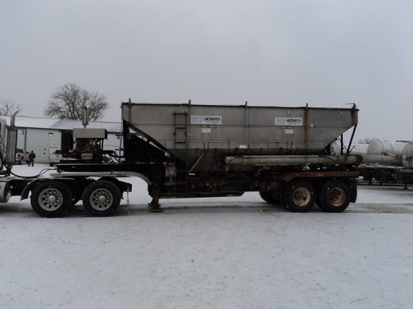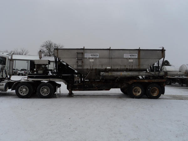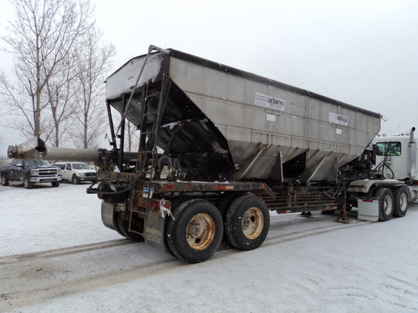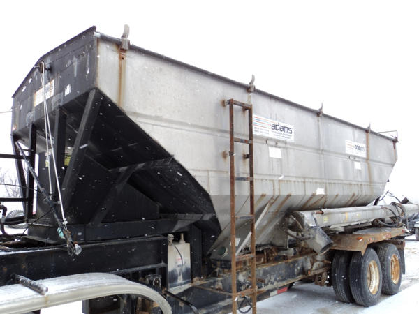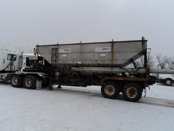 2002 Adams Dry Tender Trailer (PZ0803), 2002 Adams 24 ton stainless steel dry tender trailer, Cummins self contained diesel engine, side discharge auger, all hydraulic, hydraulic slides, roll over tarp, tandem axle, 11R22.5 tires, shows 528 hours.