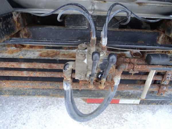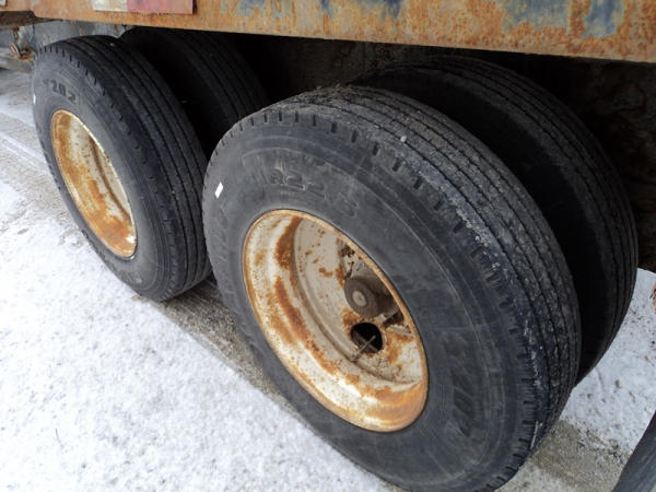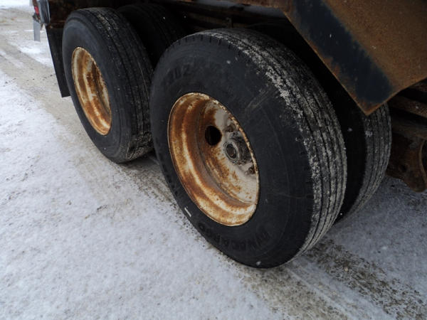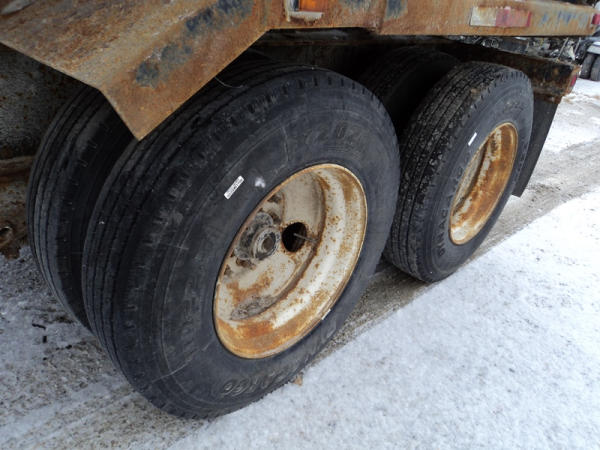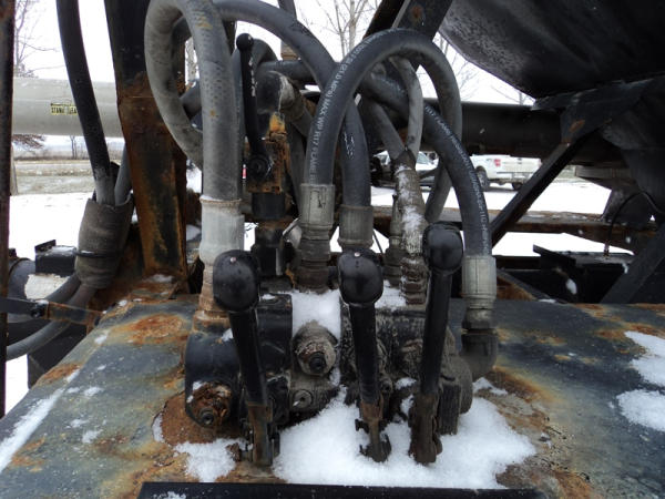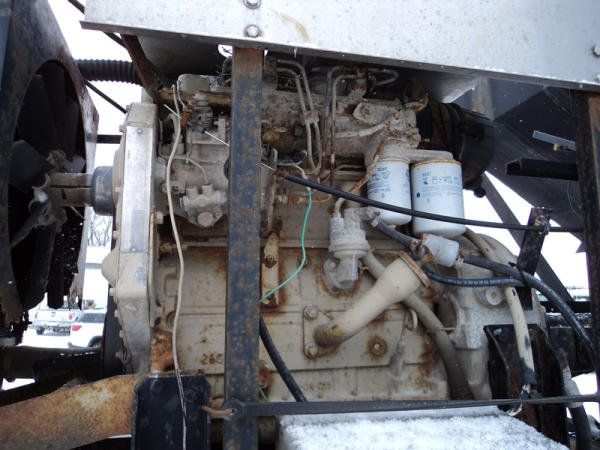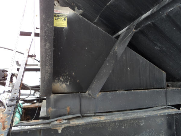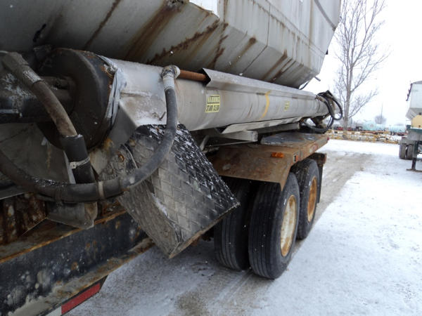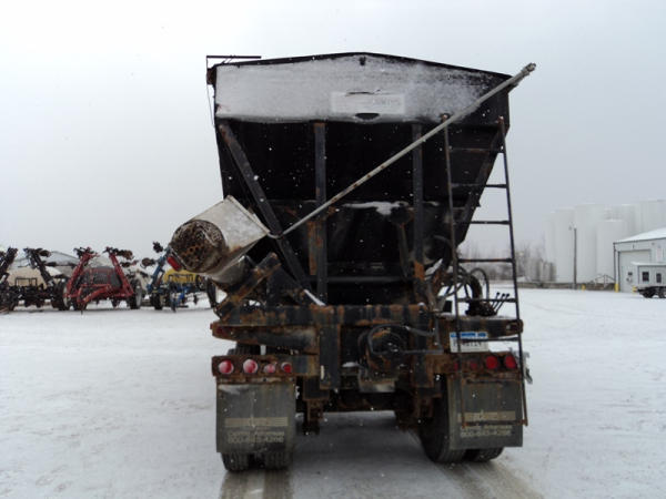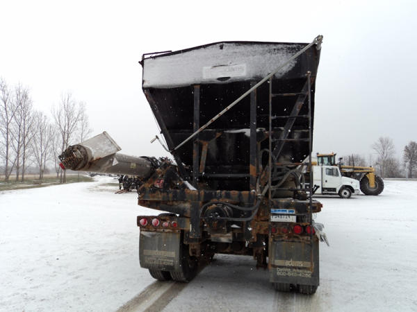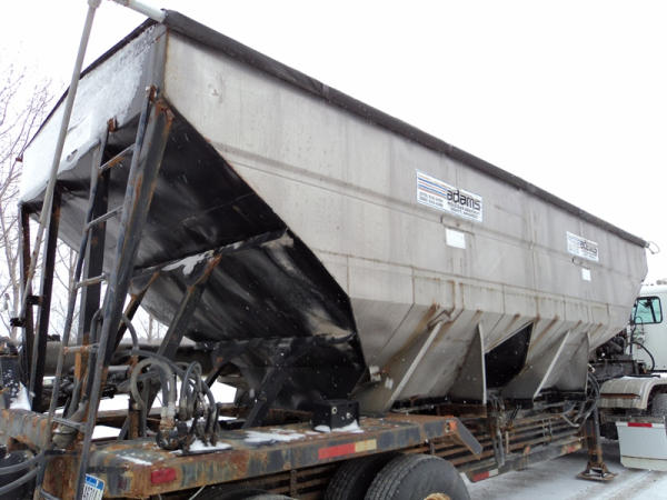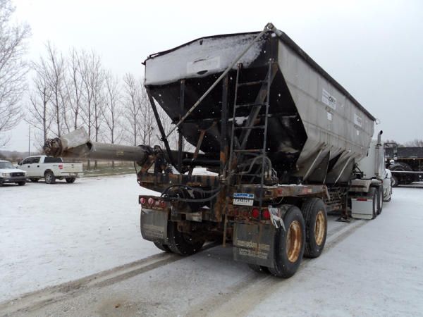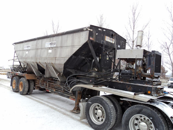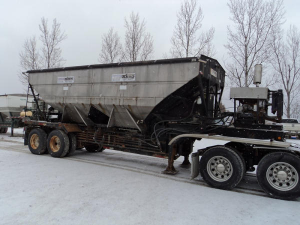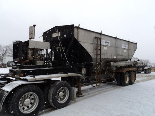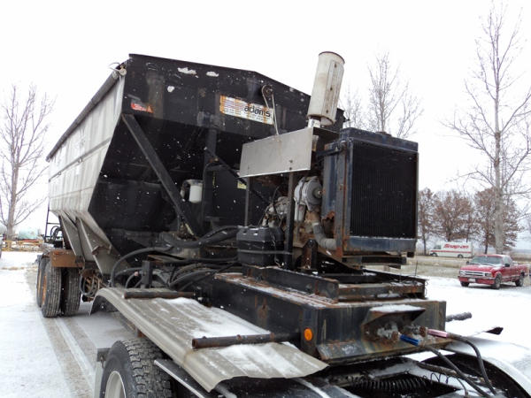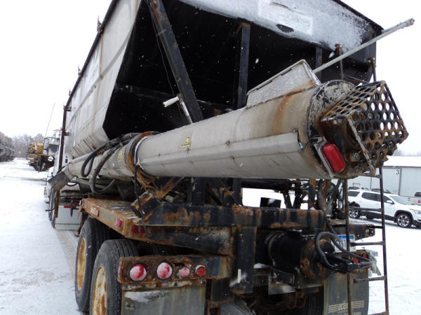 2002 Adams Dry Tender Trailer (PZ0803), 2002 Adams 24 ton stainless steel dry tender trailer, Cummins self contained diesel engine, side discharge auger, all hydraulic, hydraulic slides, roll over tarp, tandem axle, 11R22.5 tires, shows 528 hours.