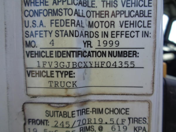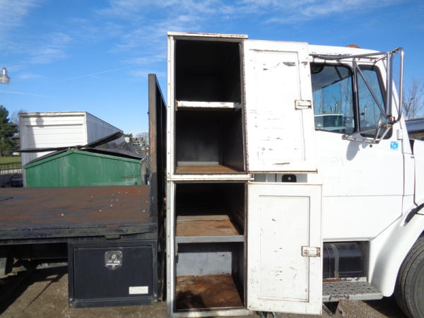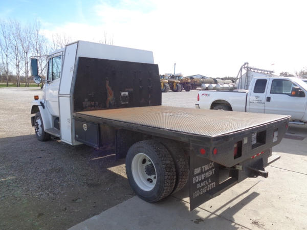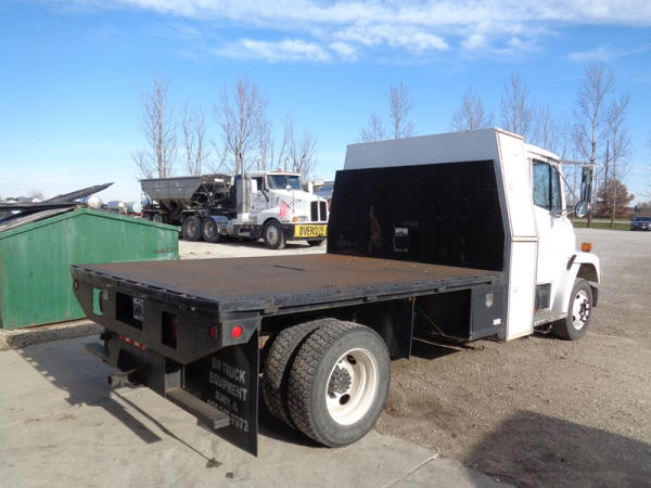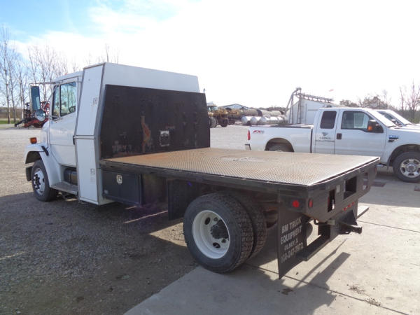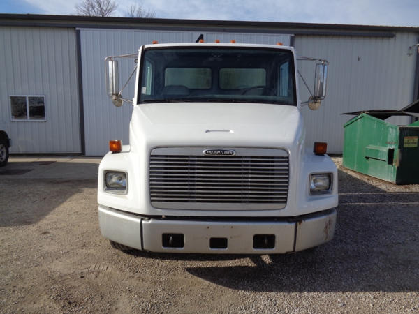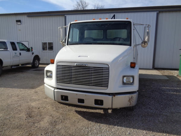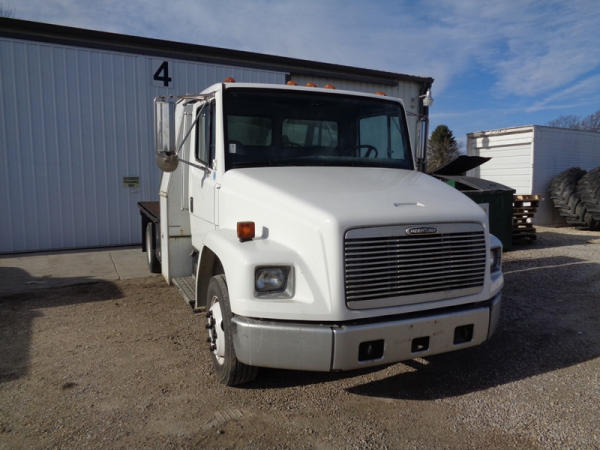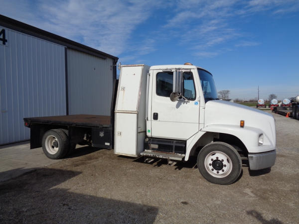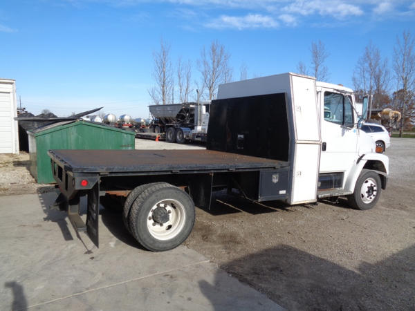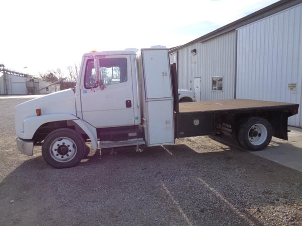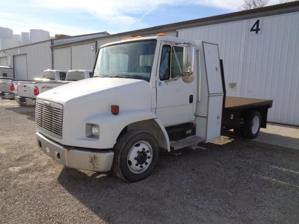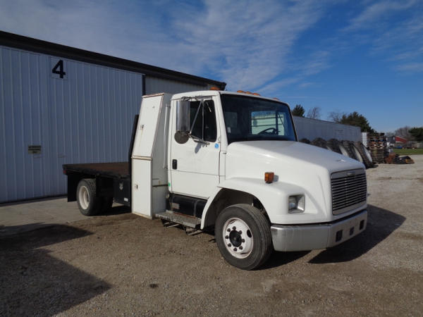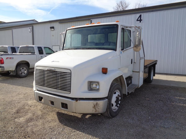 2000 Freightliner Flatbed Truck (PZ0804), Cat 3126 diesel engine, 6 speed transmission, air conditioning, heat, Am/Fm cassette radio, cruise control, 10' steel flatbed, 5th wheel ball, side storage boxes, 245/70R19.5 tires, shows 65,320 miles.