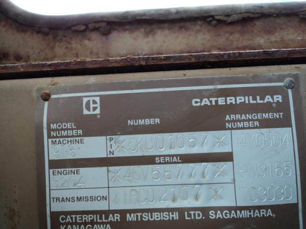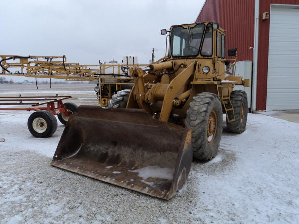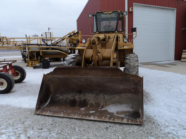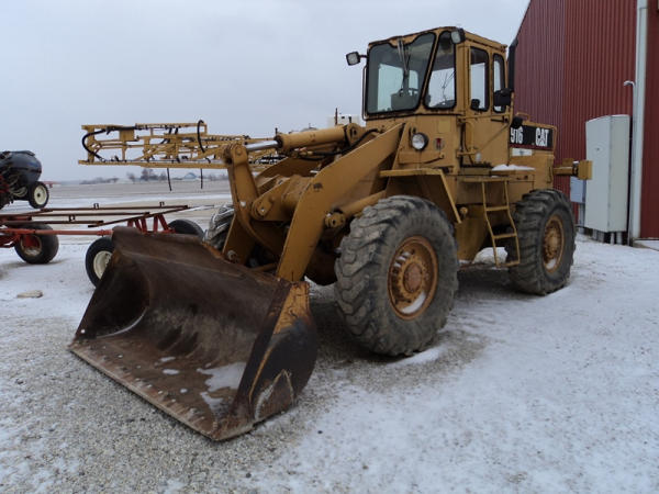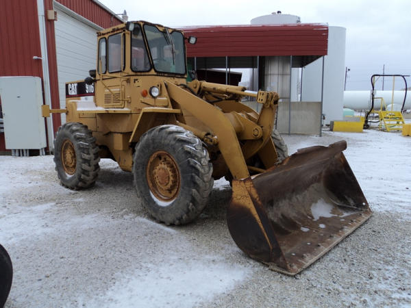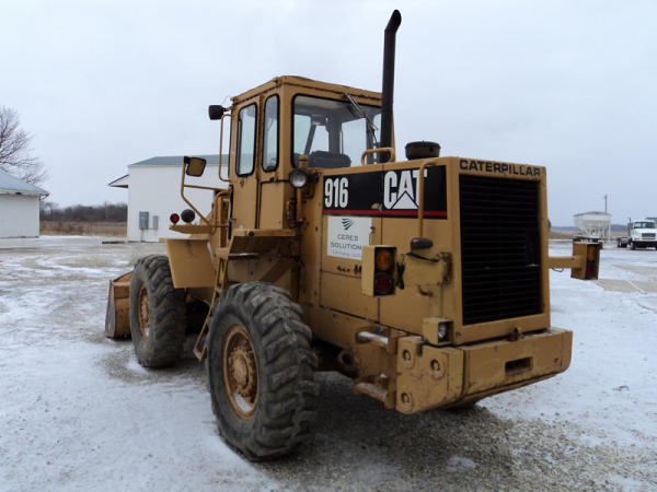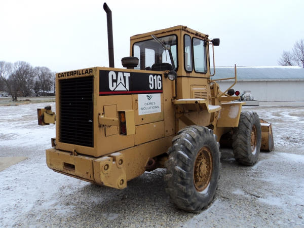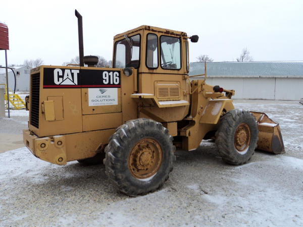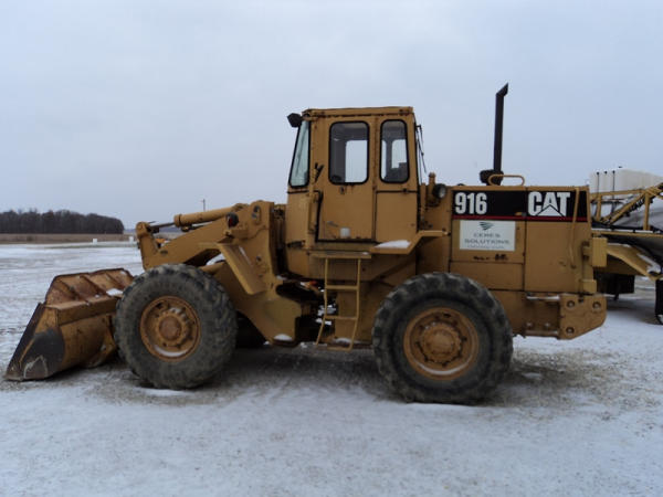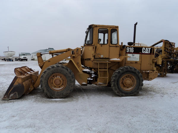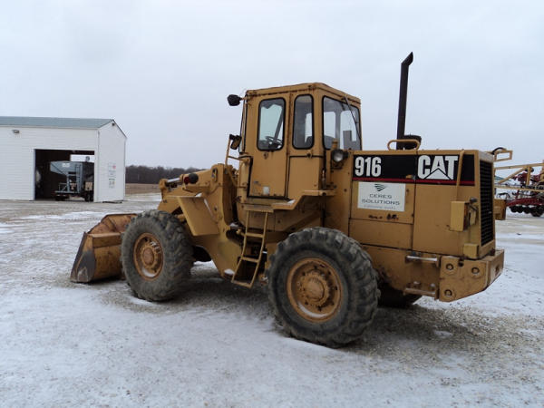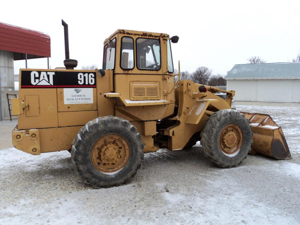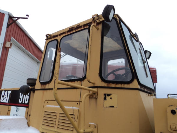 Cat 916 Loader (PZ0810), Cat 3204 diesel engine, shuttle shift transmission, heat, cab, lights, 94" bucket, 14.00-24 tires, shows 10,427 hours.