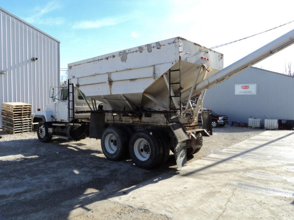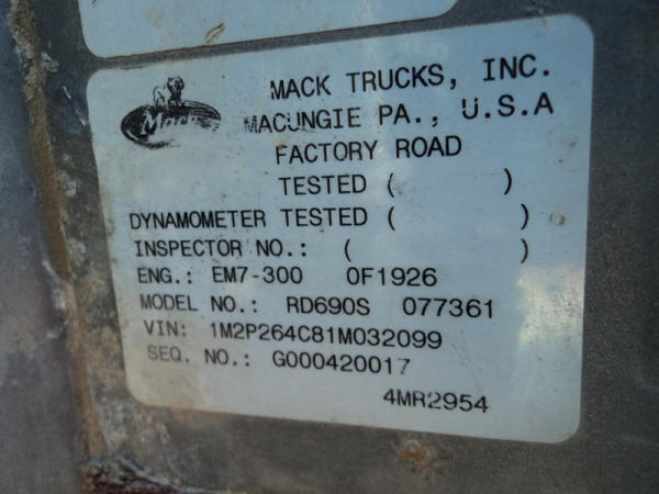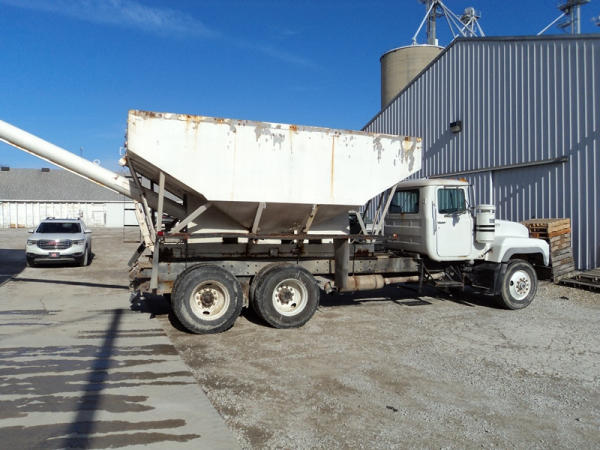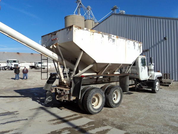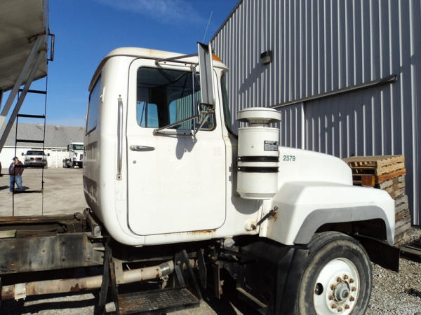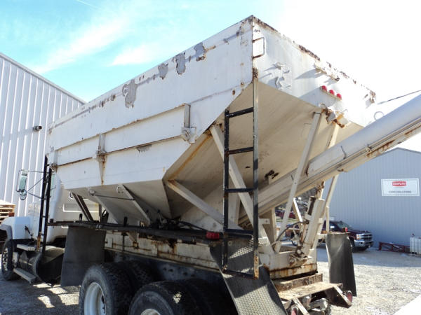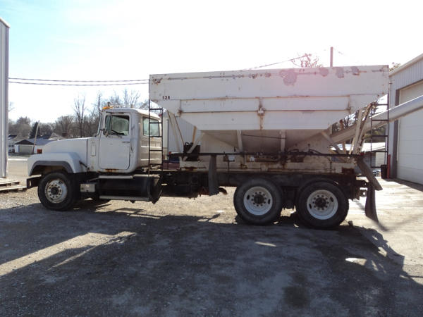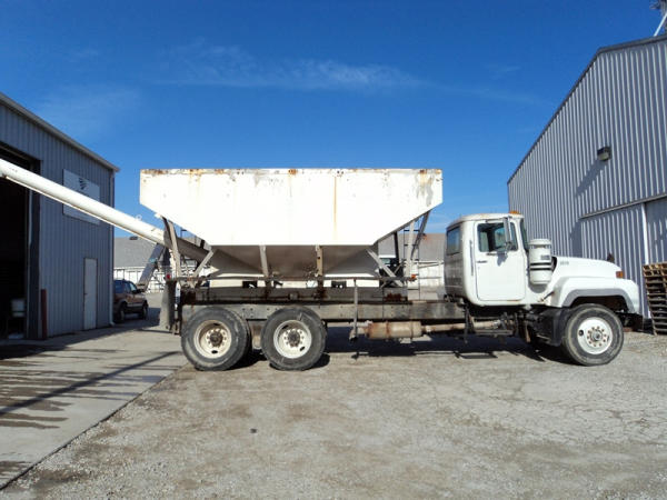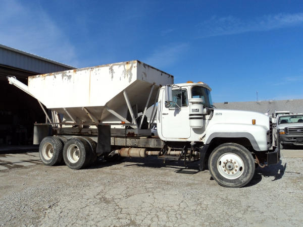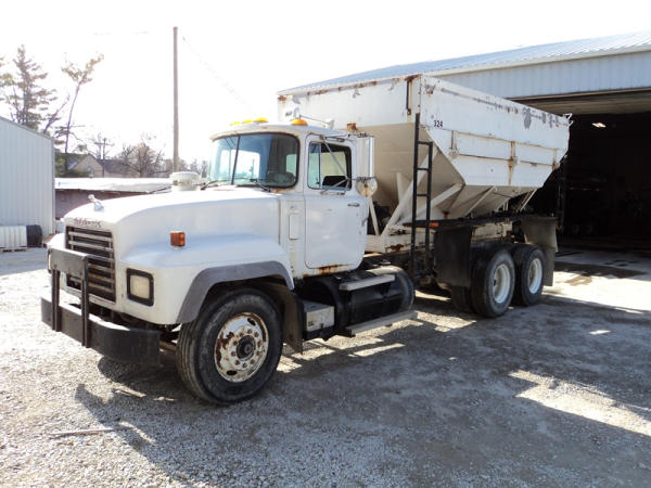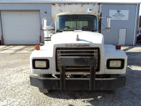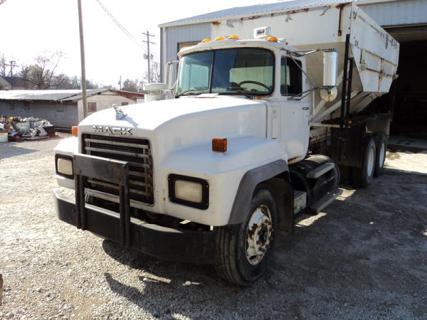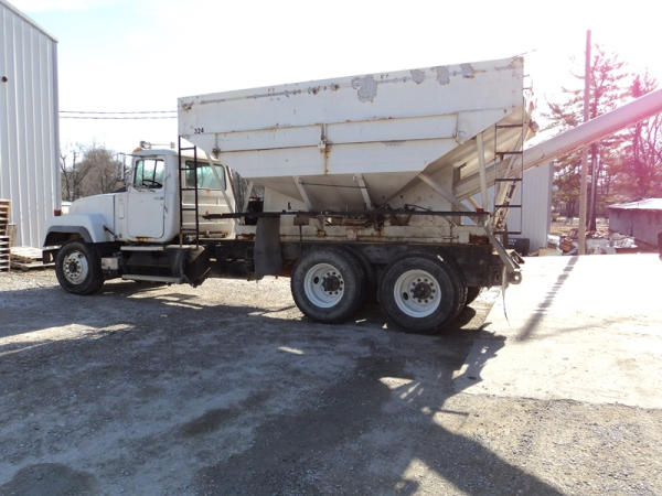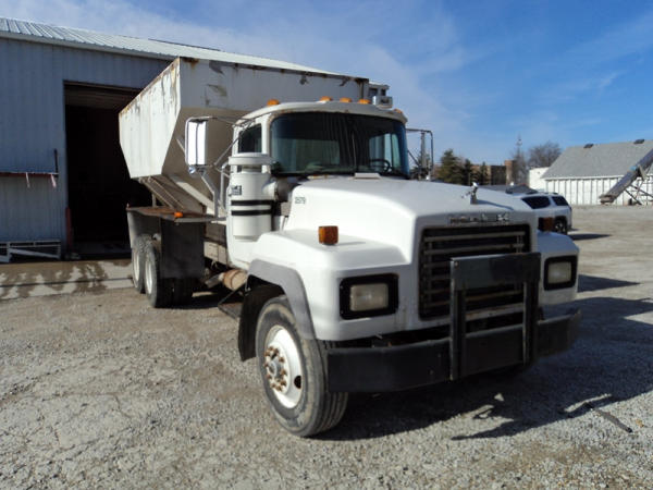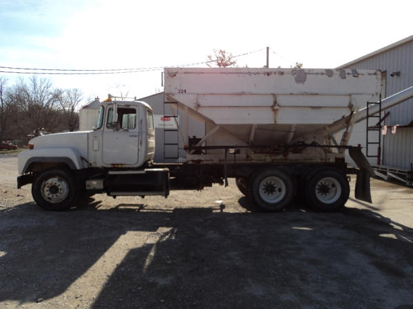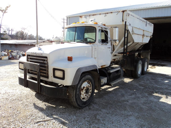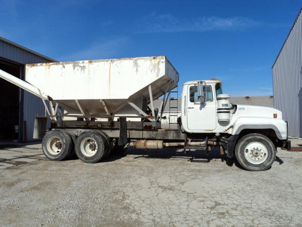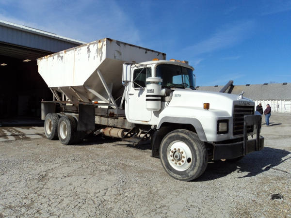 2001 Mack RD690S Dry Tender Truck (PZ0827, Unit 2579), Mack EM7-300 diesel engine, Maxitorque transmission, air conditioning, heat, Am/Fm cassette radio, tandem axle, full screw, 16 ton stainless steel dry tender box, rear discharge auger, all hydraulic, 295/75R22.5 front tires, 11R22.5 rear tires, shows 310,885 miles.