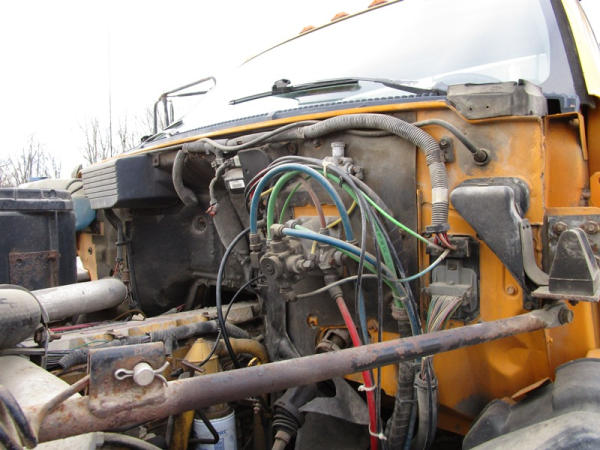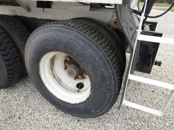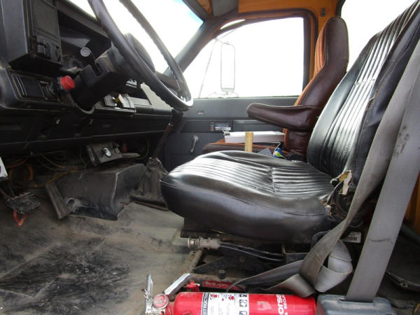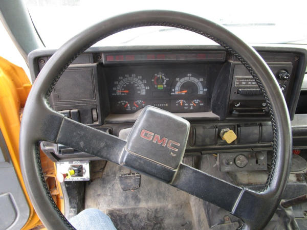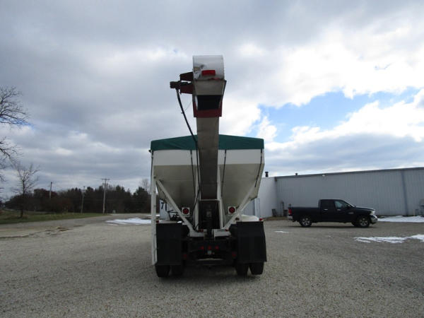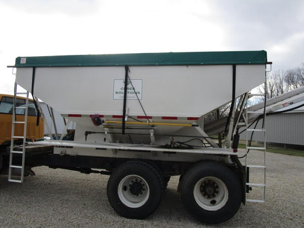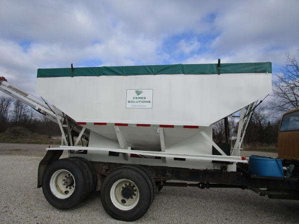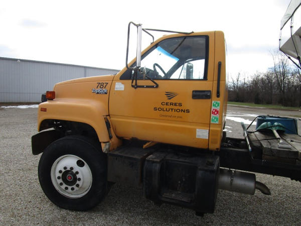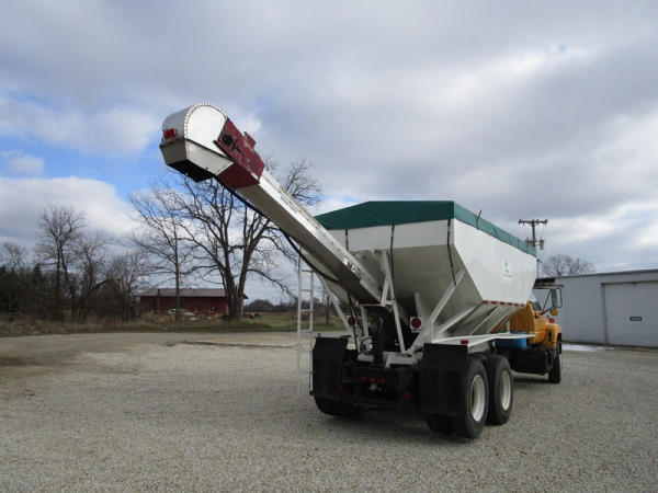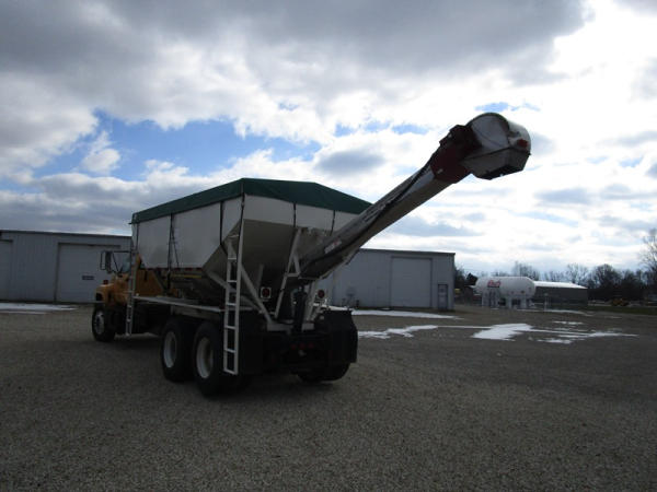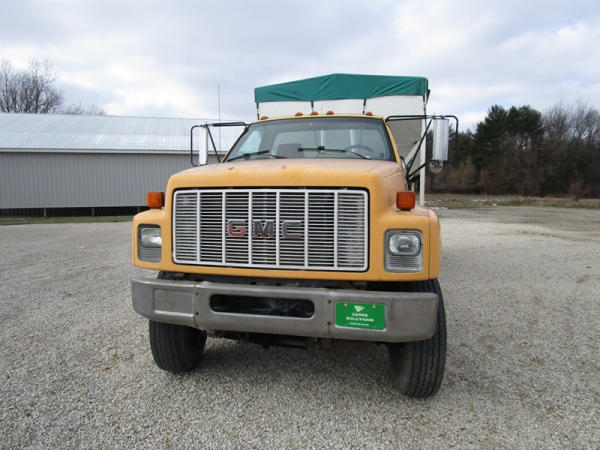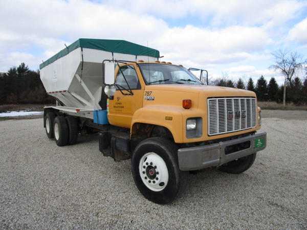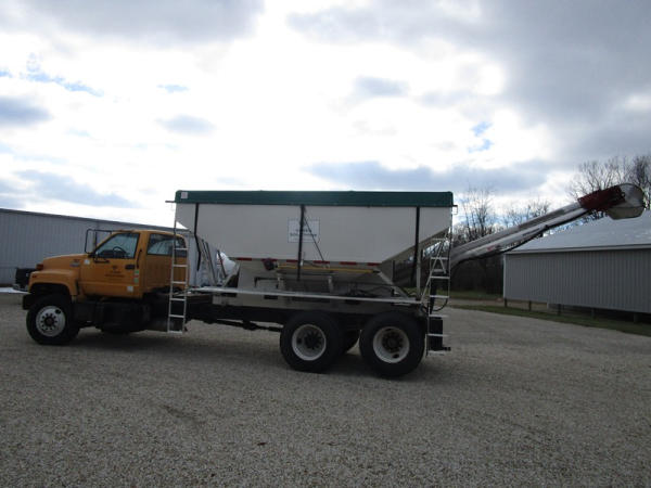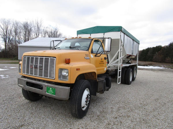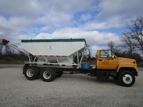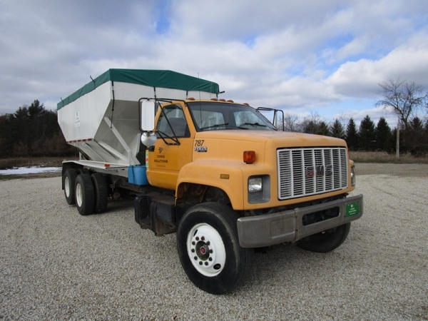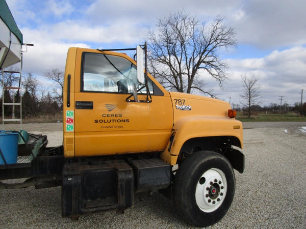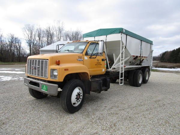 1991 GMC TopKick Seed Truck (CP615, Unit 787), Cat diesel engine, 6 speed transmission, heat, Am/Fm radio, single axle with air ride tag axle, twin compartment approx. 400 bushel seed tender box, KSI model 1208 19 seed conveyor, New roll over tarp, 11R22.5 tires, shows 216,845 miles.