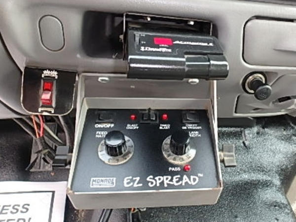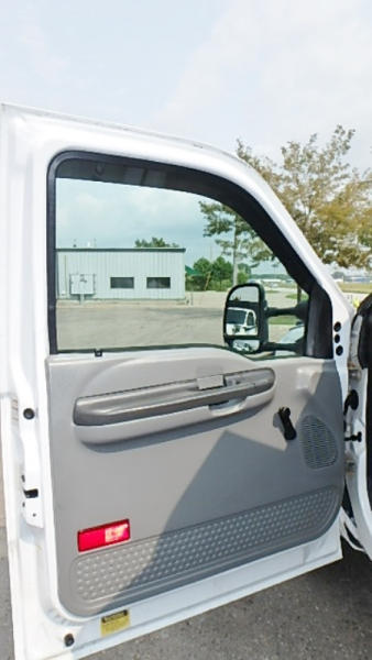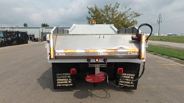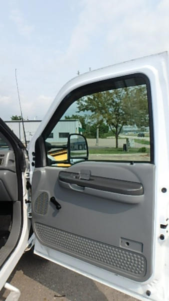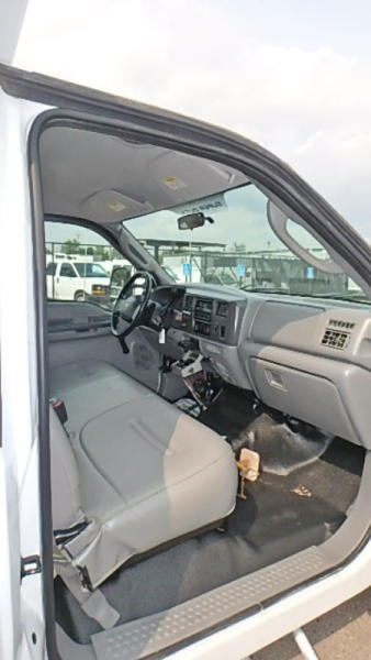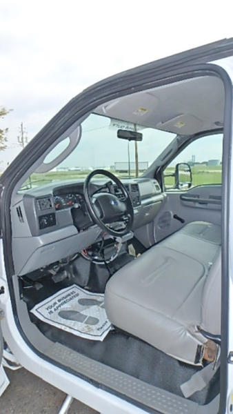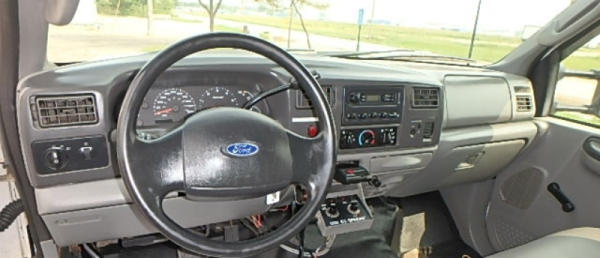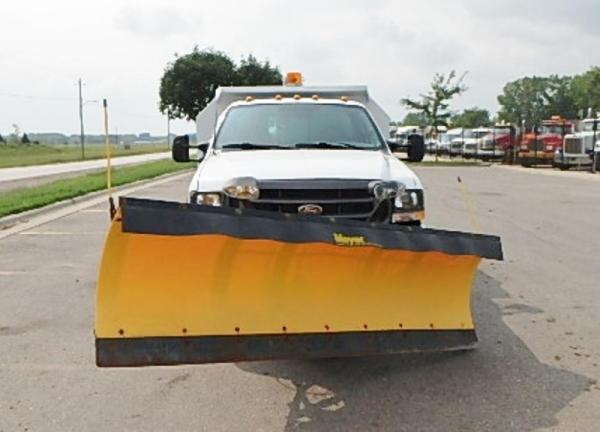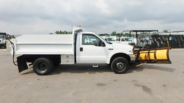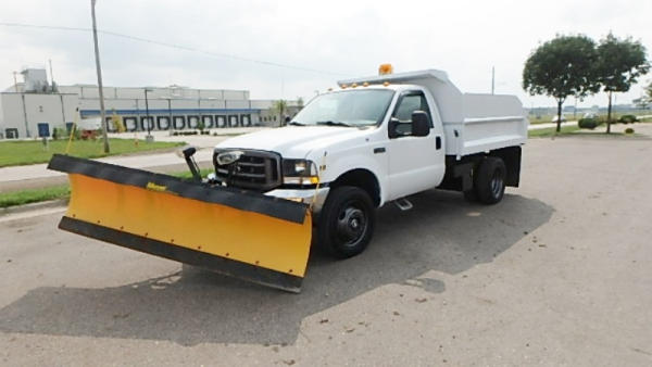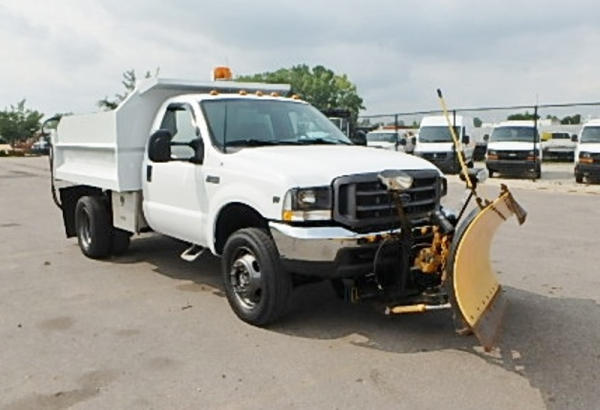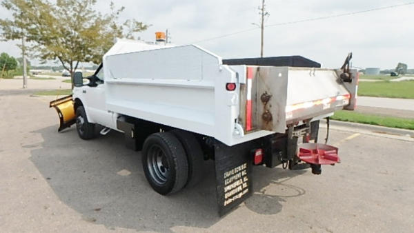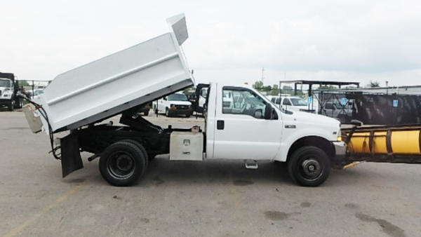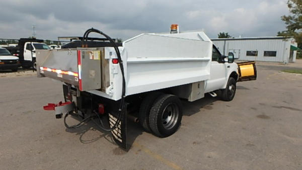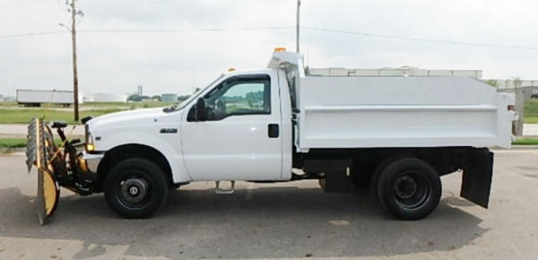 2003 Ford F-550 SuperDuty XL Dump Plow Truck (PD1114), 6.8L V-10 Gas engine, Automatic transmission, tire size 225/70R19.5 like new, 4X4, 9 foot box with stainless steel sander, 17,500 GVW, city owned and maintained, shows 68,735 miles.