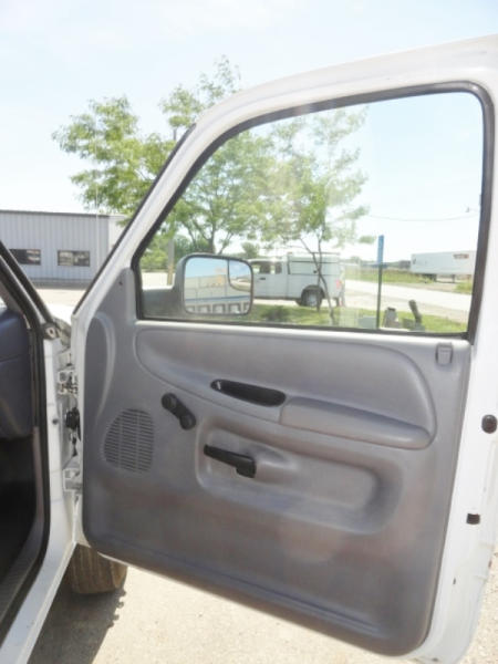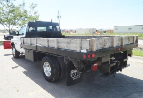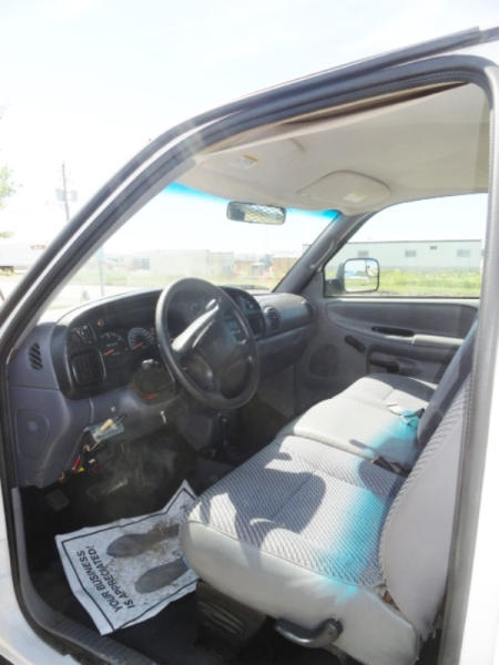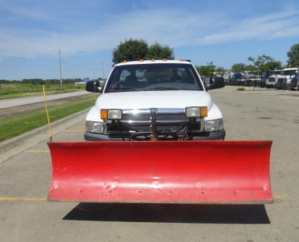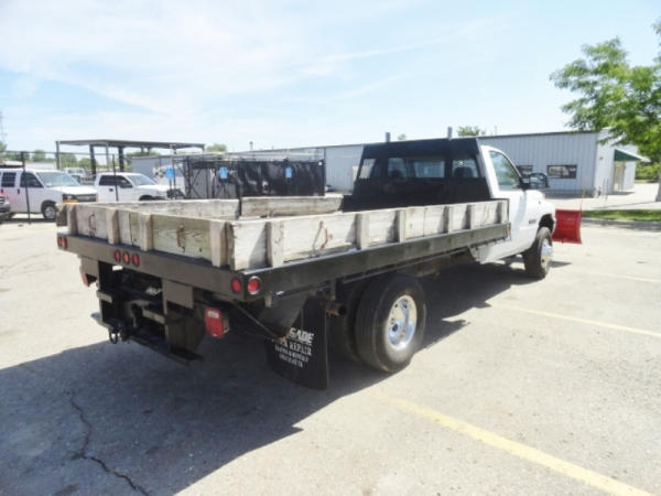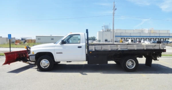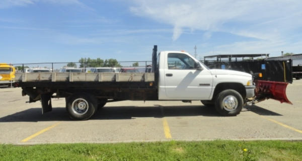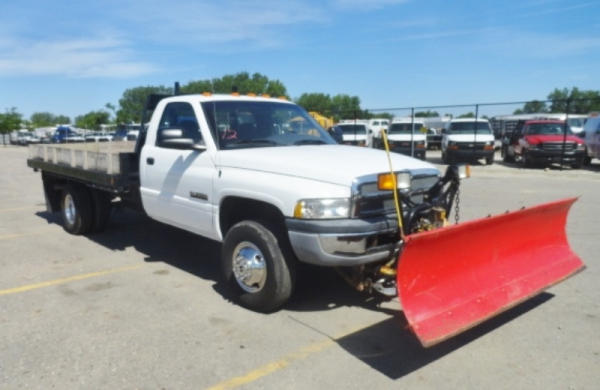 2002 Dodge Ram 3500 Truck (PD1115), Cummins 5.9 Diesel 24 Valve with turbo engine, automatic transmission, tire size 235/85R16 75%, 12 foot steel flatbed, Myers snow plow, nice clean low mile truck, shows 75,413 miles.