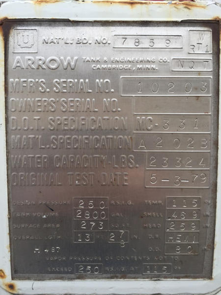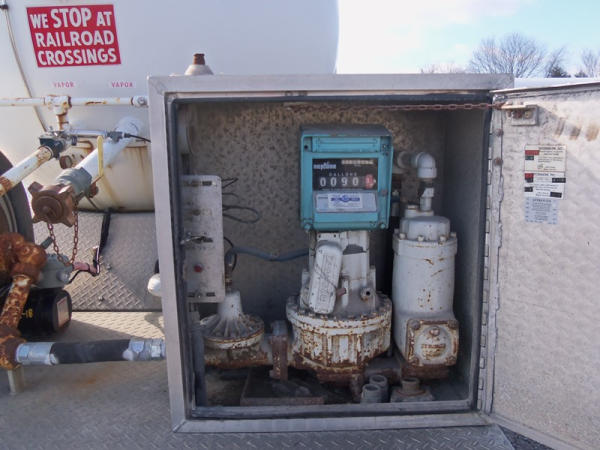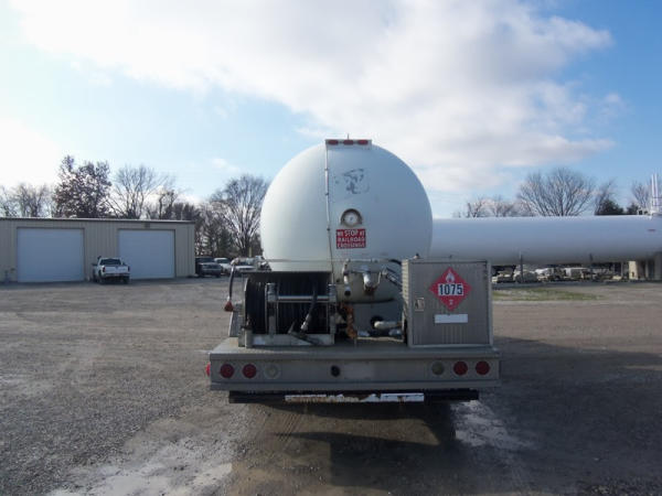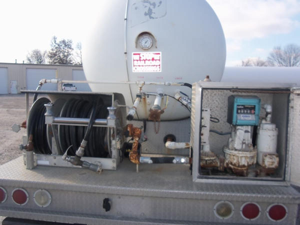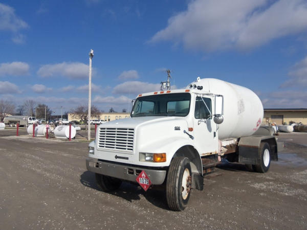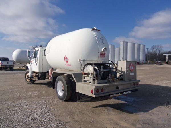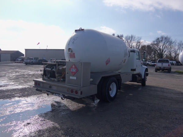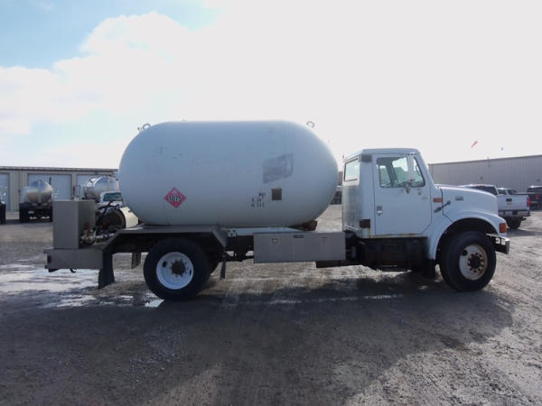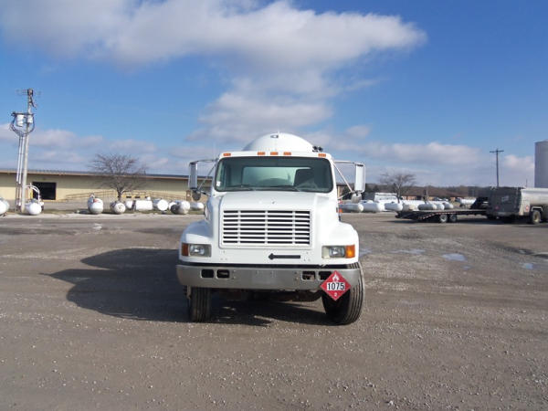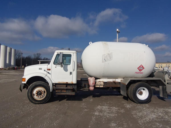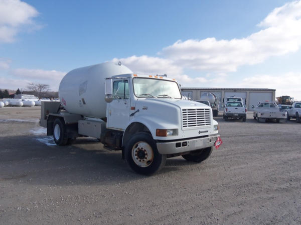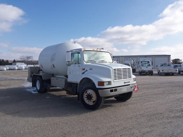 1999 International 4900 LP Truck (NP7686), DT466E diesel engine, 7 speed transmission, heat, air conditioning, Am/Fm radio, single axle, Arrow 2,800 gallon LP tank (S/N 10203, Nat'l Board #7859), Original Test Date 5-3-79, Neptune meter, hose reel, shows 171,855 miles.