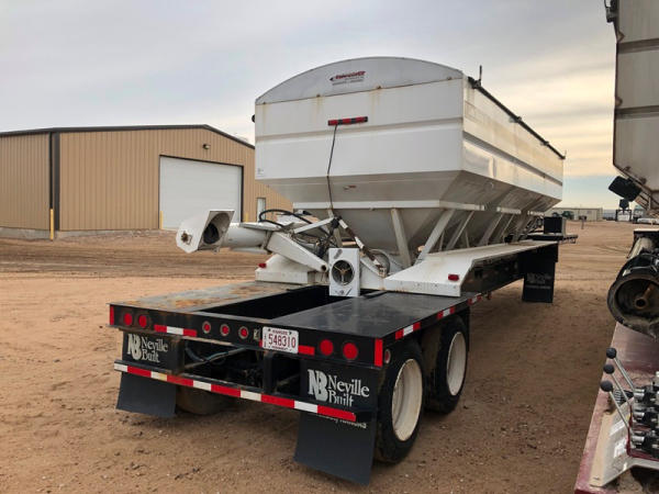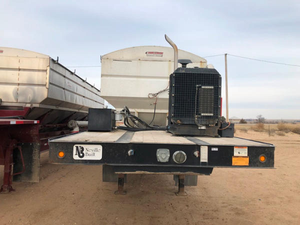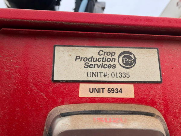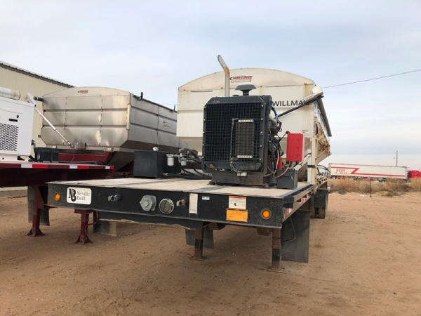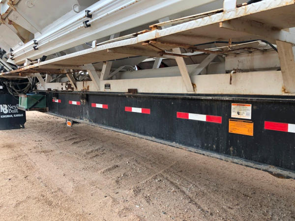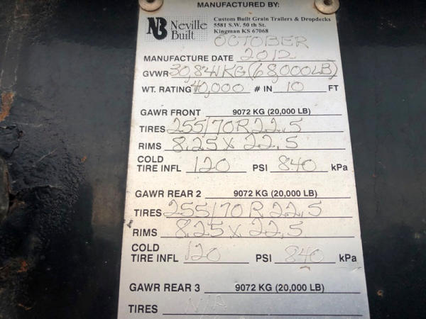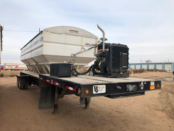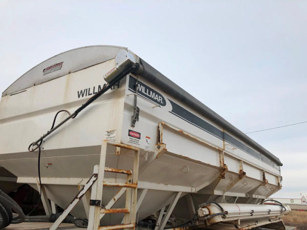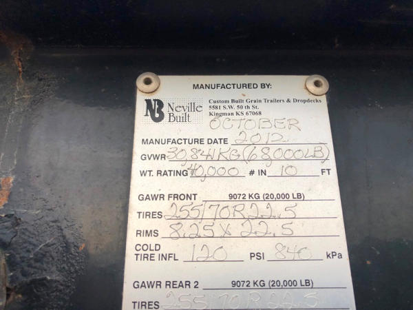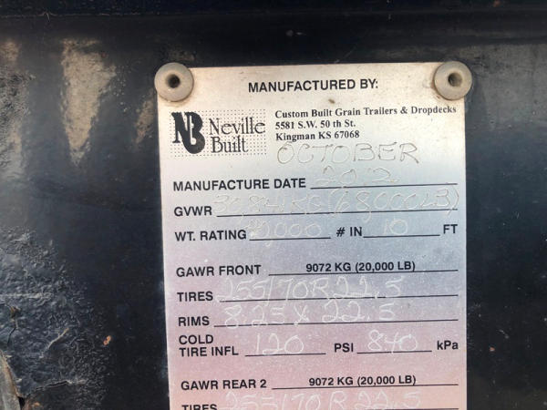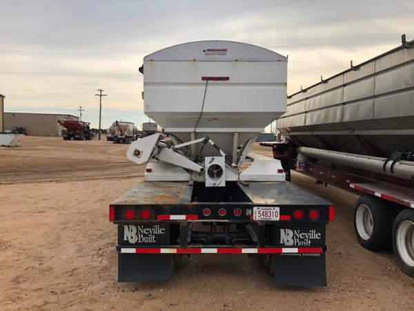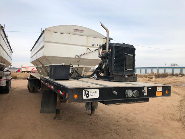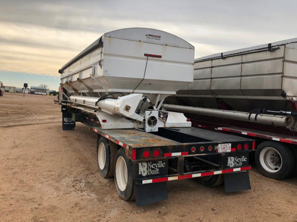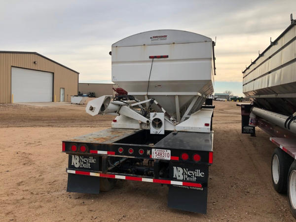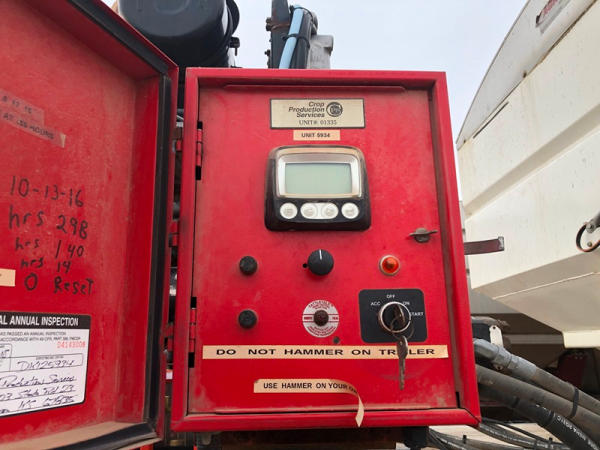 2013 Neville Built Dry Tender Trailer (NP7672, Unit 01335), Willmar Side Shooter 24 dry tender box, side discharge auger, electric roll tarp, all hydraulic, Isuzu diesel engine, electric start control panel, Neville Built sprayer trailer, tandem axle, spring suspension, 255/70R22.5 tires, GVWR 68,000 lbs.