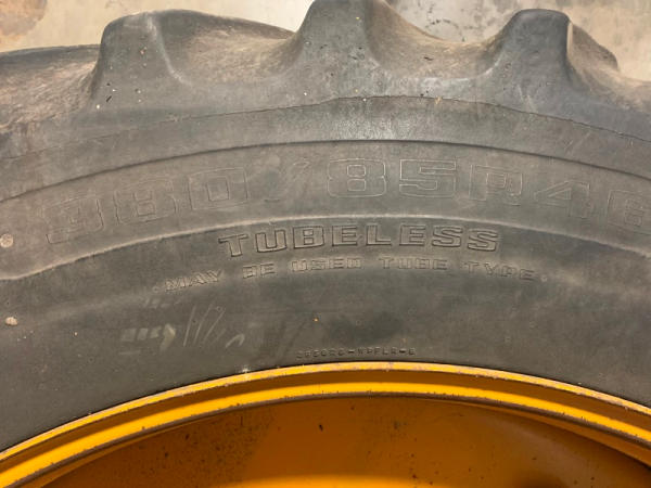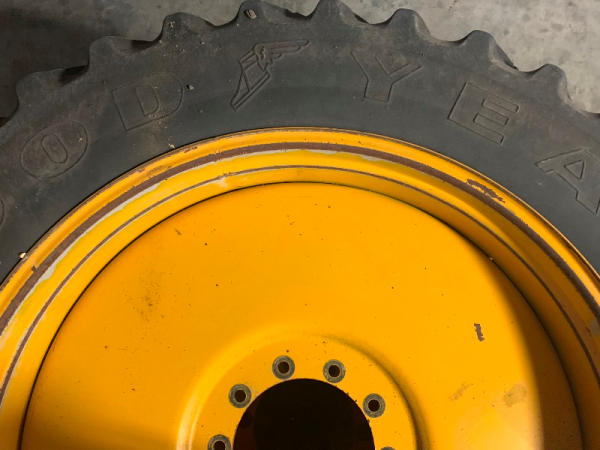 Four (4) Goodyear Row Crop Tires/Rims (KMK720), set of four (4) tires and rims, Goodyear, 380/85 R 46 tires, 10 bolt rims.