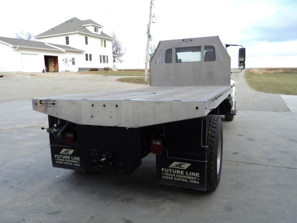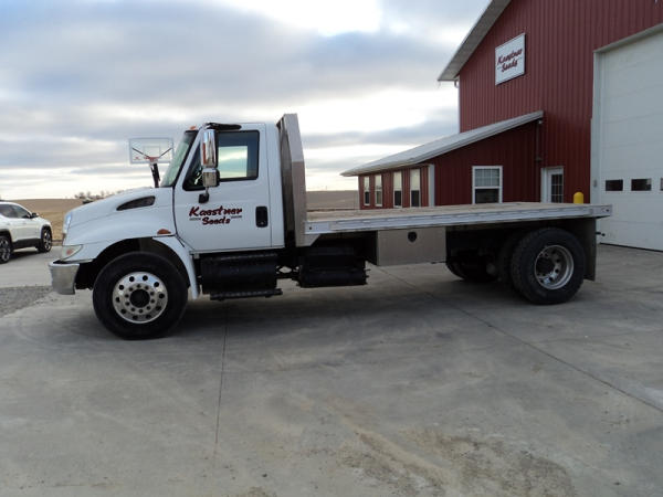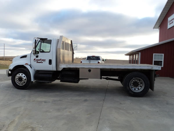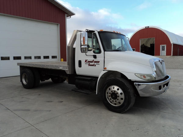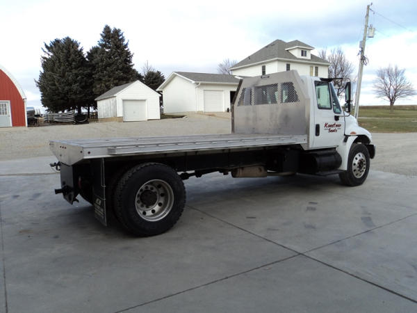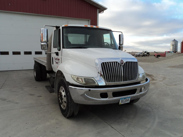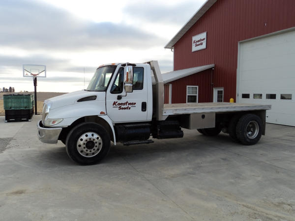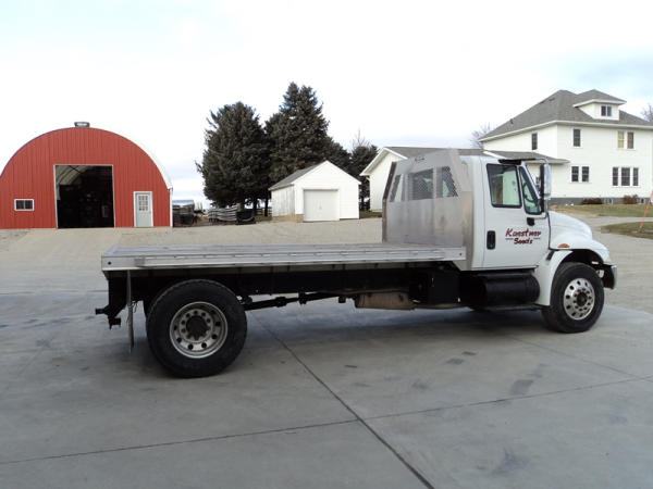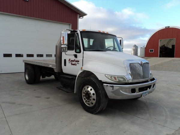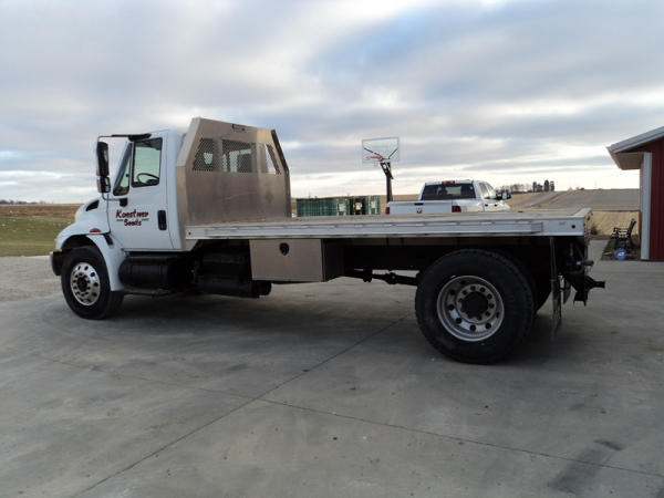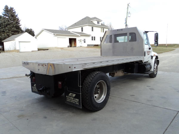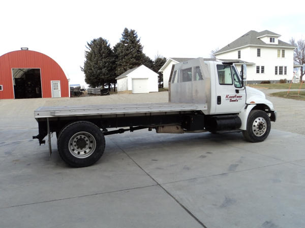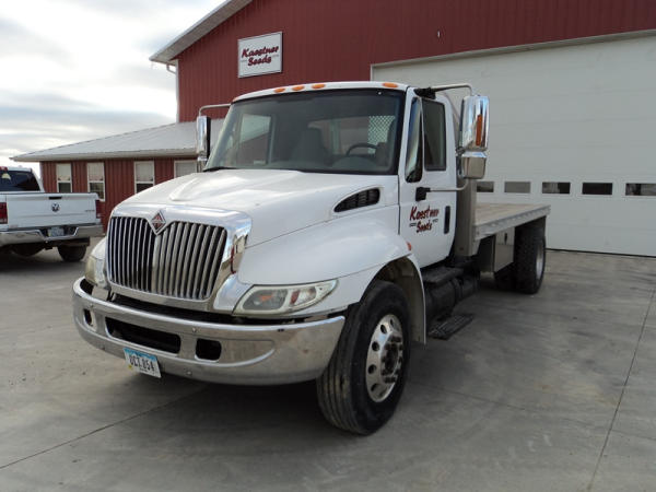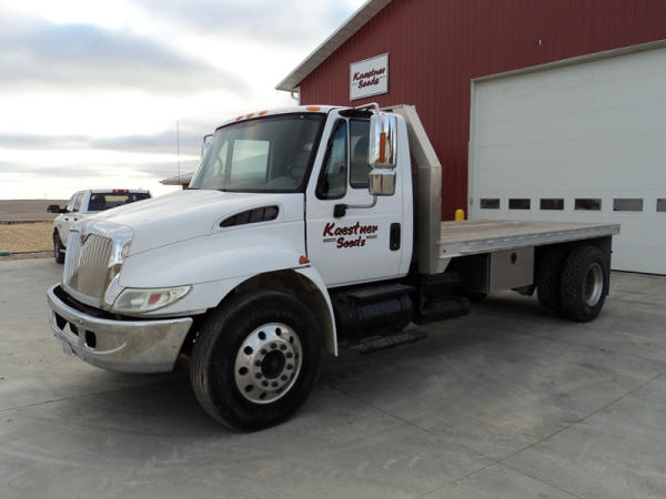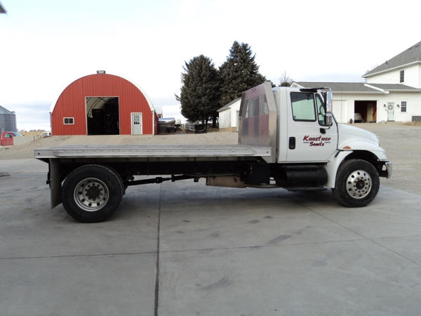 2004 IHC 4300 Flatbed Truck (PZ0896), 466 diesel engine, 6 Plus speed transmission, air conditioning, heat, Am/Fm cassette radio, cruise control, single axle, Futureline 14' aluminum flatbed, headache rack, wood floor, 5th wheel ball, rear port hydraulics, 11R22.5 tires, shows 165,947 miles.