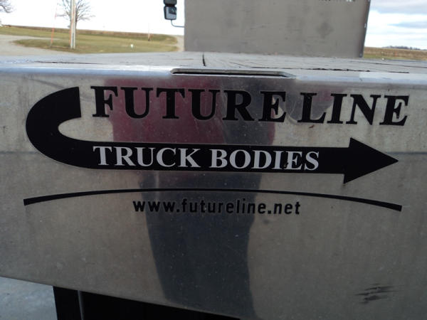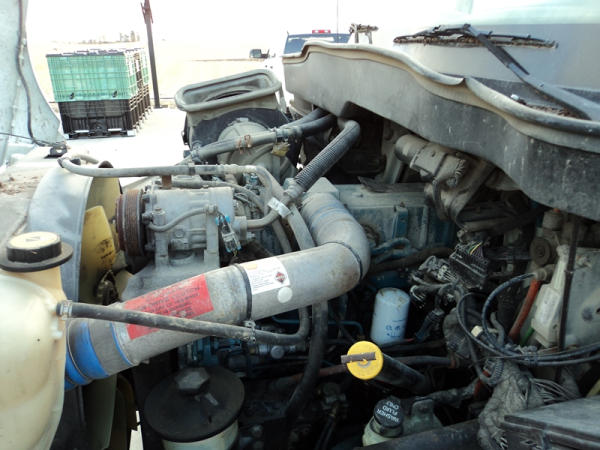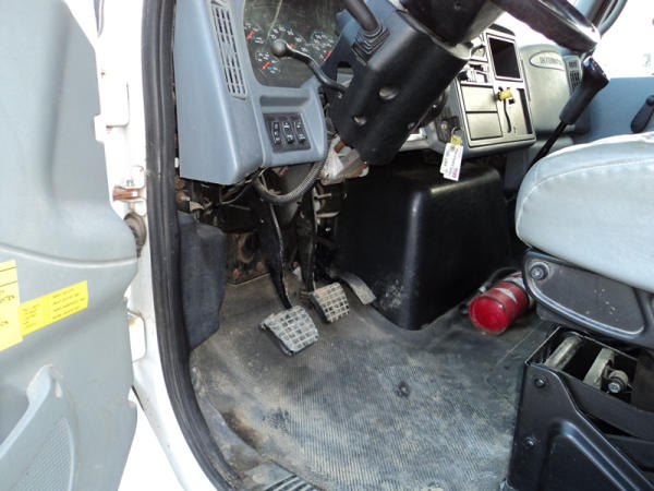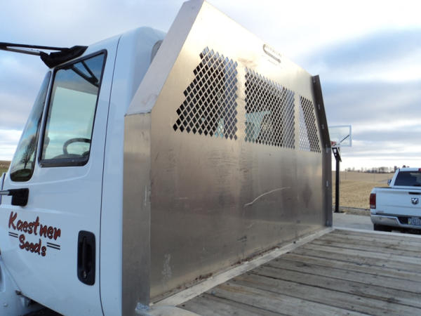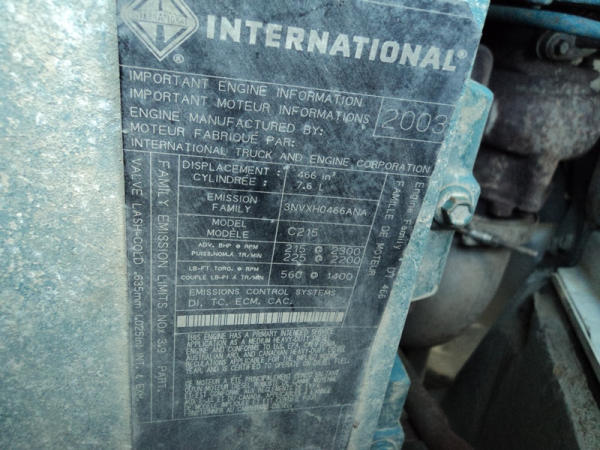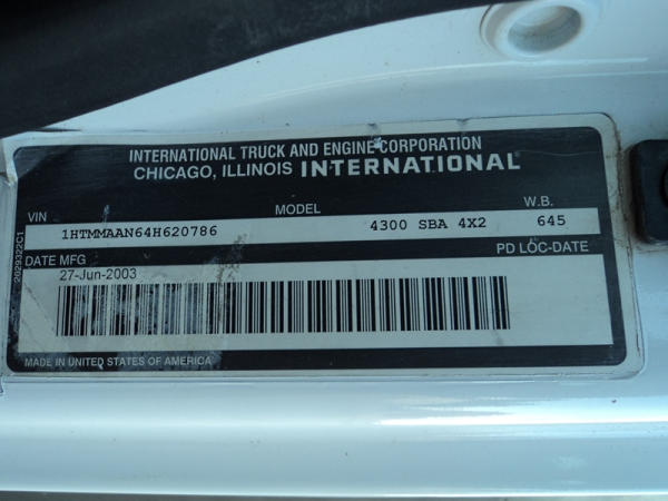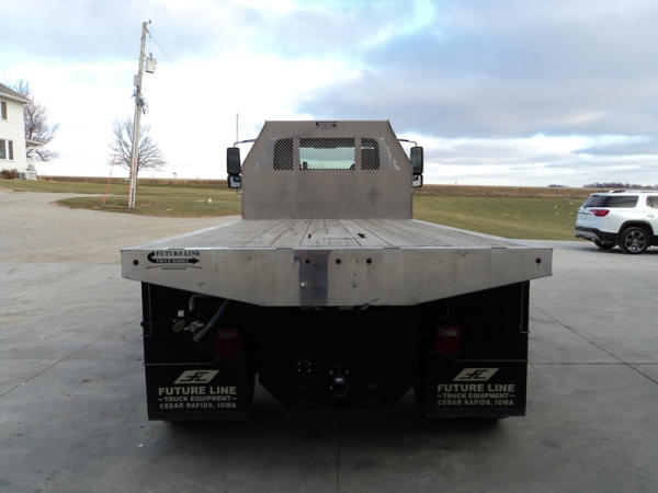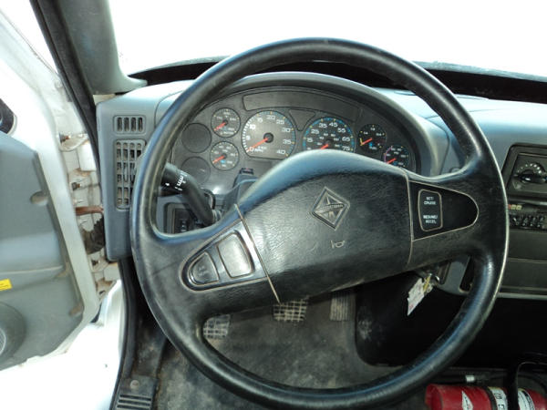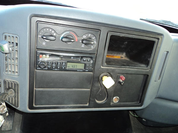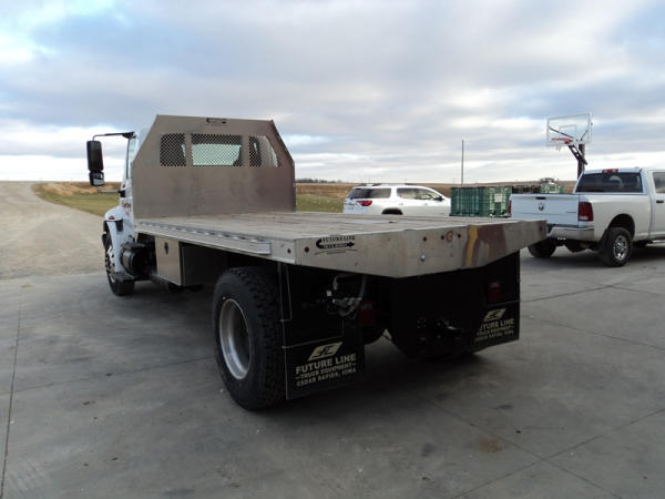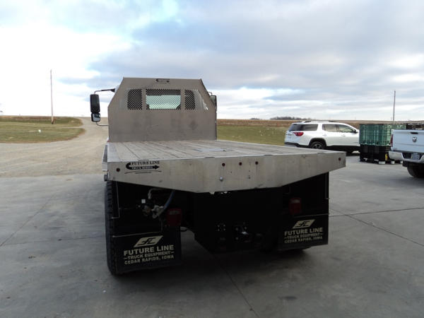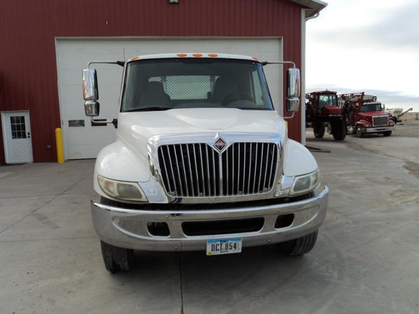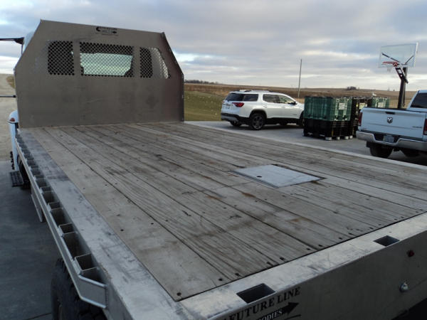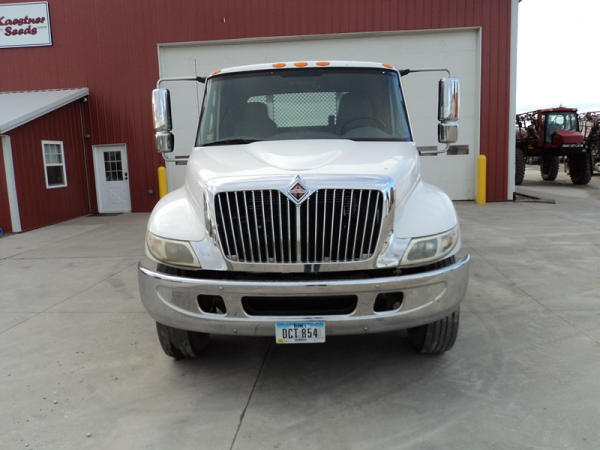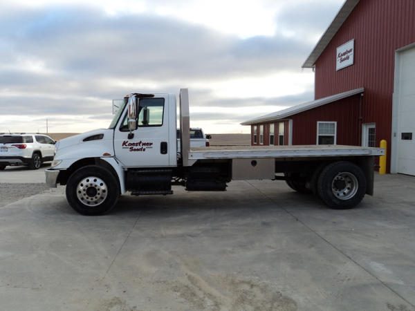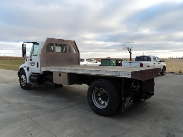 2004 IHC 4300 Flatbed Truck (PZ0896), 466 diesel engine, 6 Plus speed transmission, air conditioning, heat, Am/Fm cassette radio, cruise control, single axle, Futureline 14' aluminum flatbed, headache rack, wood floor, 5th wheel ball, rear port hydraulics, 11R22.5 tires, shows 165,947 miles.