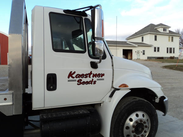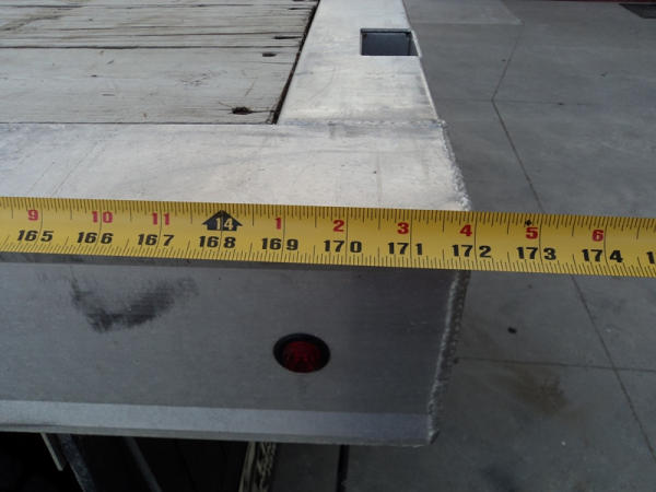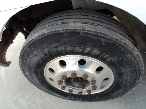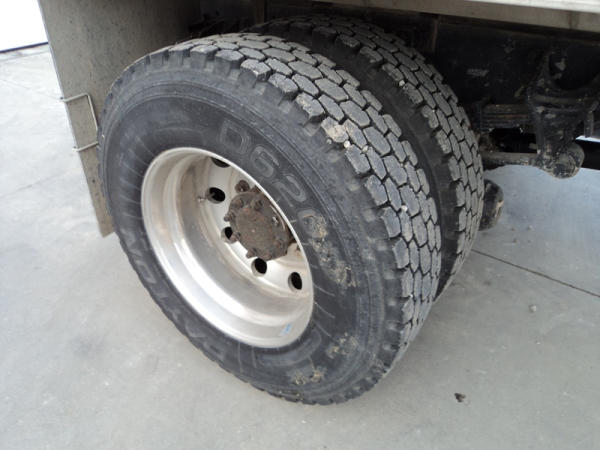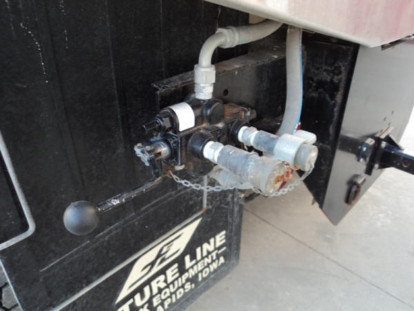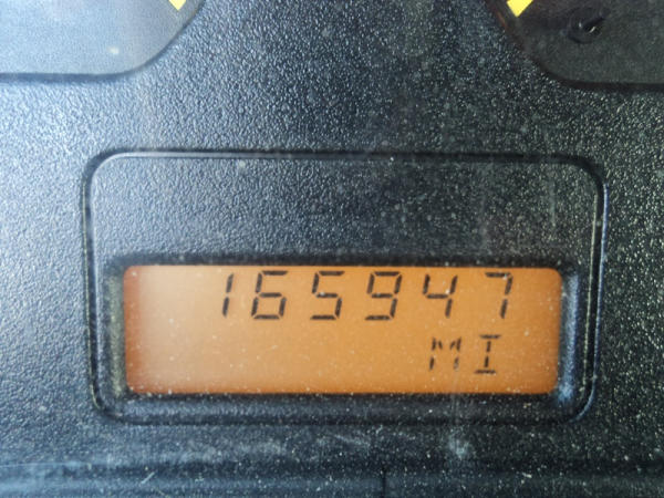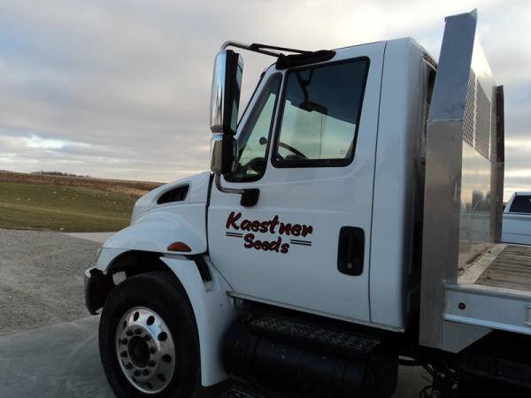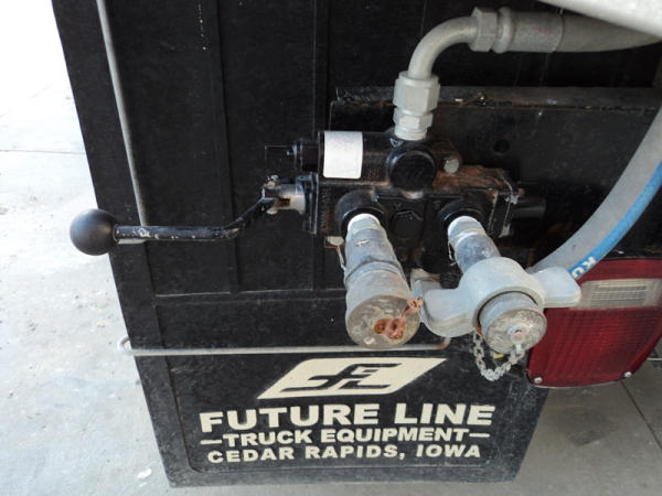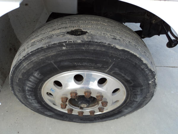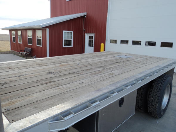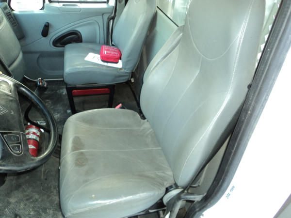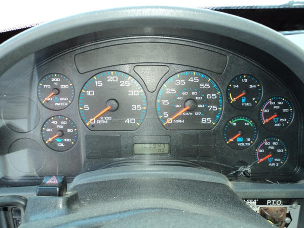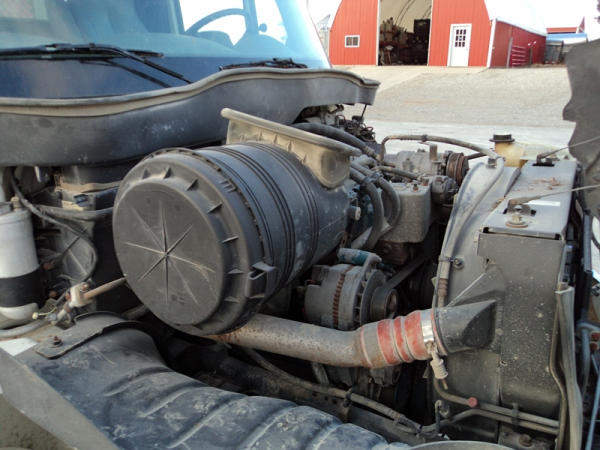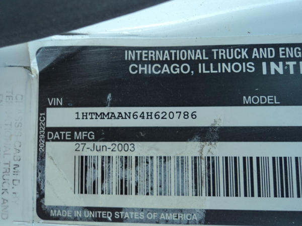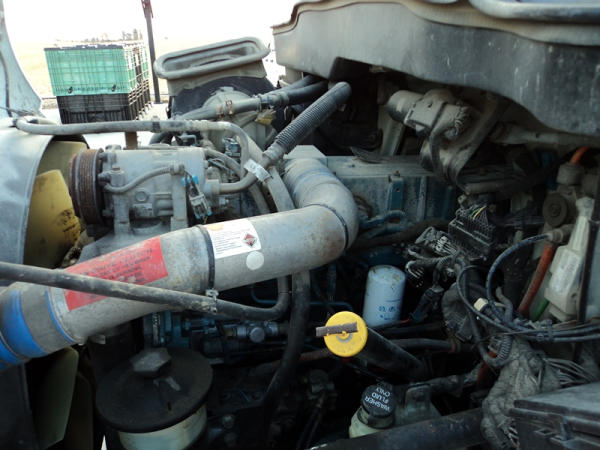 2004 IHC 4300 Flatbed Truck (PZ0896), 466 diesel engine, 6 Plus speed transmission, air conditioning, heat, Am/Fm cassette radio, cruise control, single axle, Futureline 14' aluminum flatbed, headache rack, wood floor, 5th wheel ball, rear port hydraulics, 11R22.5 tires, shows 165,947 miles.