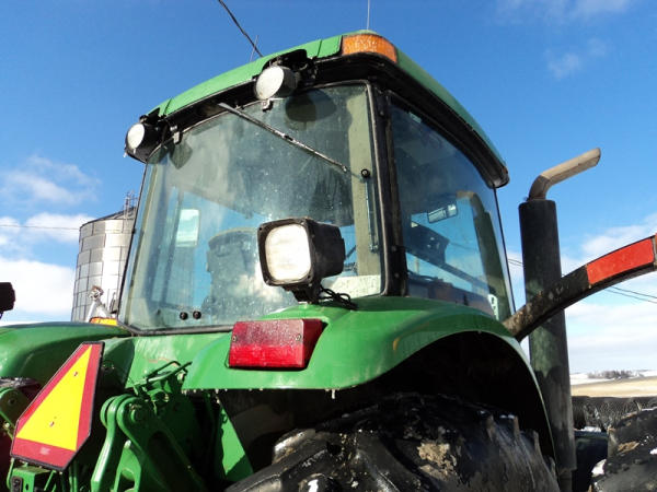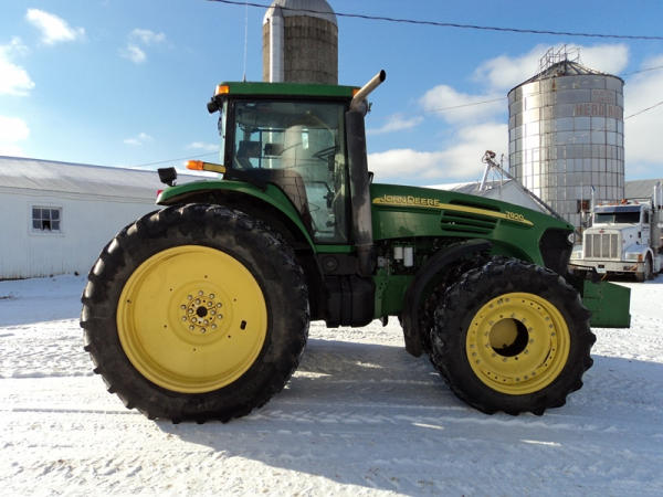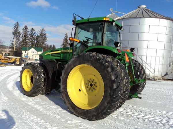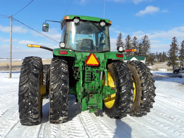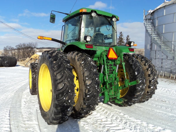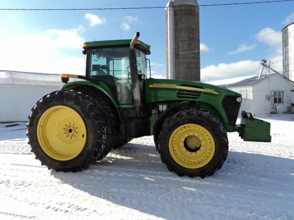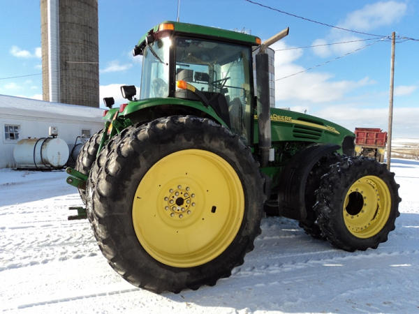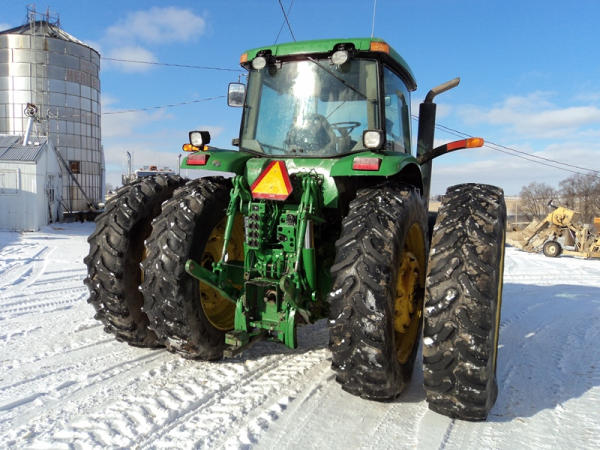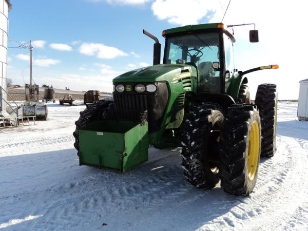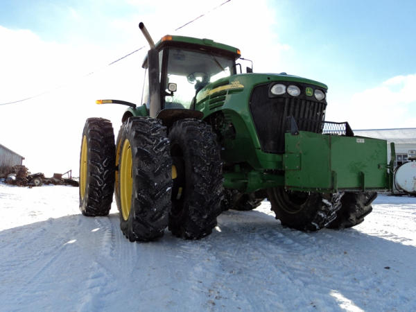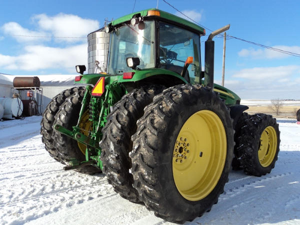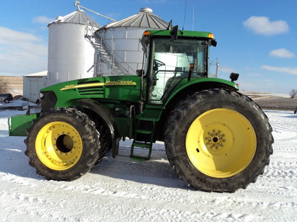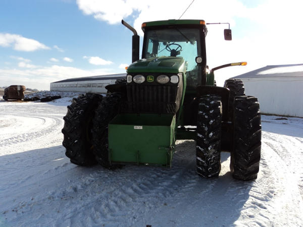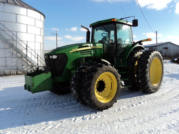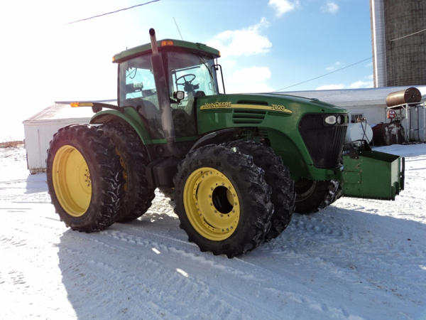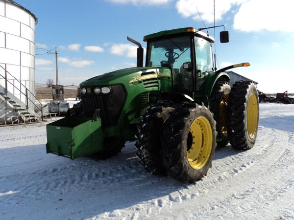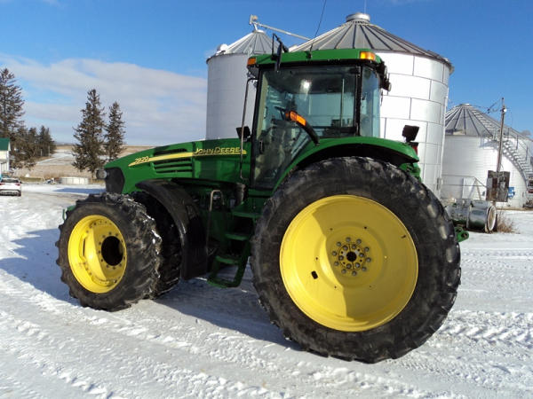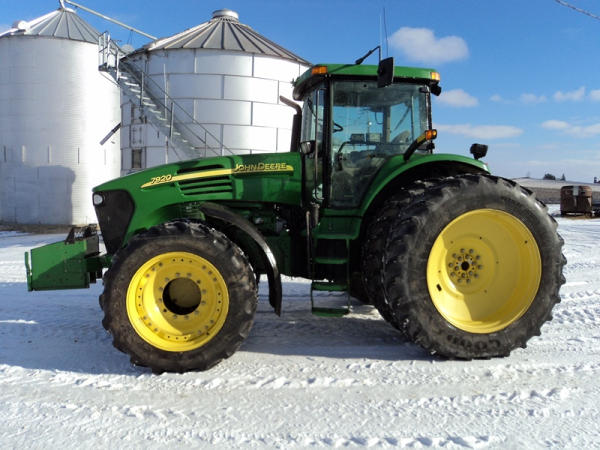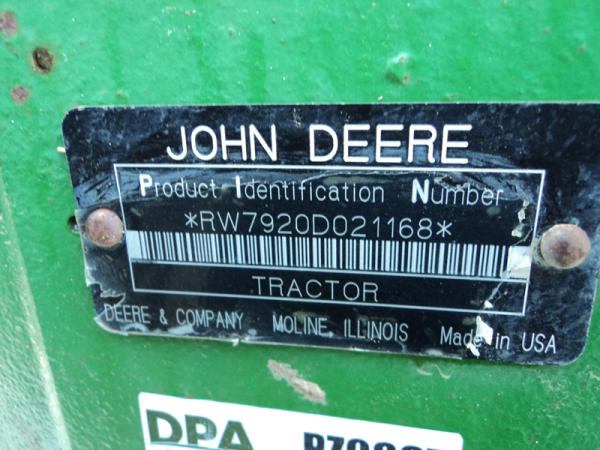 2004 John Deere 7920 MFWD Tractor (PZ0887) John Deere diesel engine (S/N RG6081H255290), IVT transmission, air conditioning, heat, Am/Fm CD stereo, PTO, 4 port hydraulics, Good Year 380/85R34 front dual tires, Good Year 480/80R46 rear dual tires, shows 8508 hours.