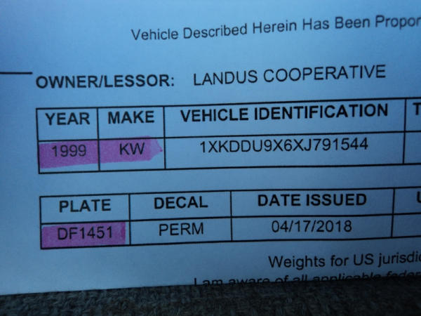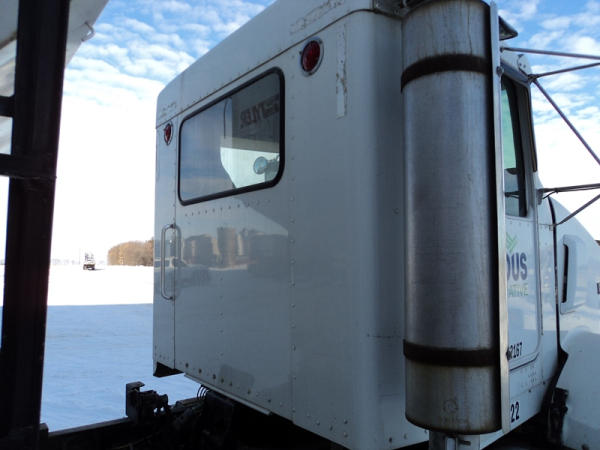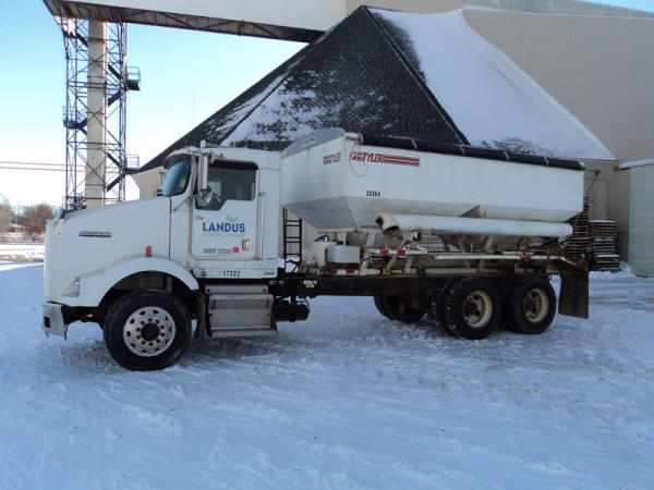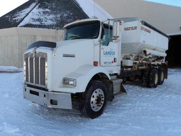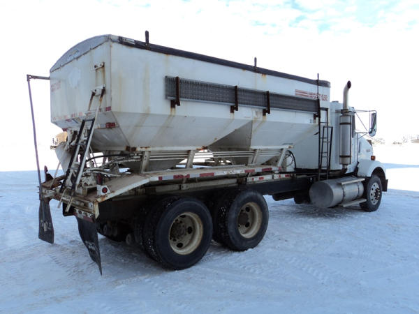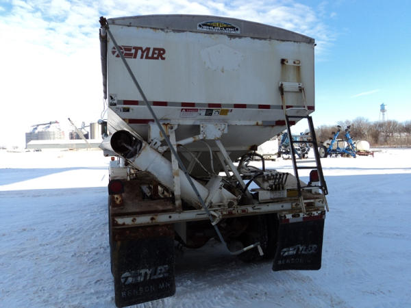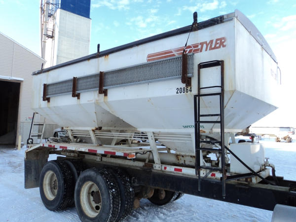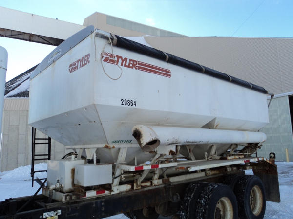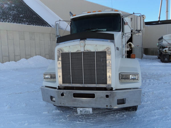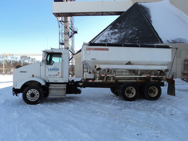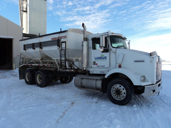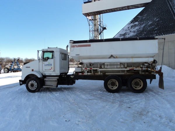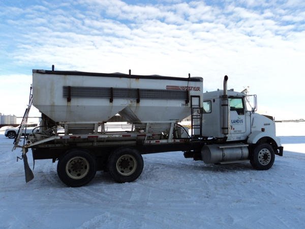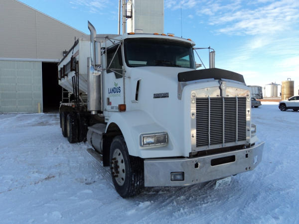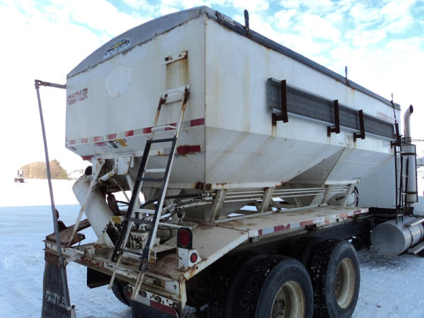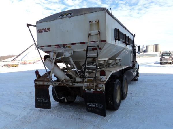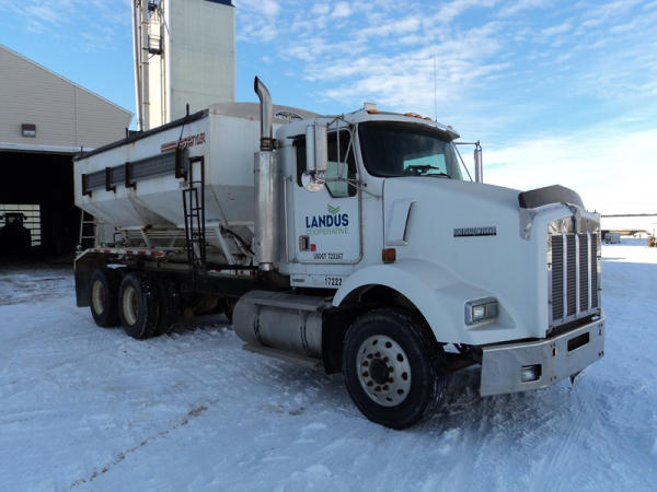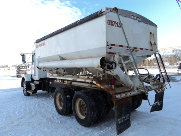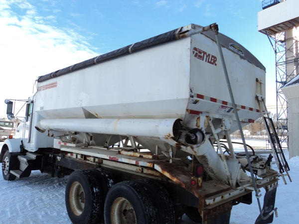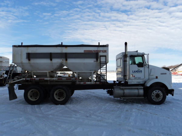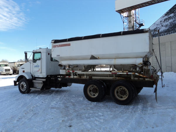 1999 Kenworth Dry Tender Truck (PZ0879, Unit 17222/20864), Cat C-12 diesel engine, 10 speed transmission, air conditioning, heat, engine brake, tandem axle, full screw, air ride suspension, Tyler 16 ton dry tender box, side discharge auger, all hydraulic, roll over tarp, 295/75R22.5 tires, shows 361,479 miles.