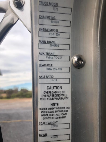 2014 Kenworth T370 Liquid Floater (NP7468), Paccar PX-9 8.9L diesel engine, Allison 6 speed automatic transmission, heat, air conditioning, Am/Fm radio, Precision 950 gallon stainless steel liquid system, 60' boom, foam marker, foam marker tank, rinse tank, stainless steel chemical inductor, Aux. Trans. Fabco TC-237, Rear Axle DANA S26-190, Axle Radio 6.14, GVWR 41,220, 385/85R34 rear tires, 385/85R34 front tires, Raven Viper Pro, GPS, shows 1,942 hours, shows 31,453 miles.