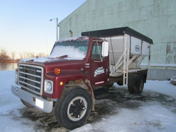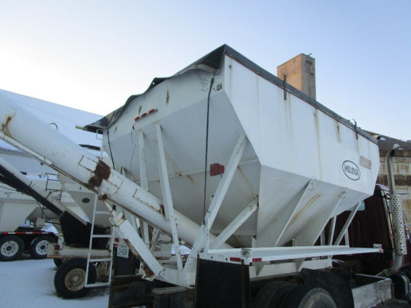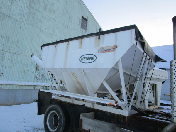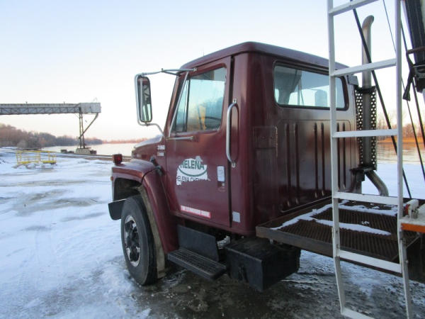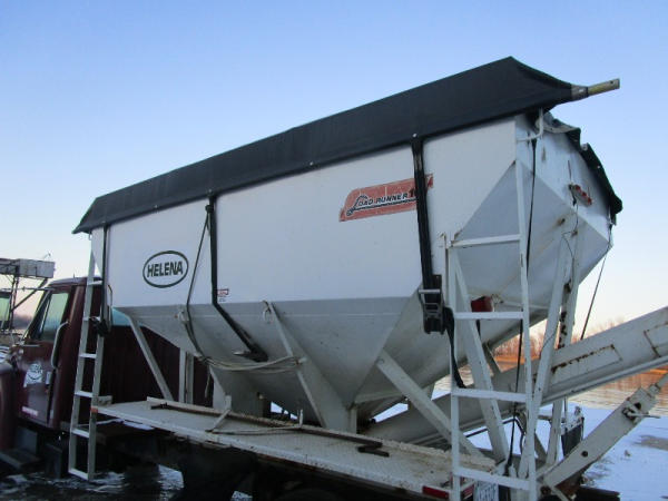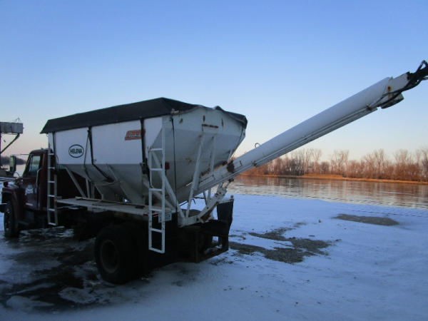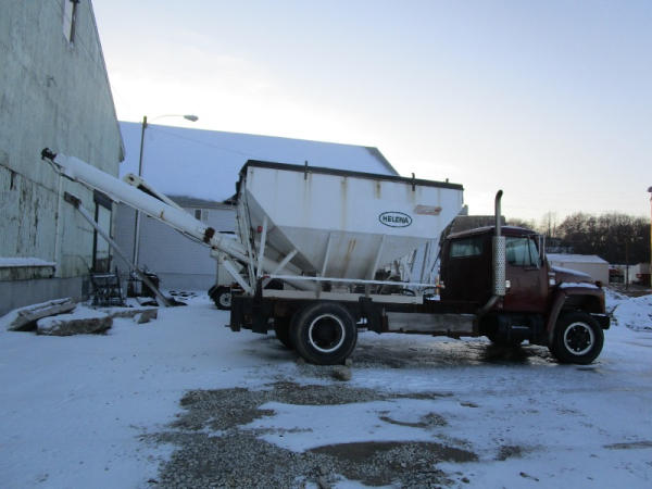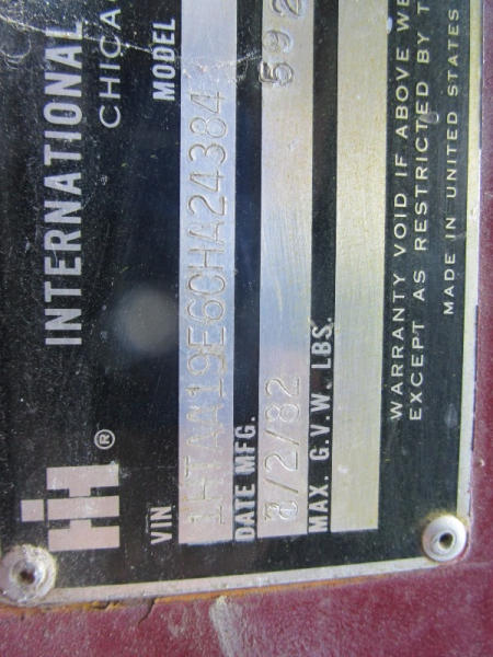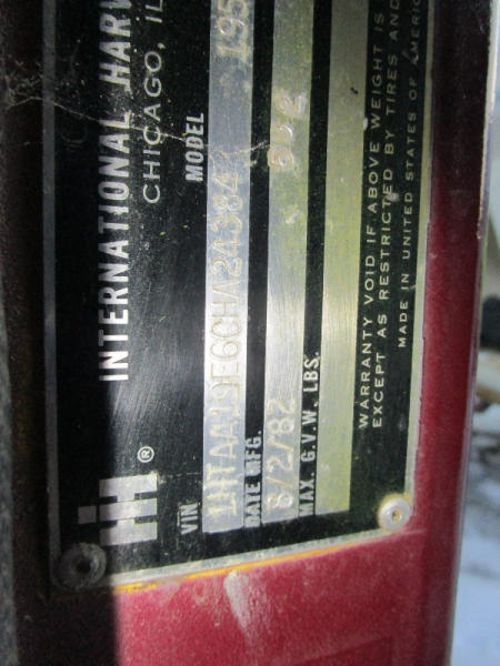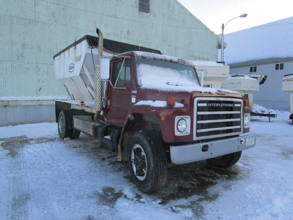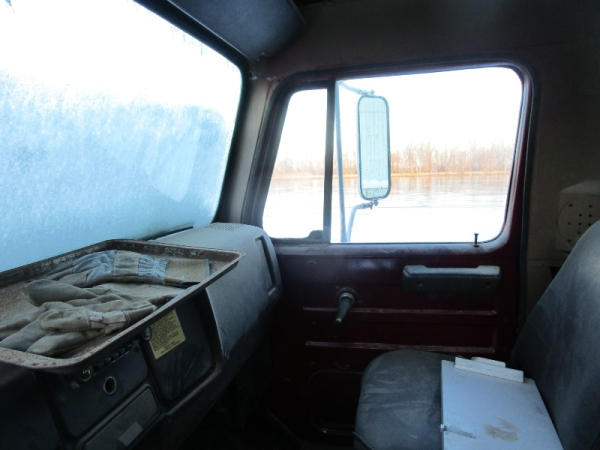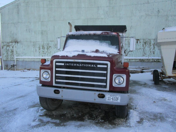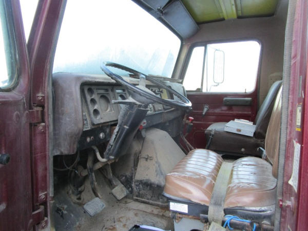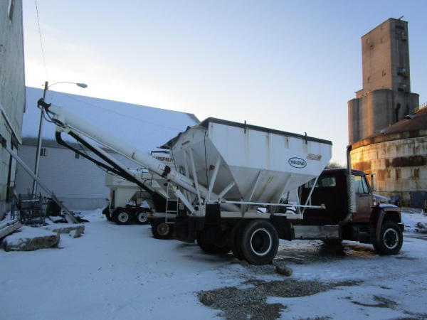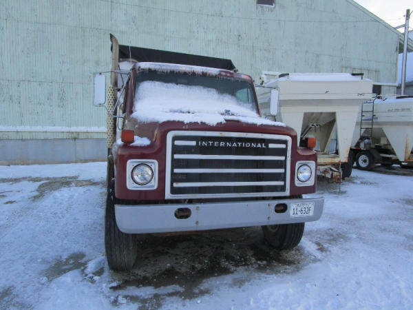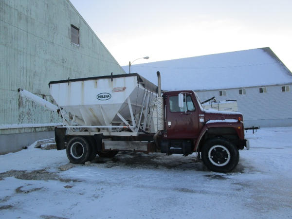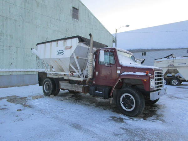 1982 International S Series (DR1025 Unit 31860), DT466 diesel engine,5 speed transmission, 2 speed rear end, single axle, Willmar Load Runner 10, 10 ton stainless steel hydraulic dry tender box, rear auger, manual tarp, shows 176,265 miles.