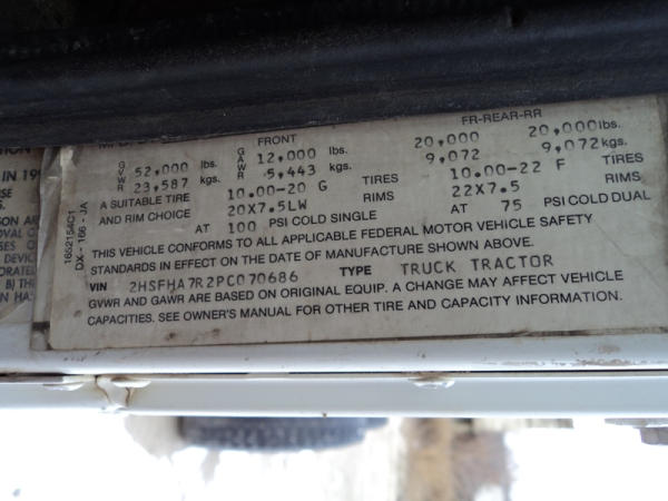 1993 IHC Eagle Truck (PZ0907, Unit 648), L10 Cummins diesel engine, SD-PS-9N transmission, air conditioning, heat, Am/Fm cassette radio, cruise control, engine brake, tandem axle, full screw, air ride suspension, 295/75R22.5 tires, aluminum rims, shows 325,141 miles.