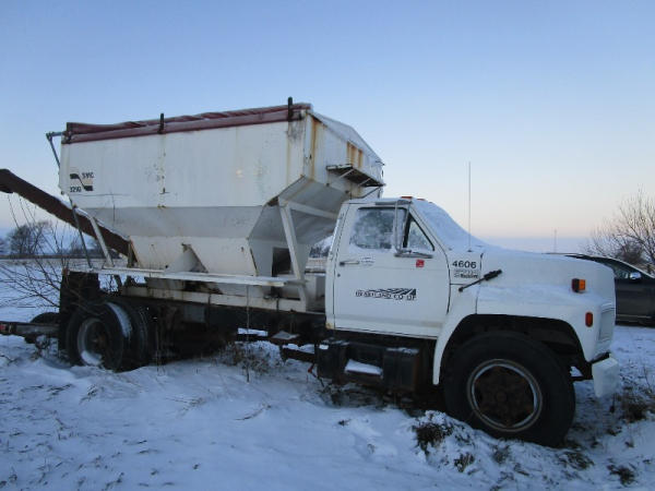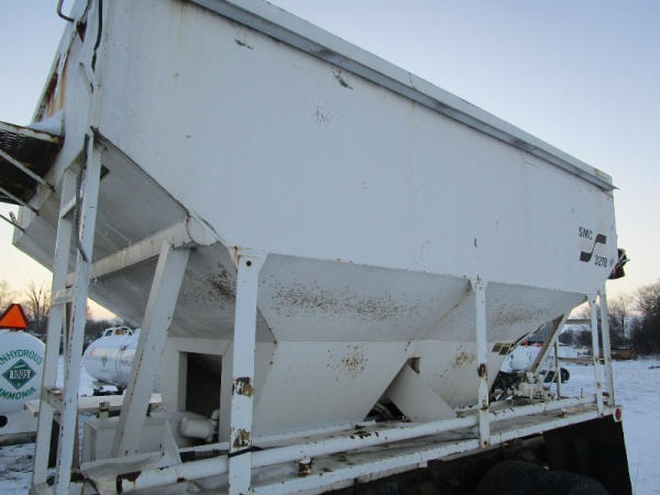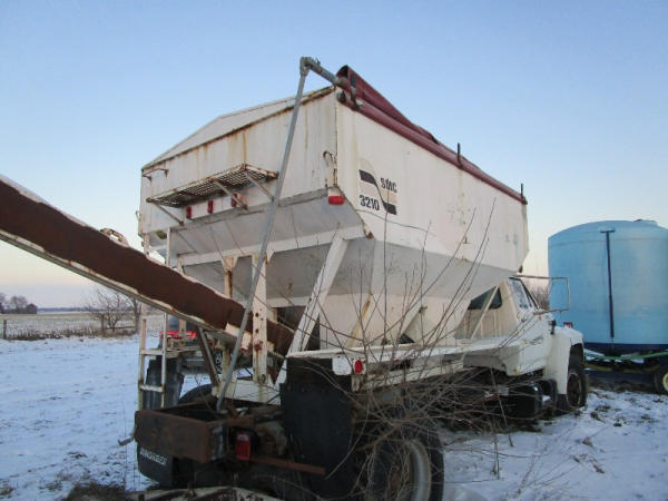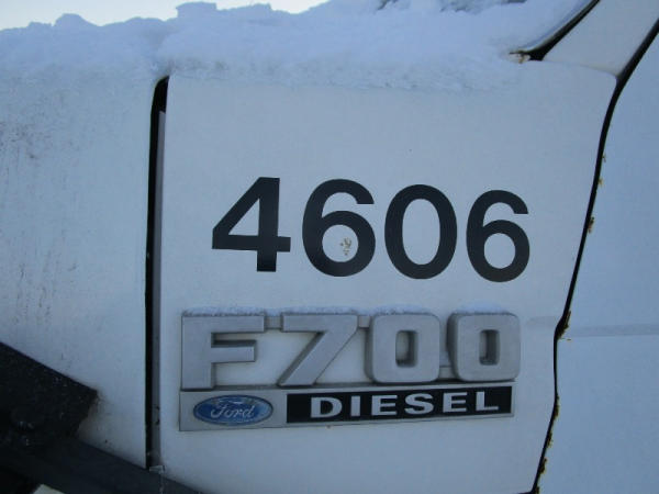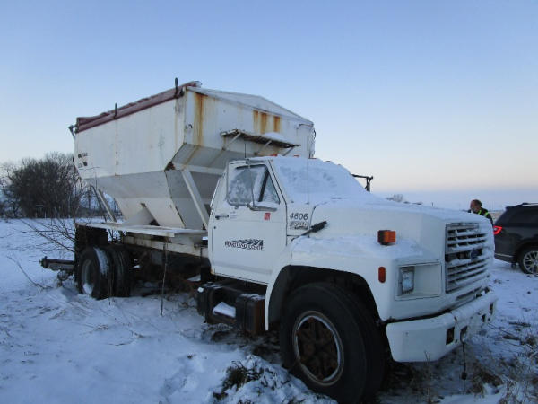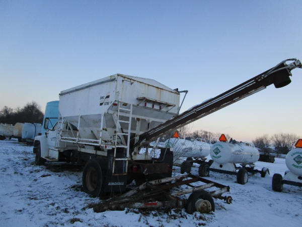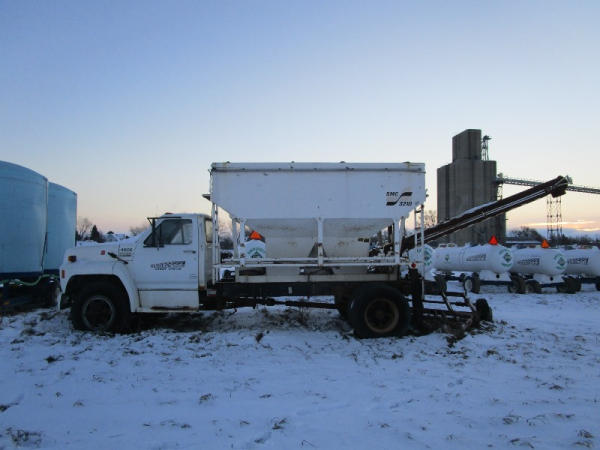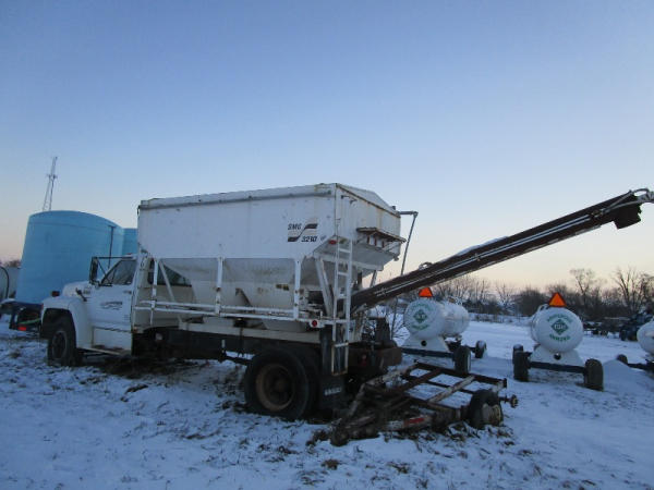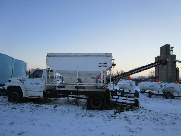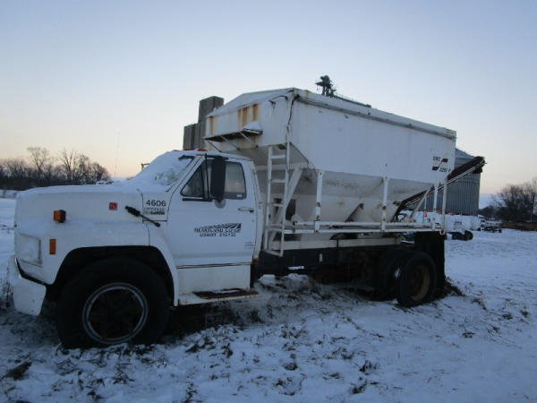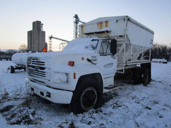 1994 Ford F700 (DR1005 Unit 4606), diesel engine, 6 speed transmission, single axle, Simonsen 3210 hydraulic stainless steel dry tender box, rear auger, roll over tarp, 22.5 tires, shows 194,211 miles.