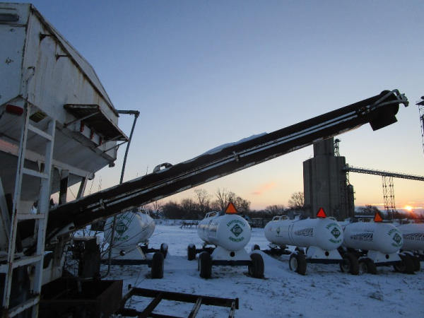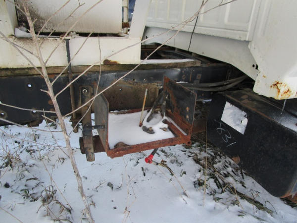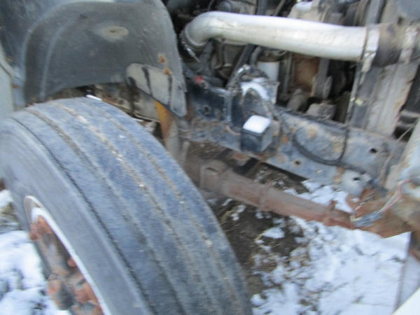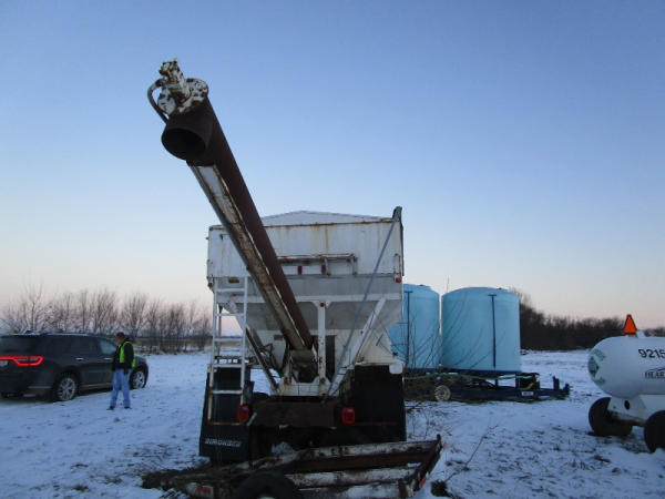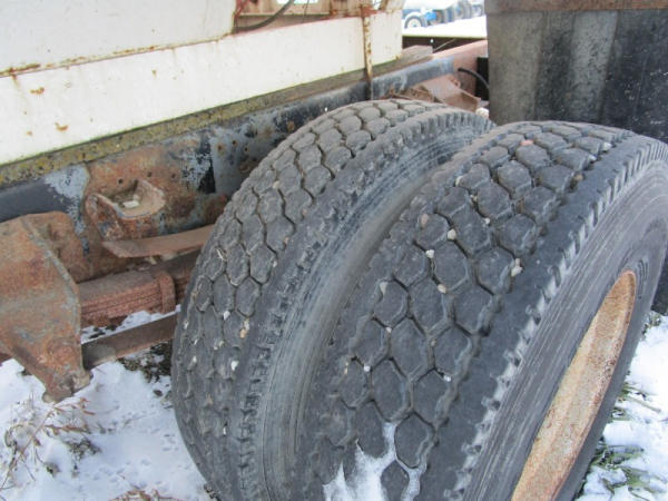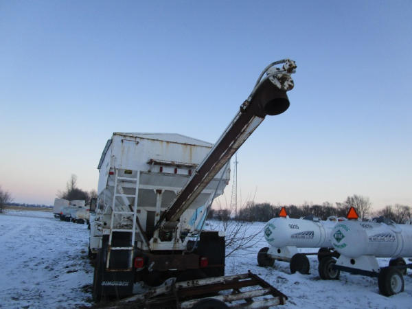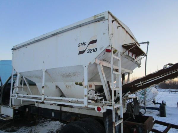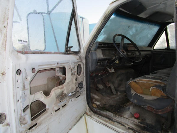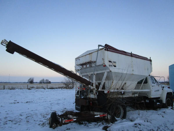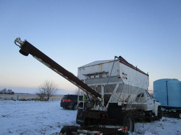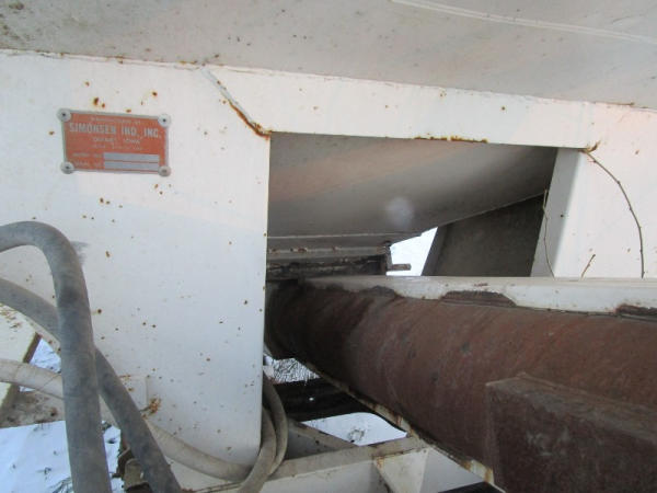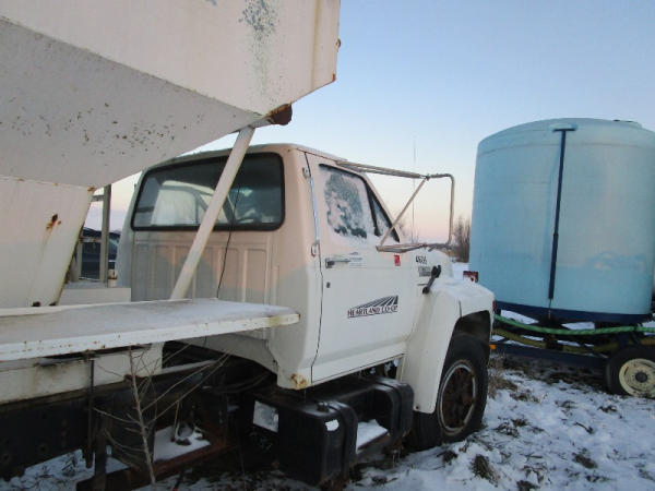 1994 Ford F700 (DR1005 Unit 4606), diesel engine, 6 speed transmission, single axle, Simonsen 3210 hydraulic stainless steel dry tender box, rear auger, roll over tarp, 22.5 tires, shows 194,211 miles.