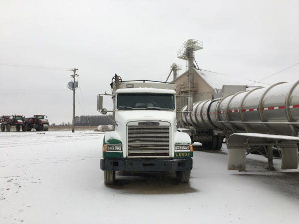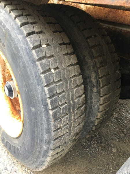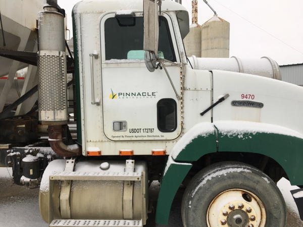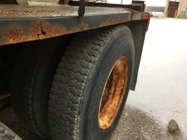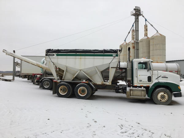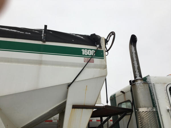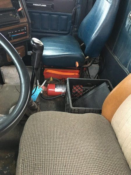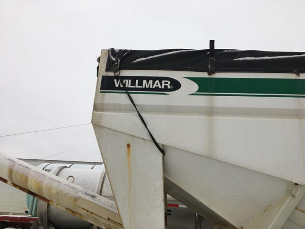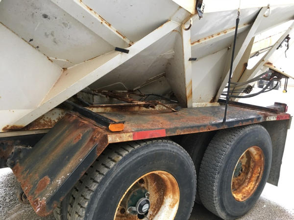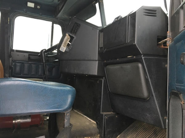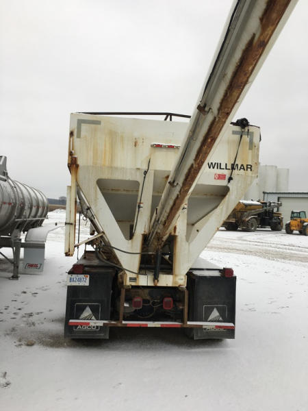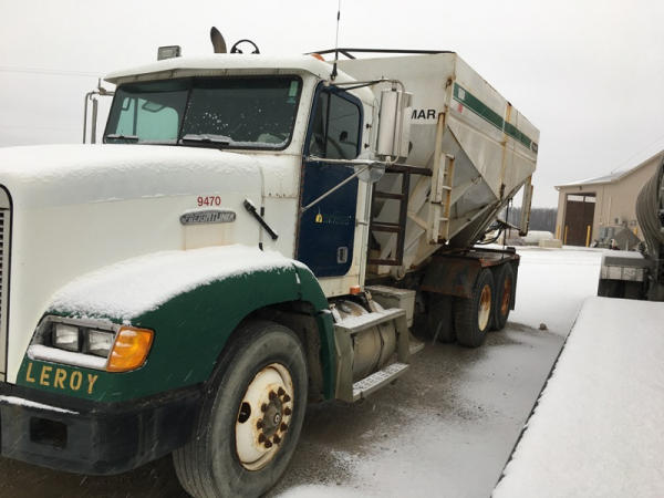 1991 Freightliner (DR1033 Unit 9470), diesel engine, 10 speed transmission, tandem axle full screw, air ride suspension, Willmar 1600 hydraulic stainless steel dry fertilizer tender box, rear auger, manual roll tarp, dual aluminum fuel tanks, air conditioning, shows 205,554 miles.