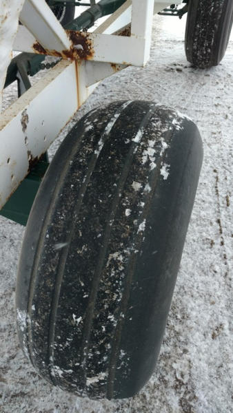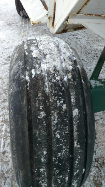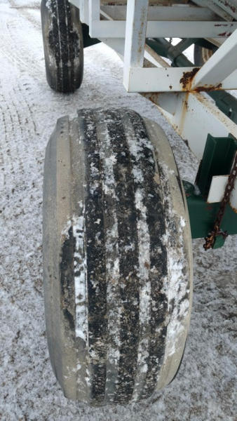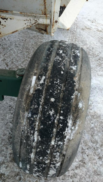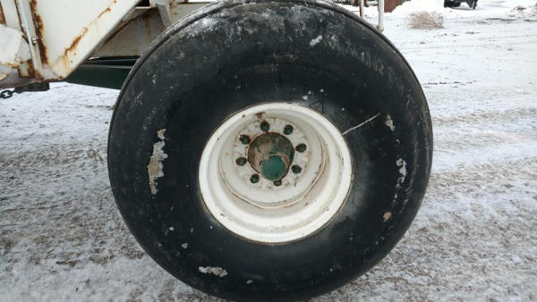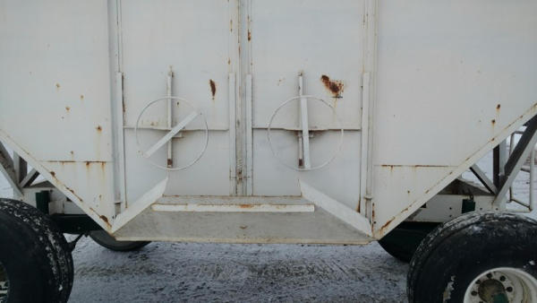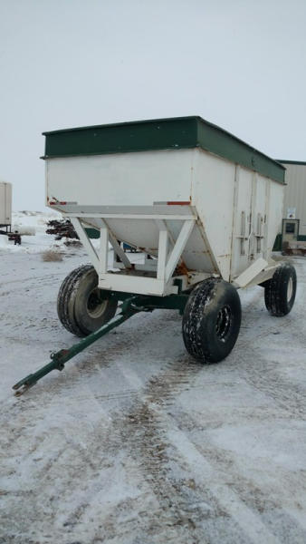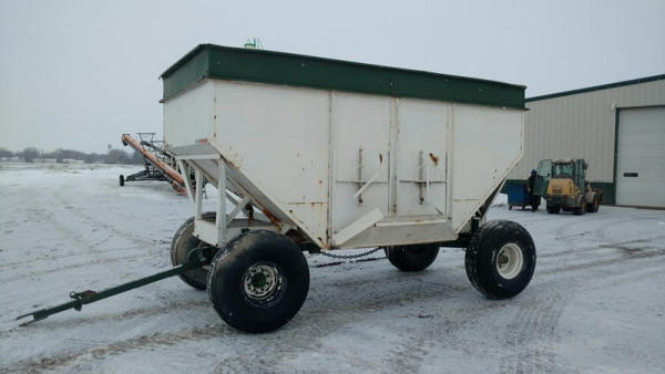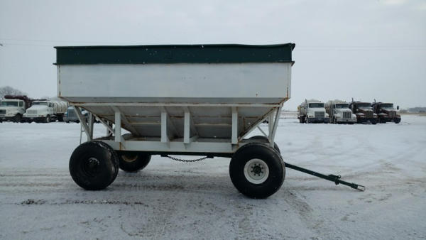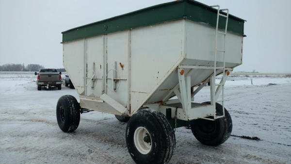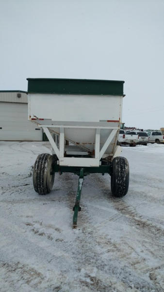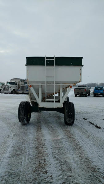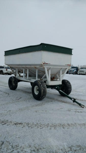 M & W Gravity Wagon (AL556), approximately 350-400 bushels, 16.5-16.1 tires, 2 doors, 2 hoppers.