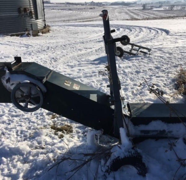 GrainWay Auger Underbin Belt (LD104), electric or hydraulic, used for seed beans and corn, portable belt with wheels that rolls under bins for gentle handling, fits under bins up to 30', model has an incline for clearance on the end, wheels come off easily and can be permanent. There is NO MOTOR included but requires a 5-7.5 HP motor